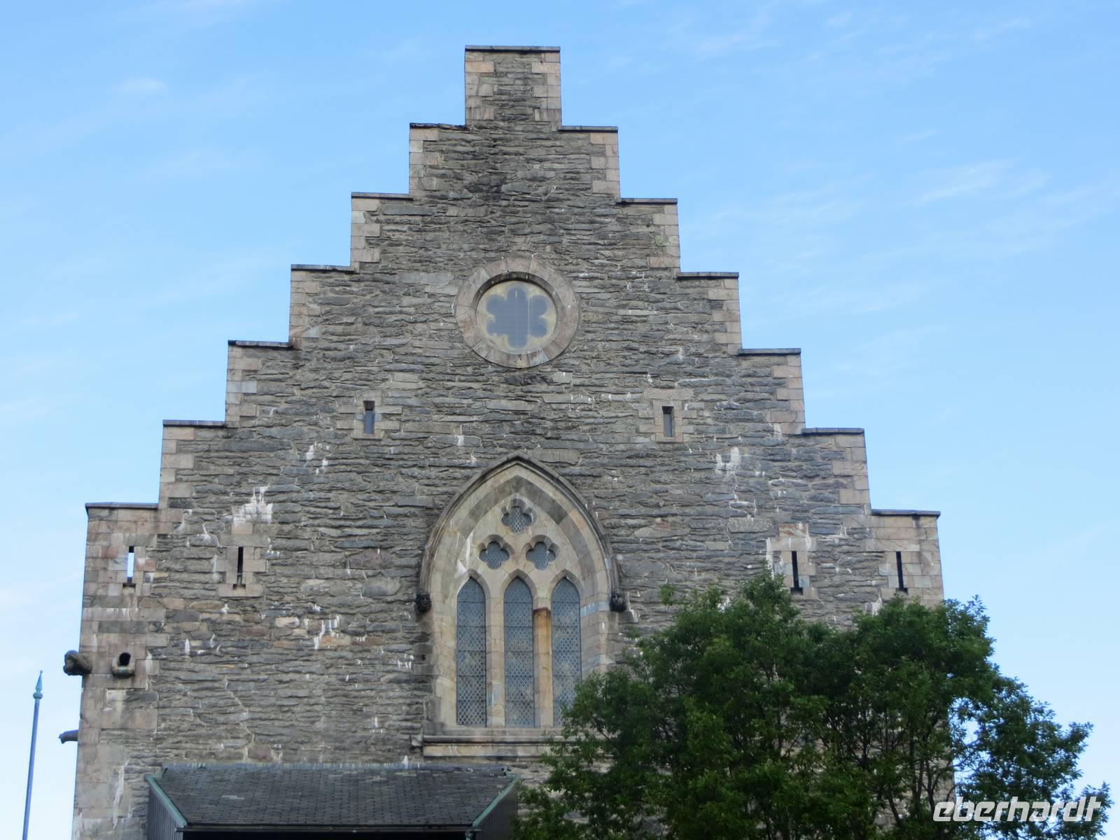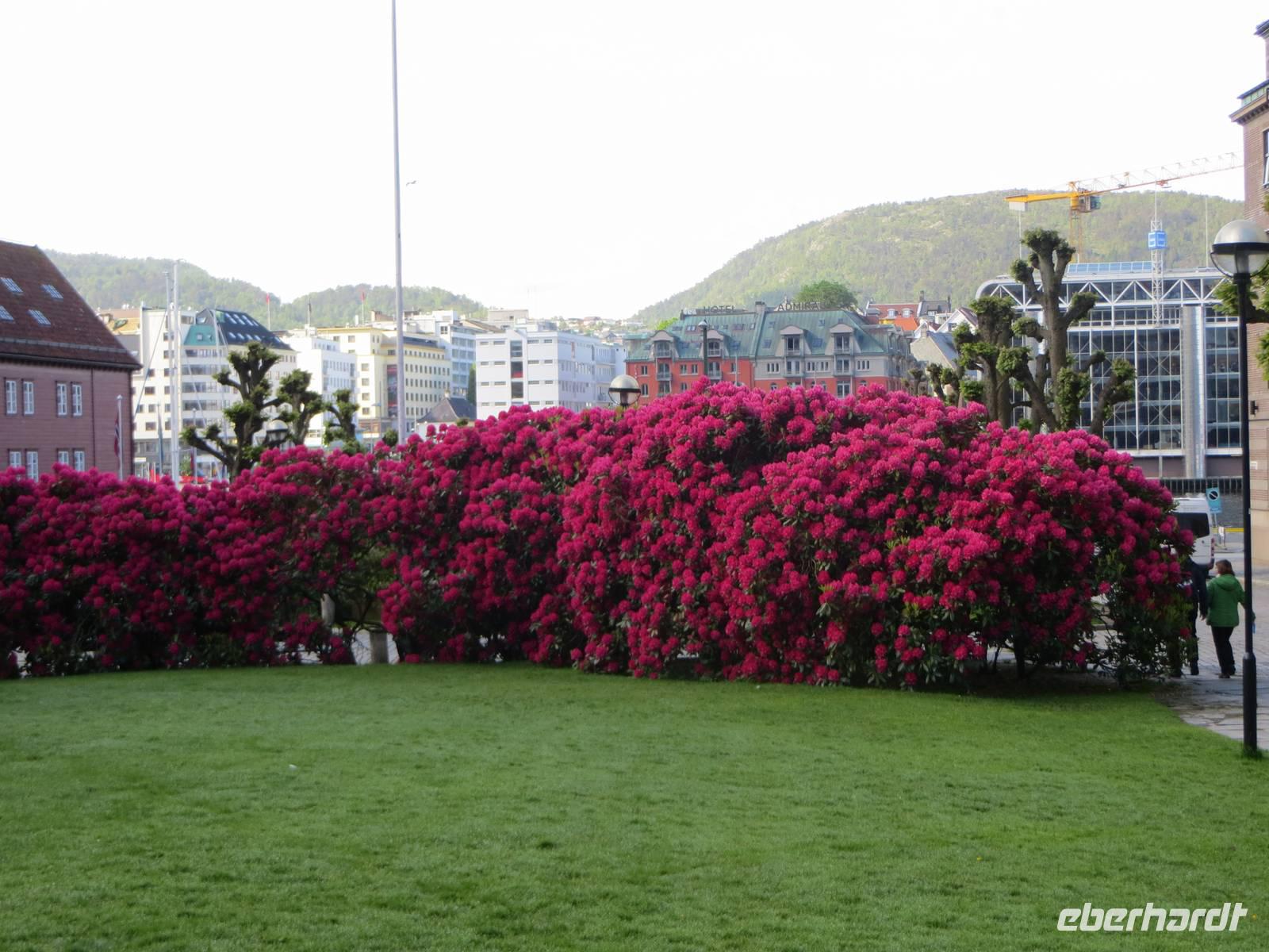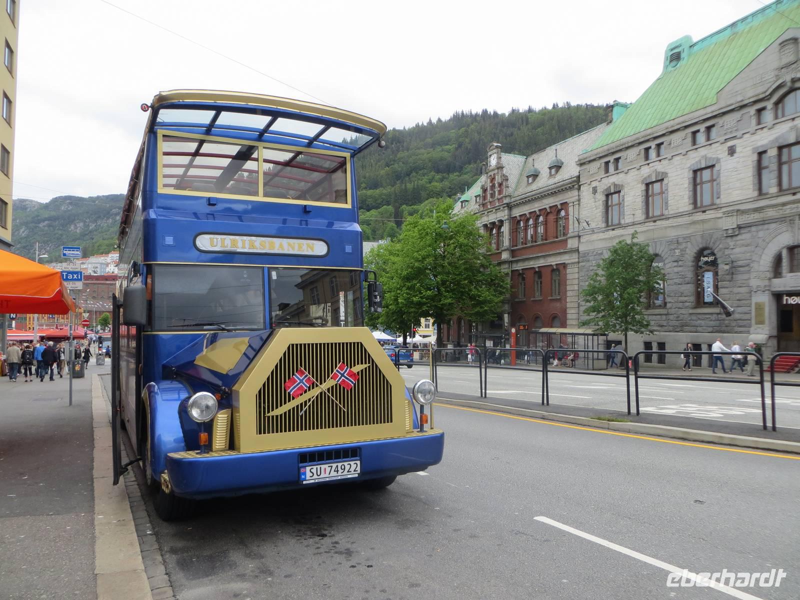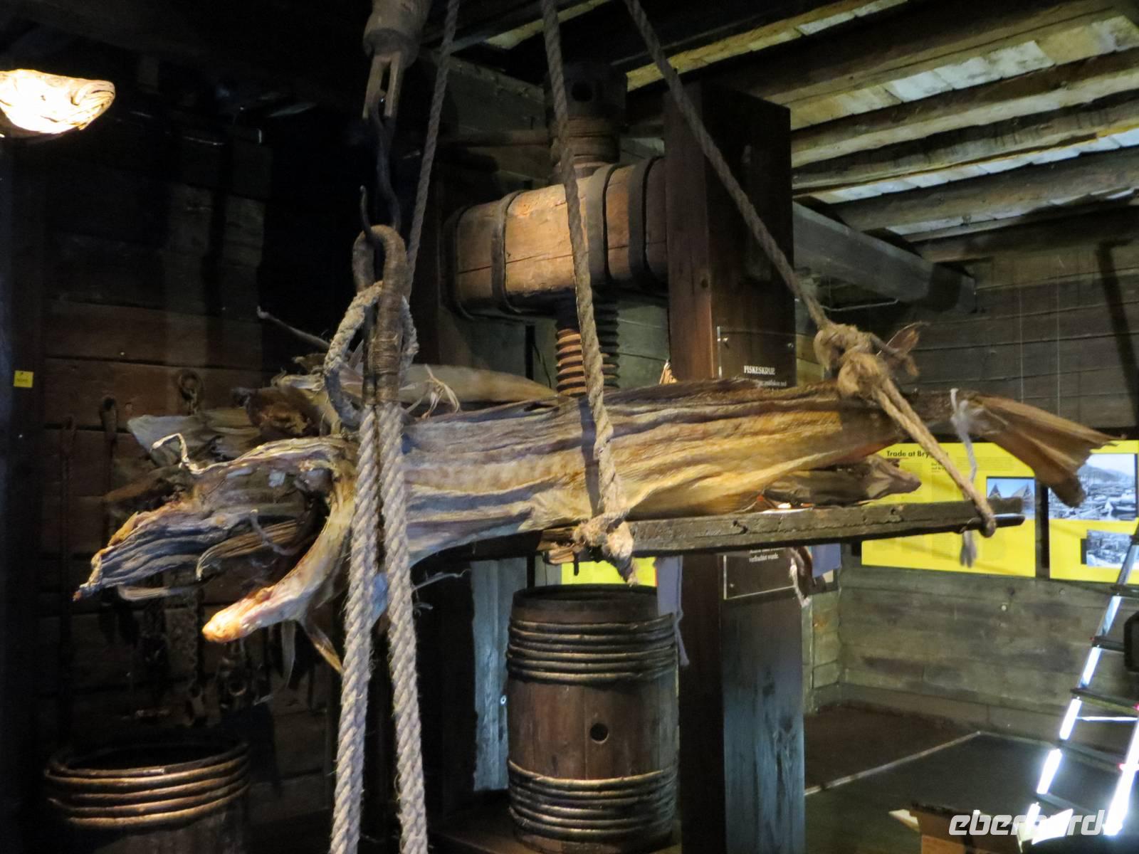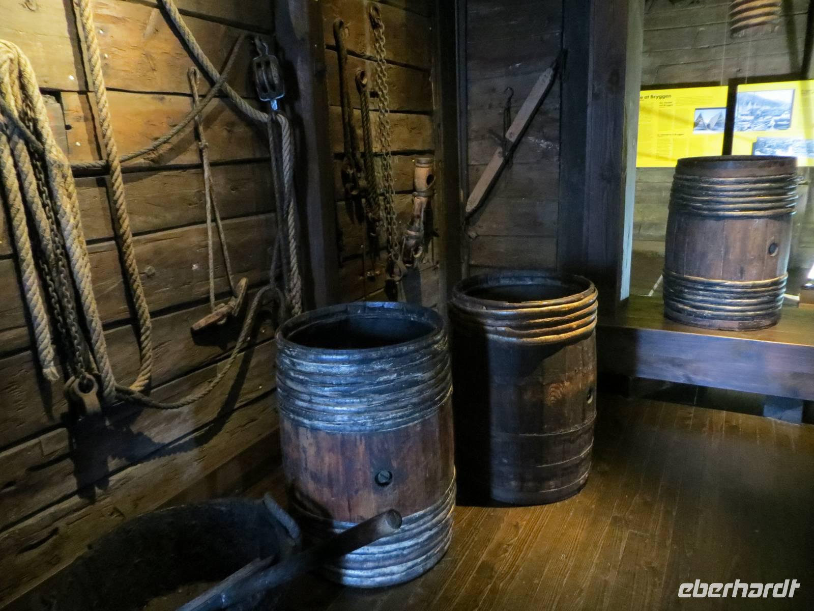Der Blick aus der Kabine versprach bereits bei der Einfahrt in die gewaltige Bucht von Bergen einen schönen Tag: Sonnenschein, leicht bewölkt und 16 °C. Gleich nach dem Anlegen trafen wir unsere örtliche Reiseleiterin Sarah zum dritten Eberhardt-Inklusiv-Ausflug unserer Kreuzfahrt. Gemütlich spazierten wir zur Håkans-Halle und zur Festung Bergenhus, lauschten den Geschichten um den Rosenkrantz-Turm und die Marienkirche ... Dann standen wir am berühmten Viertel Tyske Brygge. Sarah berichtete aus dem Leben der Kaufmänner und erläuterte die „ehrbaren" Inschriften der Häuser. Natürlich flanierten wir durch das Gewirr der Gässchen, die miteinander verschachtelten Kontore und Galerien. Unser Besuch im Hanseatischen Museum vermittelte uns ein nahezu identisches Bild vom Leben der Kaufleute, der Gesellen und der Lehrlinge. Wir merkten kaum den Übergang von einem Kaufmannshaus in das andere.