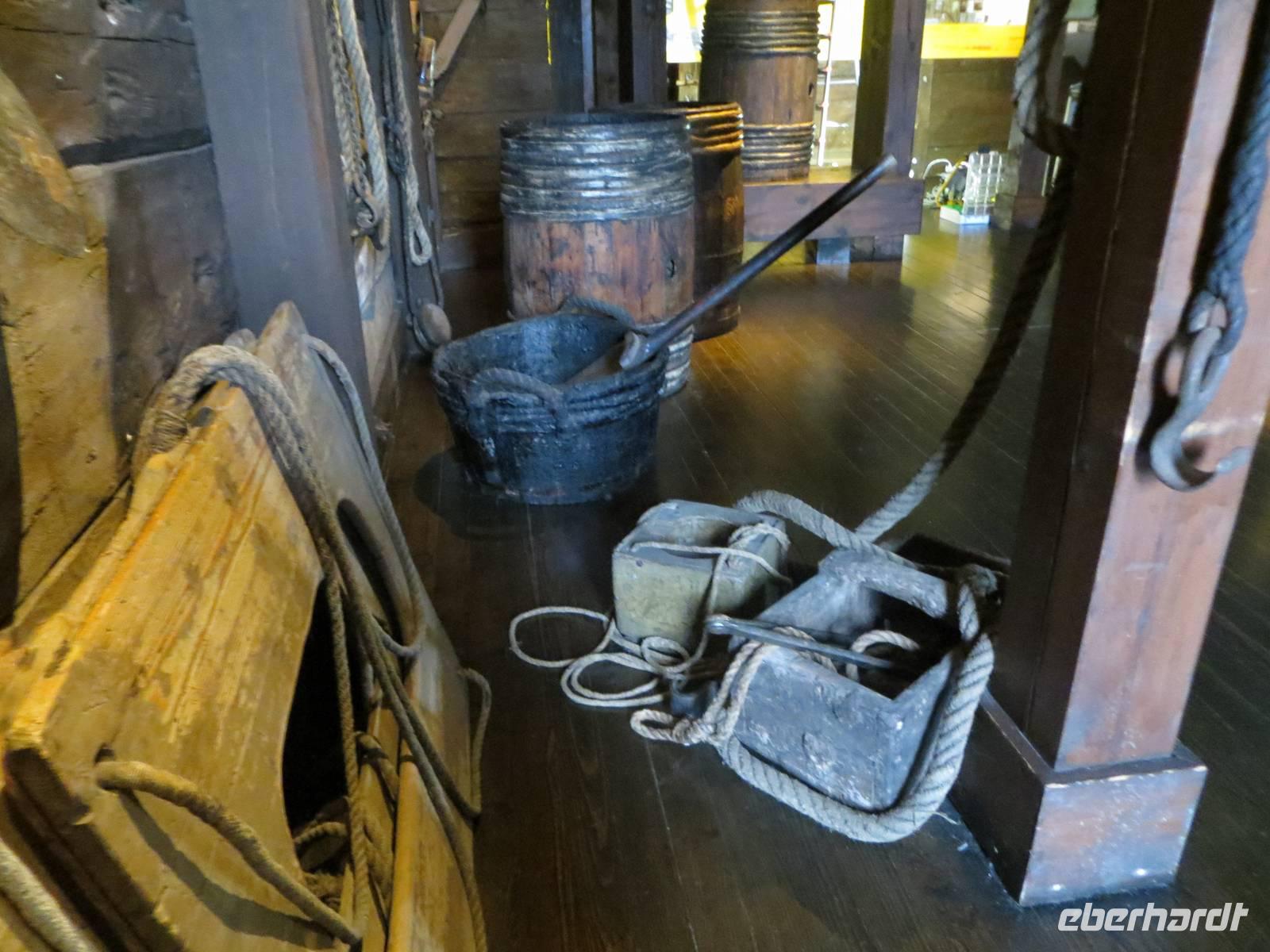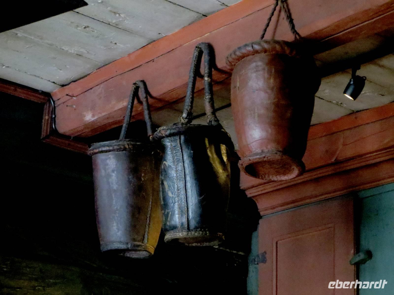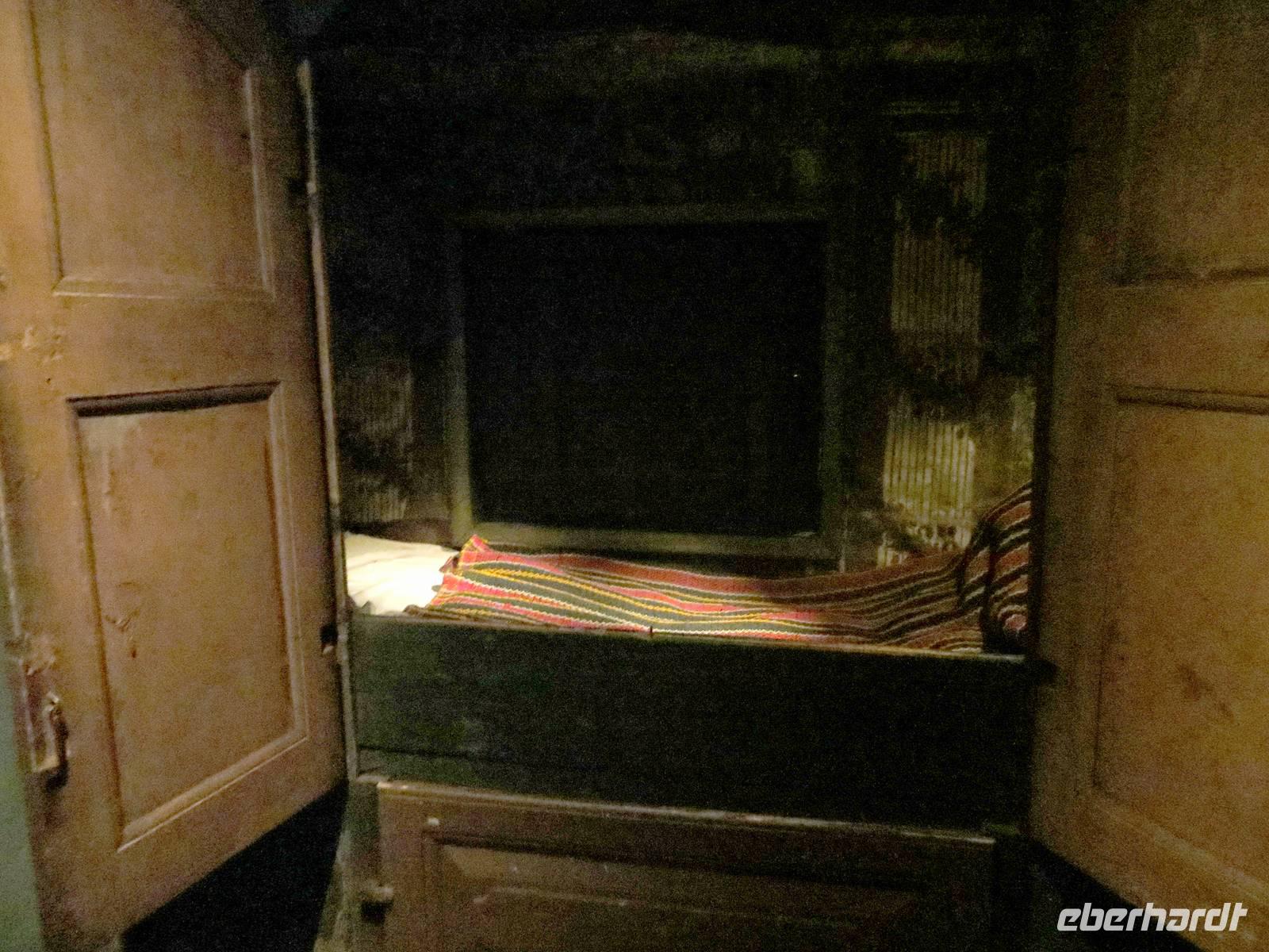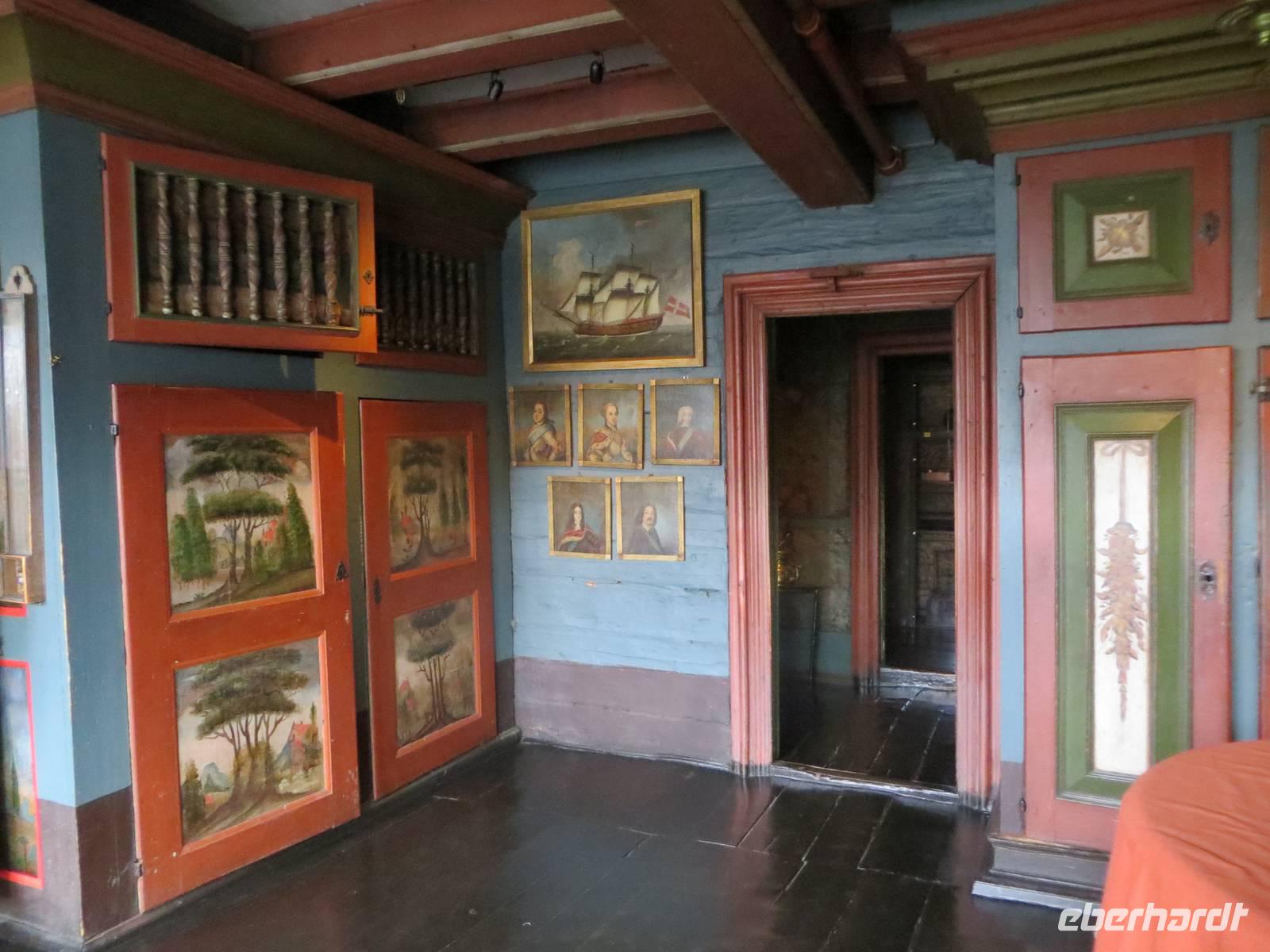 Der Blick aus der Kabine versprach bereits bei der Einfahrt in die gewaltige Bucht von Bergen einen schönen Tag: Sonnenschein, leicht bewölkt und 16 °C. Gleich nach dem Anlegen trafen wir unsere örtliche Reiseleiterin Sarah zum dritten Eberhardt-Inklusiv-Ausflug unserer Kreuzfahrt. Gemütlich spazierten wir zur Håkans-Halle und zur Festung Bergenhus, lauschten den Geschichten um den Rosenkrantz-Turm und die Marienkirche ... Dann standen wir am berühmten Viertel Tyske Brygge. Sarah berichtete aus dem Leben der Kaufmänner und erläuterte die „ehrbaren" Inschriften der Häuser. Natürlich flanierten wir durch das Gewirr der Gässchen, die miteinander verschachtelten Kontore und Galerien. Unser Besuch im Hanseatischen Museum vermittelte uns ein nahezu identisches Bild vom Leben der Kaufleute, der Gesellen und der Lehrlinge. Wir merkten kaum den Übergang von einem Kaufmannshaus in das andere.