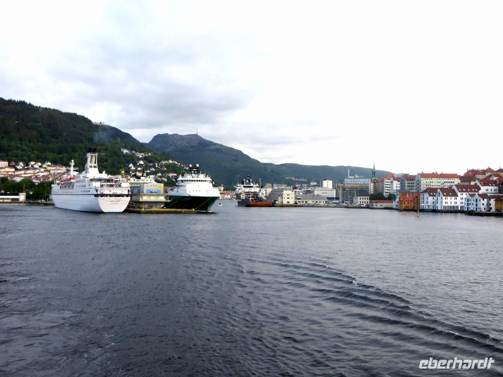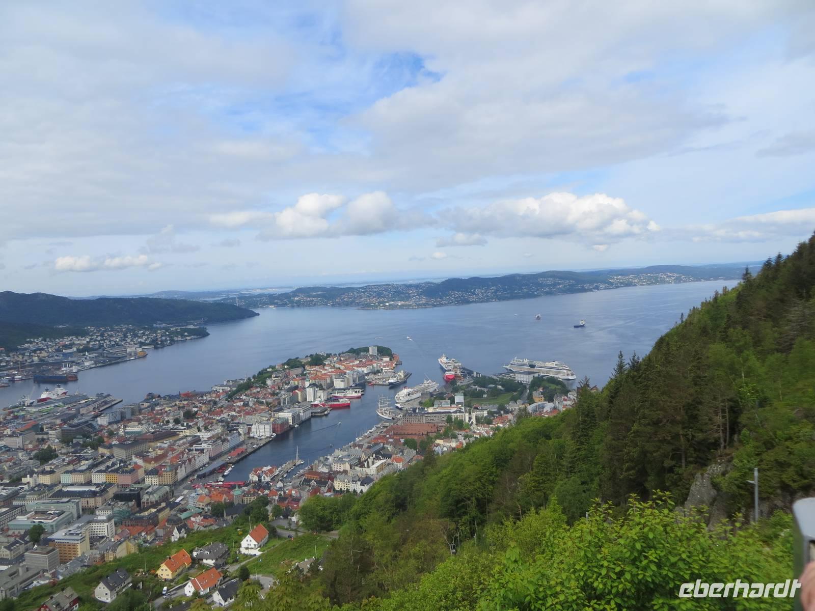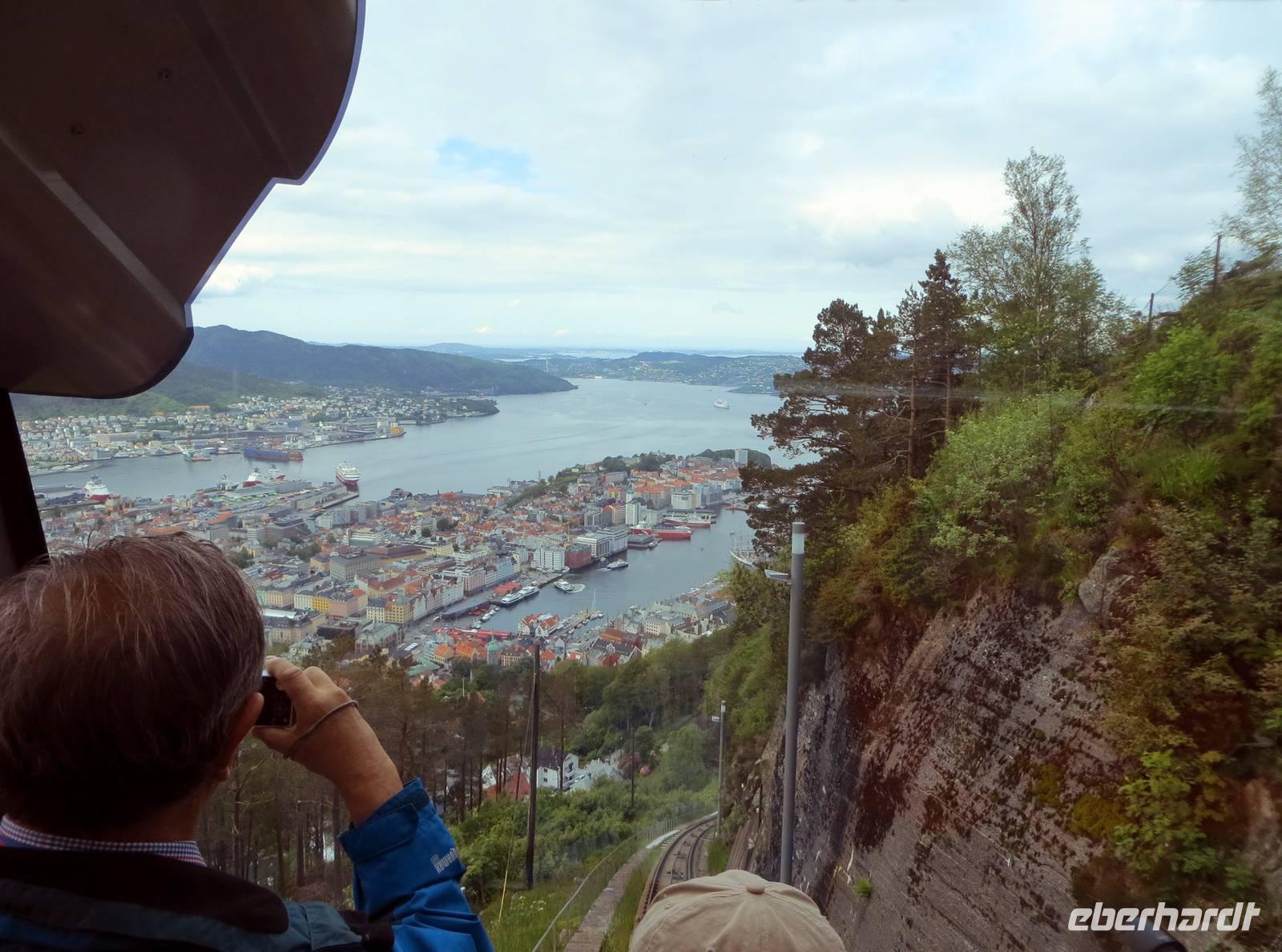 Da sich uns ein nahezu wolkenloser Himmel präsentierte, entschieden wir uns zur sofortigen, anschließenden Auffahrt mit der Floyenbahn auf den Hausberg, den Floyen. An der Talstation standen Menschen über Menschen. Aber wir hatten reserviert und konnten sofort mit der nächsten Bahn auffahren. Was für ein Panorama! Wasser, Grün, Holz- und Steingebäude ... ein Rundblick über Bergen: sieben Bergrücken, sieben Fjorde, darin kleine und große Inseln, direkt vor uns der Hafen mit dem Fischmarkt. Überall tanzten kleine und große Schiffe auf den Wellen, Frachter, Ausflugsboote, Schnellboote, Jachten, Segelschiffe und Kreuzfahrtschiffe. Im Hafen lagen mehrere Generationen, darunter unsere AIDAluna und die MS ASTOR.