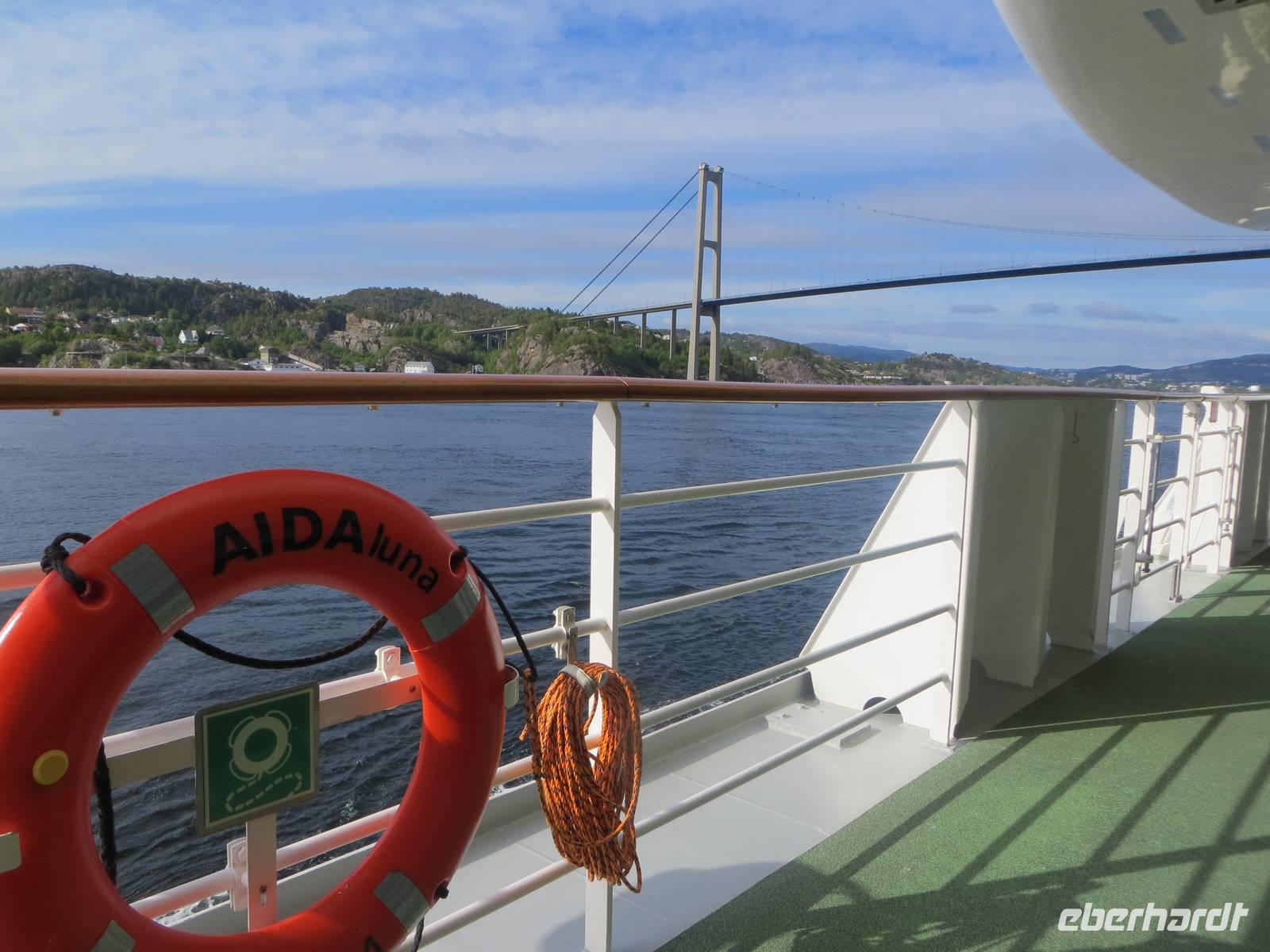 11.00 Uhr trafen wir uns zu unserer Eberhardt-Begrüßungsrunde in der AIDA-Bar und stießen mit einem Glas Sekt auf erlebnisreiche Tage im Norden unseres Kontinents an. Anschließend führten uns Annika und Alexandra über ihre AIDAluna. Nun fällt uns die Orientierung an Bord etwas leichter: Am Heck alle Restaurants, im Bug der Spa & Soul-Bereich, die AIDA-Bar und -Lounge, der Fitness-Bereich ... dazu das Theatrium in der Mitte des Schiffes ... Na, dann kann ja nichts mehr schief gehen. Doch halt: Wie ist das mit links und rechts, Back- und Steuerbord? Da wir dies bereits im Bus geübt hatten, waren wir schnell mit unserer Antwort.