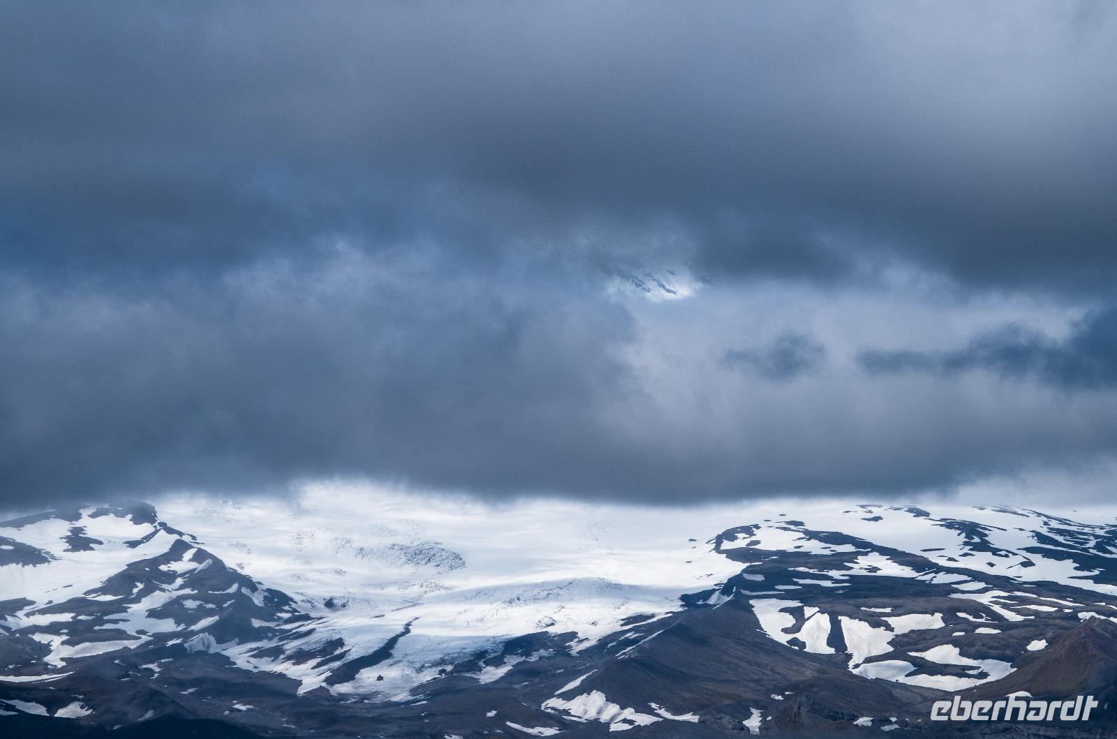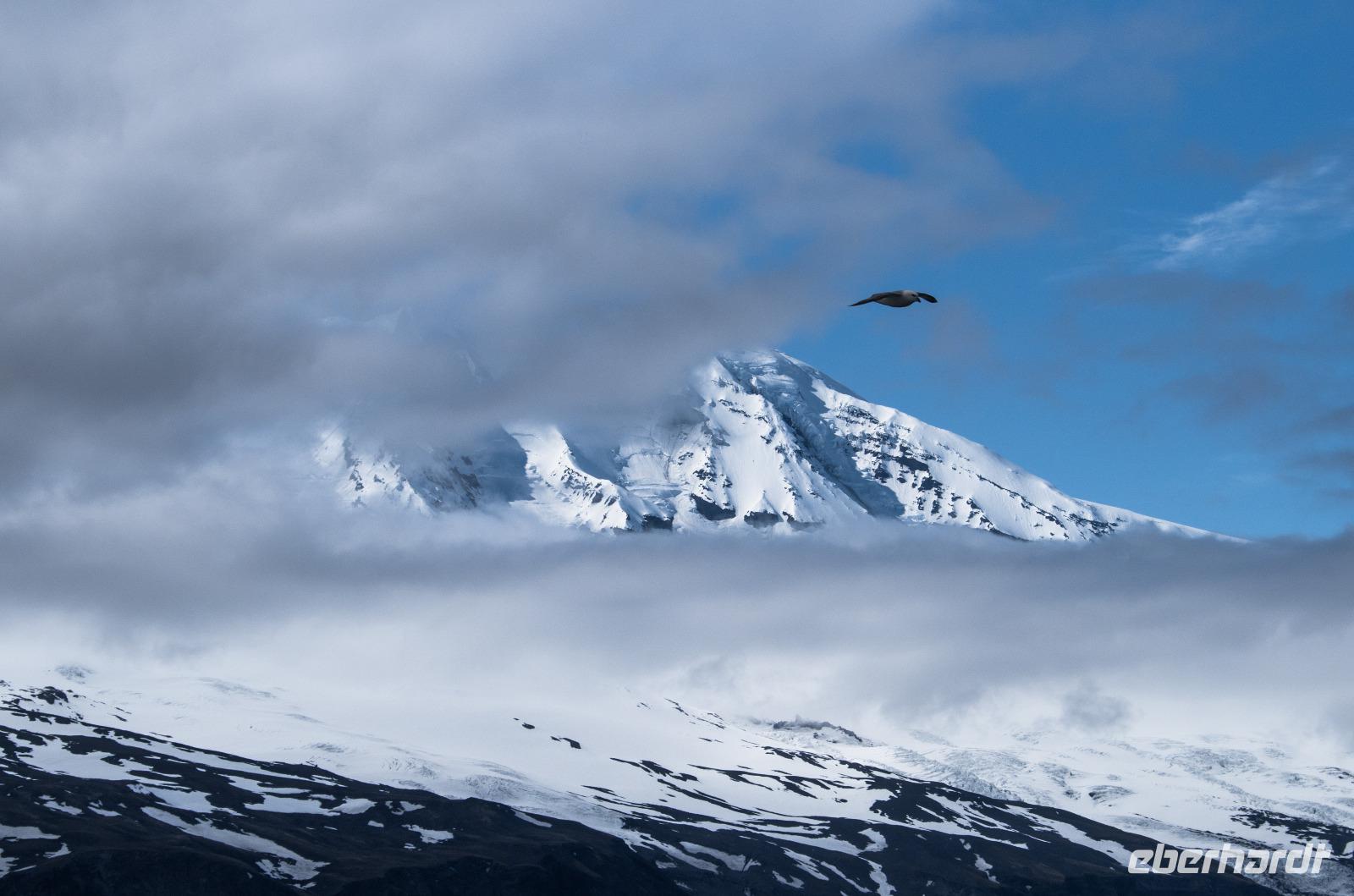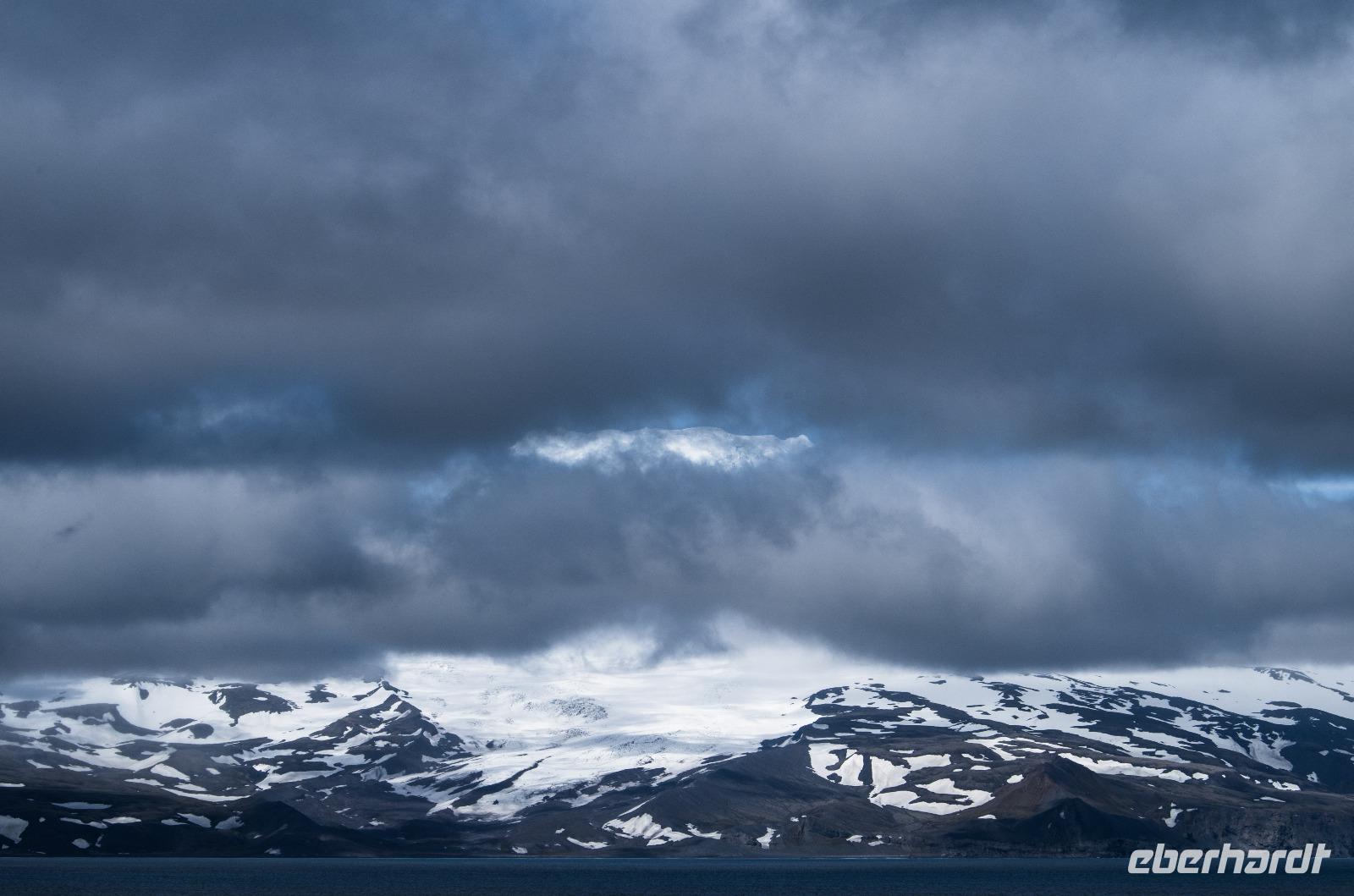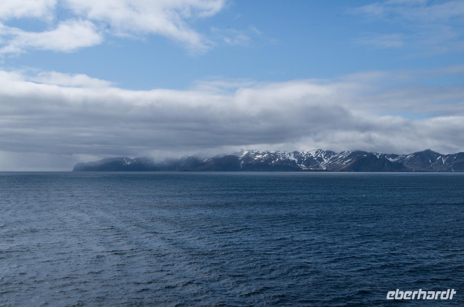 Der nächste Höhepunkt erwartete uns schon backbords: Wir passierten die Insel Jan Mayen und nach sehr viel Geduld mit stets auslösebereiter Kamera zeigte er sich: der majestätische Beerenberg. Er ist der nördlichste noch aktive Vulkan der Erde und misst beachtliche 2777 Meter in der Höhe. Zählt man vom Meeresgrund auf, erreicht eine Höhe von 5000 Metern. Leider kann man seine gesamte Pracht nur selten bestaunen - nur ca. 2 Wochen während des gesamten Jahres taucht seine Spitze aus dem Wolkenmeer auf. Wir hatten Glück! Für wenige Minuten lichtete sich die dichte Wolkendecke und die Spitze kam, von Sonnenstrahlen erleuchtet, zum Vorschein.