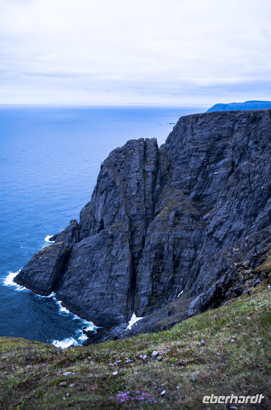 Gegen 20 Uhr ist es dann soweit: steuerbords taucht er vor uns auf: der Nordkap-Felsen mit Hornvika - dem Nordkap-Horn - einem kleinen Felsen, der vom Nordkap Felsen in das offene Meer hineinragt. Während wir die Hornvika-Bucht und das Nordkap-Plateau passieren, gibt uns Lektor Georg Hahn noch einmal interessante Informationen zur Region und dem beliebten Reiseziel. Doch im Gegensatz zu früheren Nordkap-Reisenden können wir nicht direkt in der Hornvika-Bucht vor Anker gehen, sondern müssen die Insel Magerøya umrunden, vorbei am Kamoyfjord, um dann in Honningsvåg anzulegen.