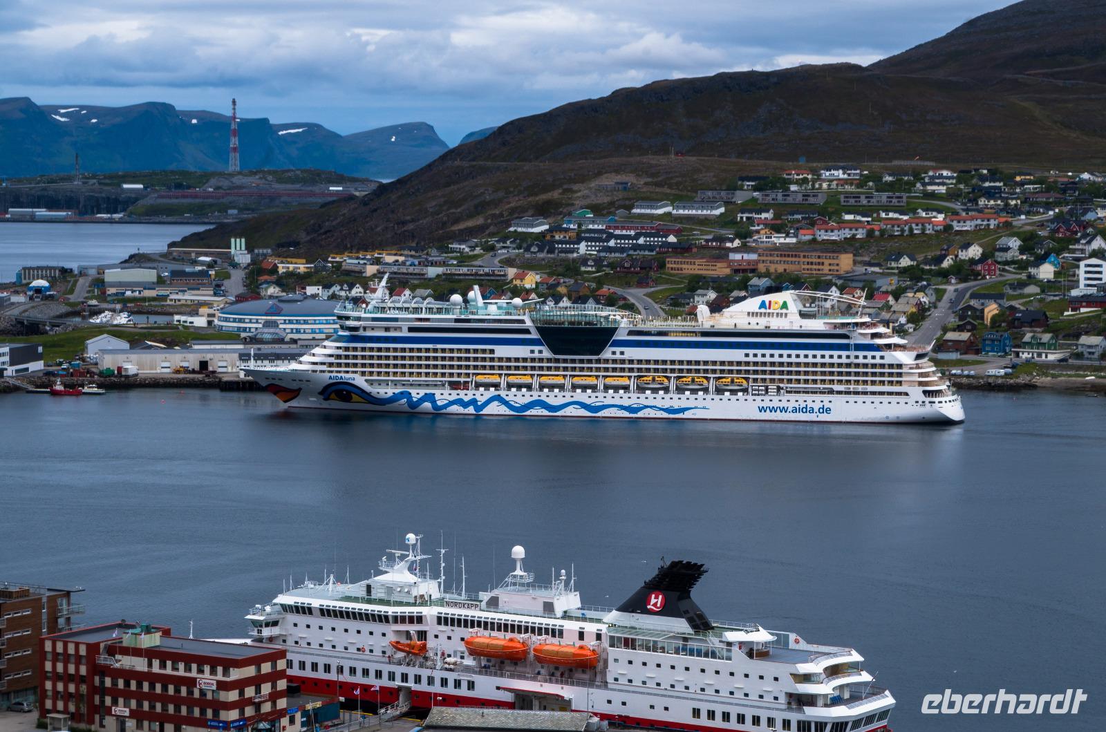 Pünktlich um 23 Uhr legen wir in Honningsvåg an. Dort warten bereits die Ausflugsbusse, die uns und die 1800 anderen AIDA Ausflügler staffelweise zum Nordkap brachten. Auf der 45-minütigen Fahrt durch die nördliche Finnmark bis zum Nordkap-Plateau bestaunten wir malerische Buchten mit kleinen, bunten Fischerhäusern, freilaufende Rentiere, Samì-Siedlungen und viel unberührte Natur. Sogar ein paar Schneefelder entdeckten wir noch. Unser Fahrt führte uns auch vorbei am 417 Meter hohen Gråkallfjellet, der höchsten Erhebung der Insel Magerøya, an dessen nördlichen Ende sich das Nordkap-Plateau befindet.