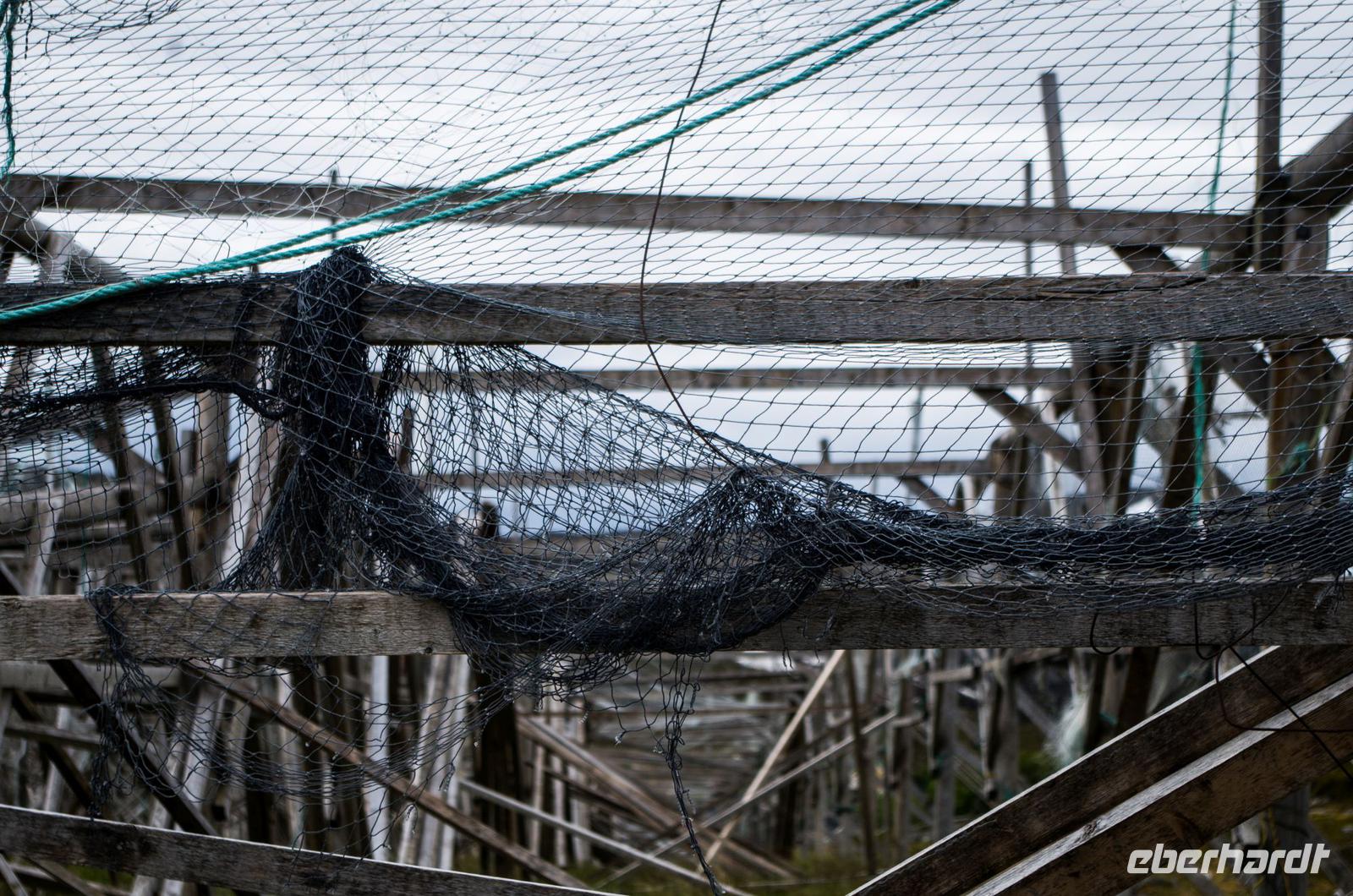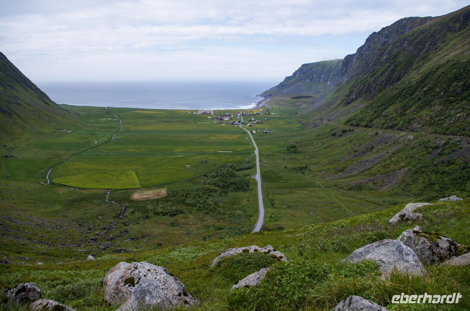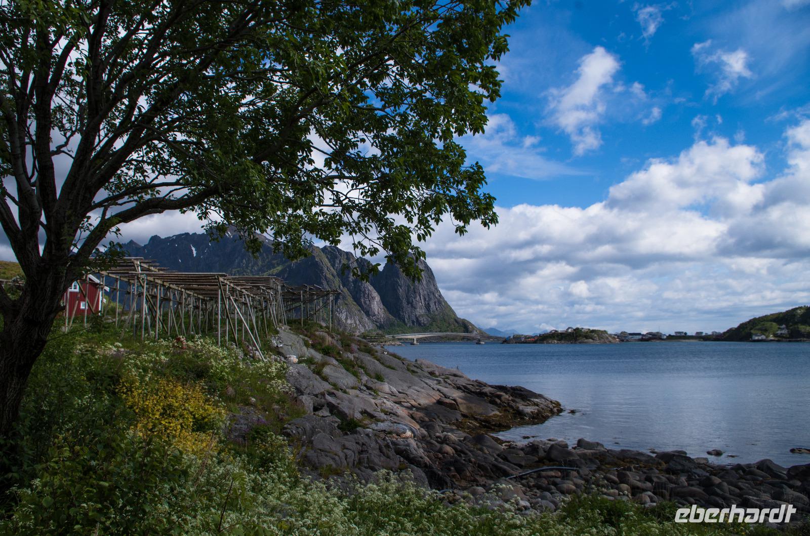 Nach so einem Wikingermahl unternimmt man am besten einen Spaziergang, um die Wikingerungeübte, deutsche Verdauung bei Ihrer Arbeit zu unterstützen. Gesagt, getan - wir fuhren Richtung Langstad, wo uns Veronika zu einem wunderschönen, einsamen Aussichtspunkt führte, von wo aus wir einen kleinen Spaziergang hinab ins Tal unternahmen. Dabei kamen wir an riesigen Stockfisch-Holzgestellen vorbei und konnten so die Delikatesse aus der Nähe betrachten, auch wenn Mancher/m dabei der Appetit schnell verging.