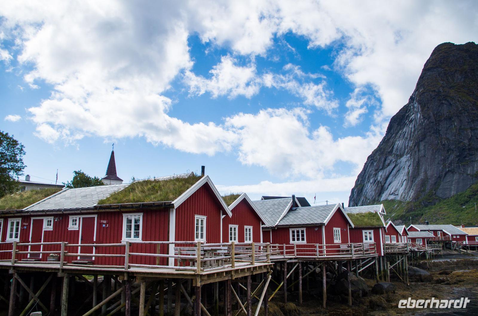 Gegen Mittag erreichten wir Reine - im Sonnenschein machte das Örtchen seinem Ruf alle Ehre: Fasziniert bewunderten wir die Kulisse aus dunkelroten Fischerhütten , tiefblauem Meer und hohen Bergen, welche bis zu 2.8 Milliarden Jahre alt sind. Es gibt wohl keinen schöneren Ort für eine Pause und den Genuss von Stockfisch (welcher seinen Geschmack übrigens noch besser mit einem Schlückchen „Wasser" entfaltet) ! Bevor wir den Rückweg nach Vestvagoy antraten, bestaunten wir noch die berühmte Lofotenwand - das Panorama der Felsen der einzelnen Inseln, die vom Meer und bestimmten Aussichtspunkten aus, wie eine einzige Felsenwand erscheinen.