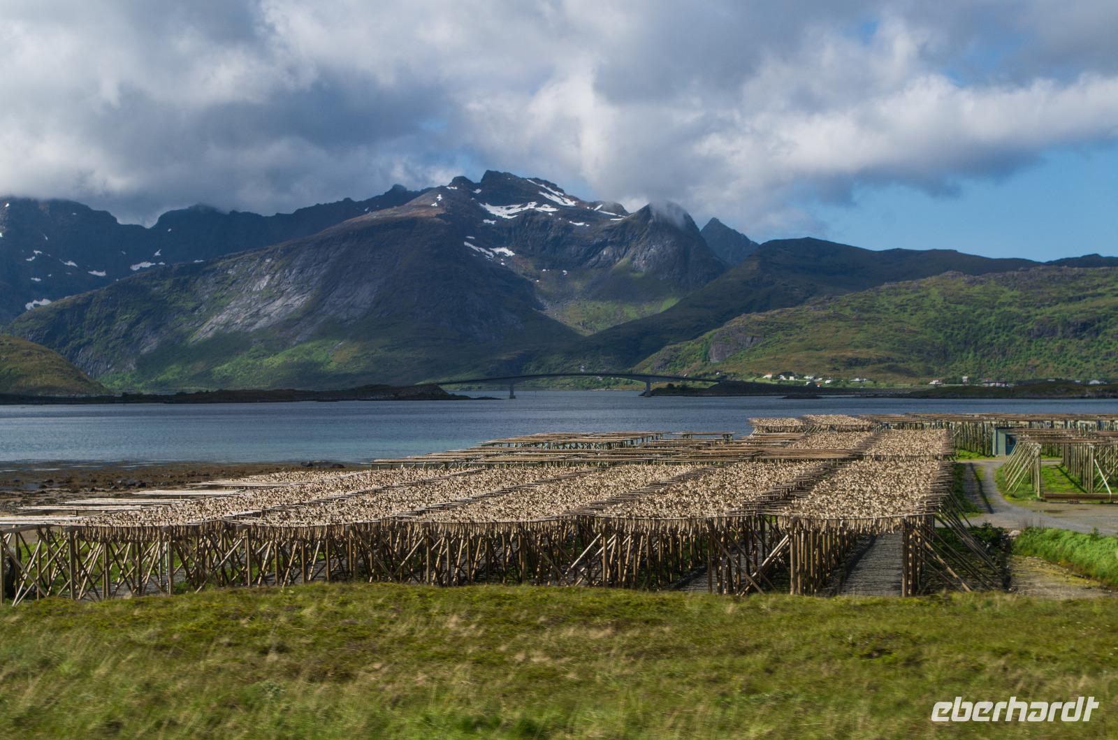 Wir verließen nun die Insel Flakstadoy und fuhren weiter auf die Insel Moskenes. Während der Fahrt verriet uns Veronika sehr viel Wissenswertes über Stockfisch, dem Exportschlager der Lofoten, der nicht nur den Bau des Trondheimer Domes finanzierte, sondern auch der deutschen Handelsgilde Bryggen in Bergen zu Reichtum und Wachstum verhalf.