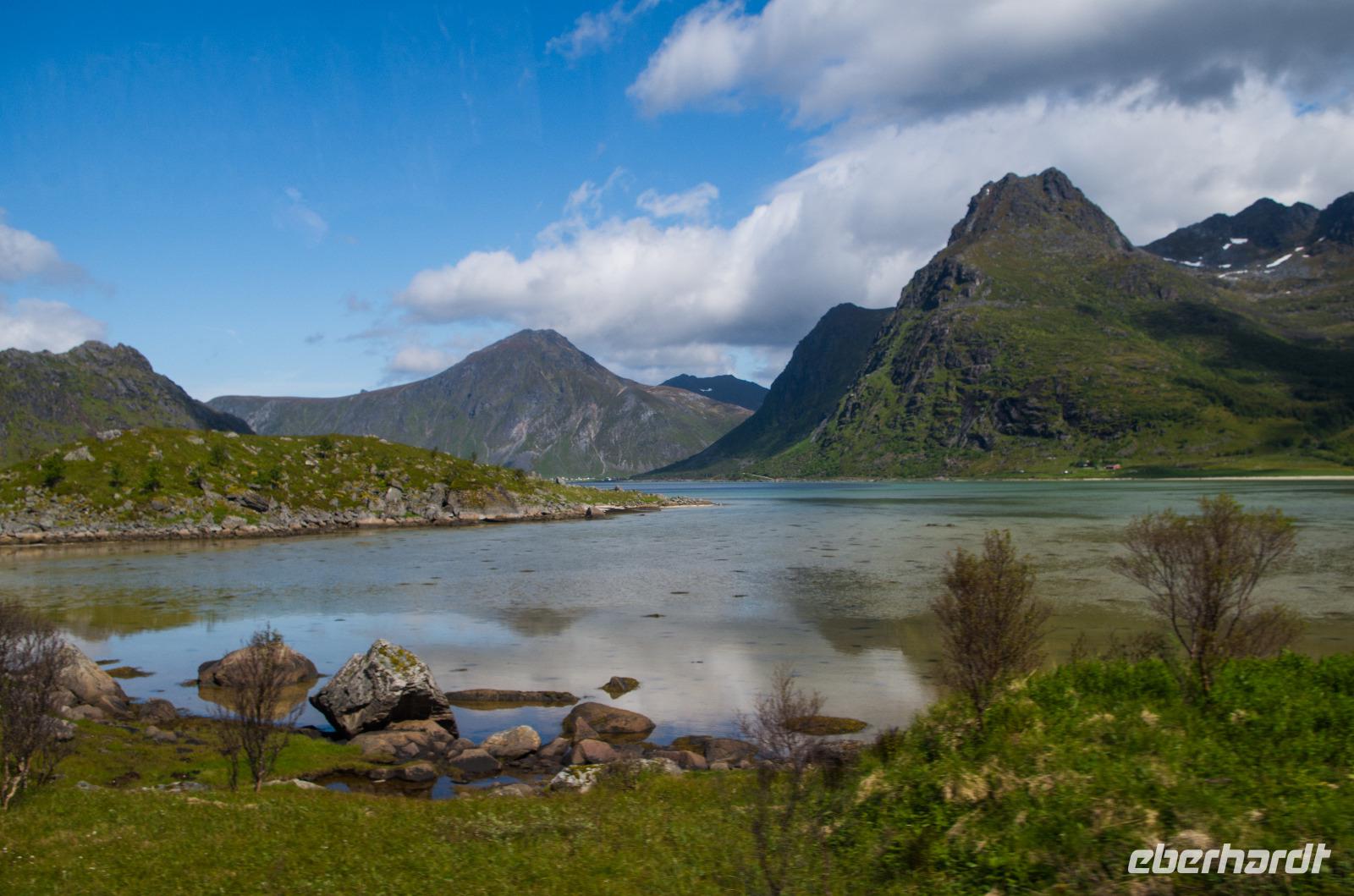 Zunächst verließen wir die Insel Vestvagoy, auf der sich der Hauptort Leknes befindet und fuhren durch einen Tunnel auf die Nachbarinsel Flakstadoy. Wussten Sie, dass die Tunnel mit einem hohen Fiepton ausgestattet sind, um Füchse und andere größere Tiere davon abzuhalten, von einer auf eine andere Insel zu wandern?