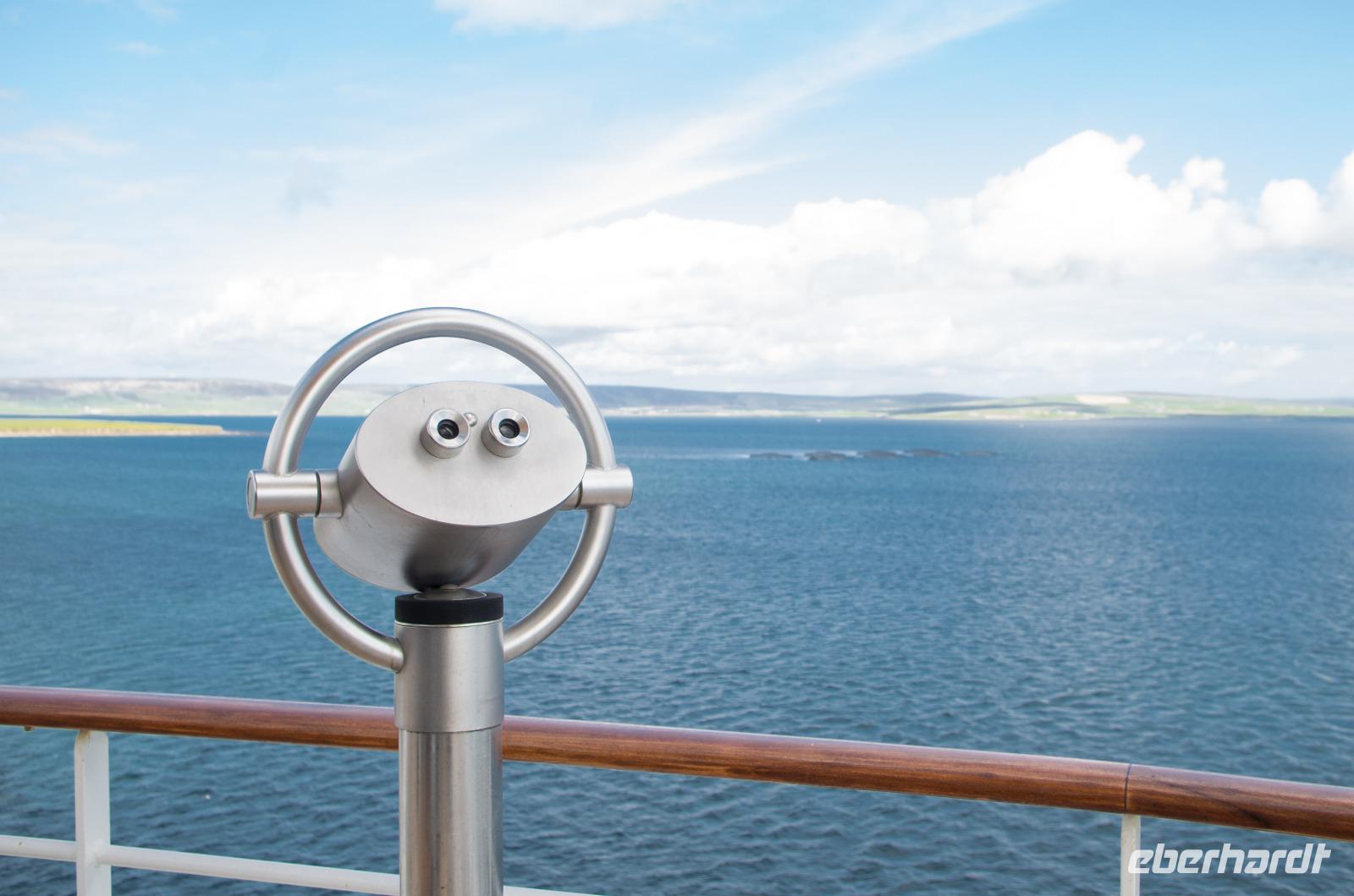 Bei schönstem Wetter und weiter Sicht war es dann soweit - wir legten um ca. 18.45 Uhr ab und begannen unsere Reise in den Norden. Einige von uns fanden sich auf der Außenterrasse des Restaurants ,,Weite Welt" zusammen und genossen die Ausfahrt bei einem Glas Sekt oder Wein. Begleitet von der AIDA Auslauf-Melodie „Sail away" begann unsere Fahrt Richtung Schottland zu den Orkney Inseln.