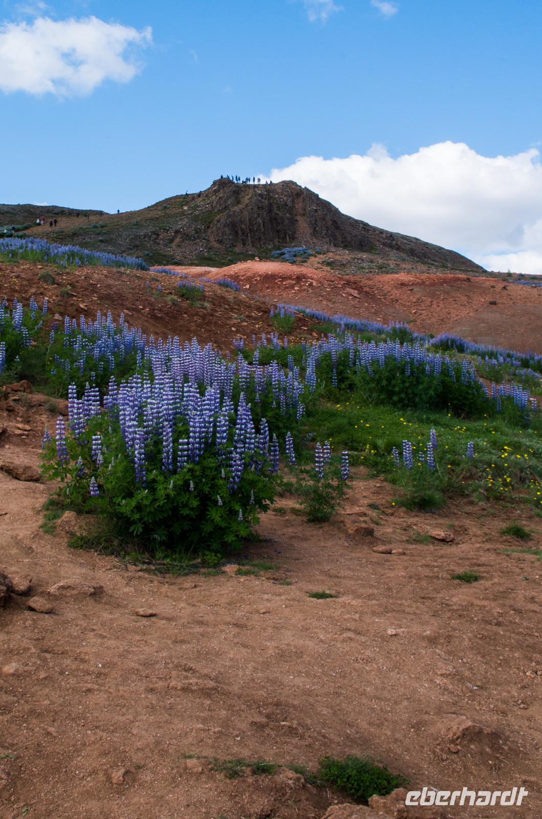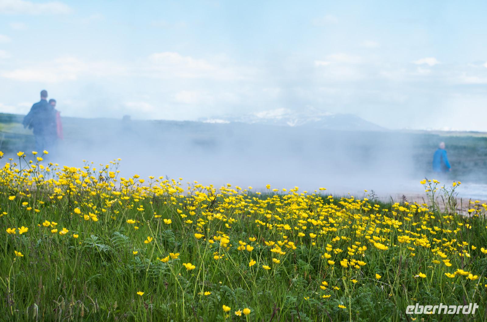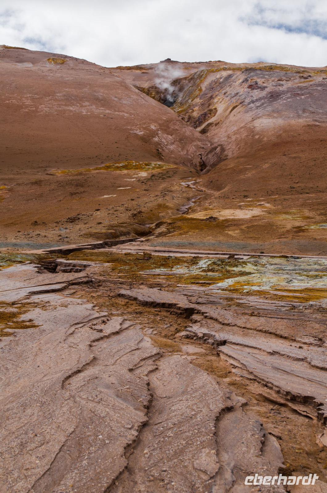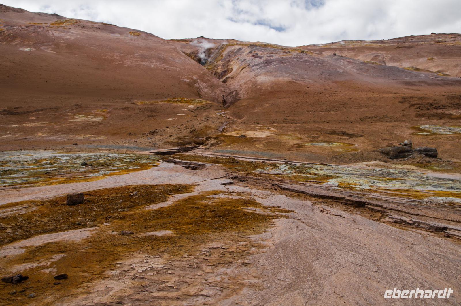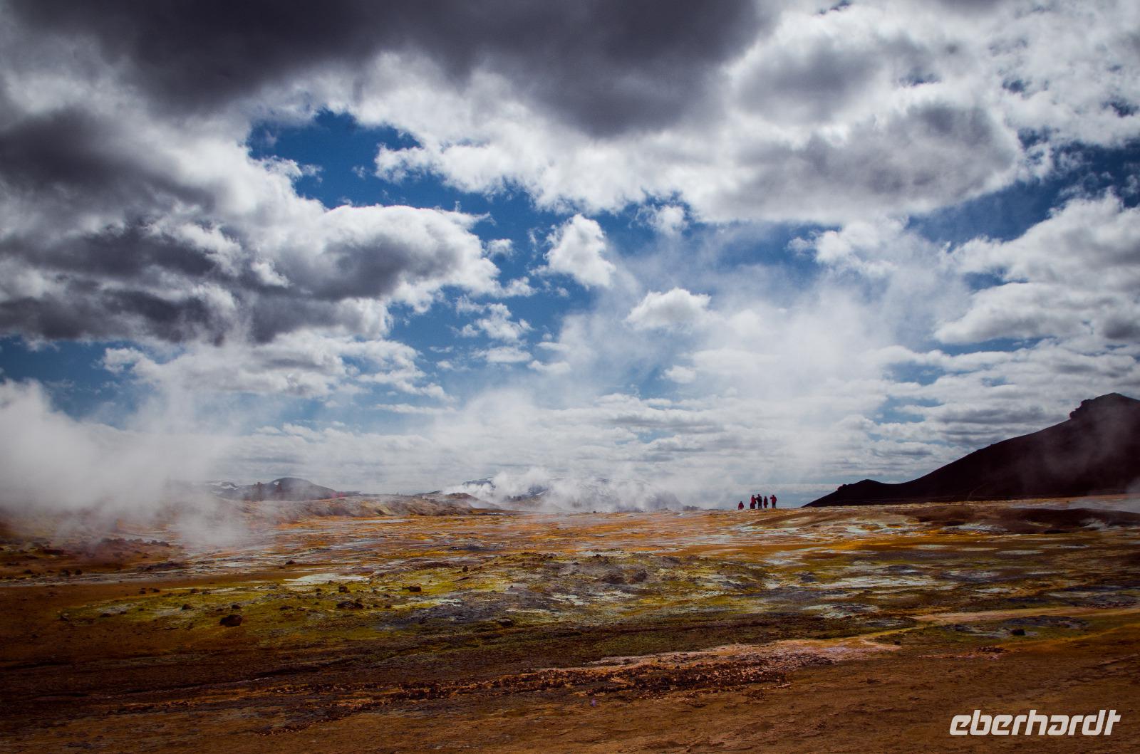 Auf dem Weg zu den heißen Schwefelquellen in Namaskard passieren wir eine kleine blaue Lagune, die man früher gern zum Baden benutzte. Heute ist dies wegen angeblicher Lebensgefahr untersagt - vielleicht bezieht sich das aber eher auf die Quelle als auf die Menschen? Walter, ein ehemaliger Landwirt, berichtet viel Interessantes über Flora und Fauna und natürlich die hiesige Landwirtschaft. Und dann tauchen sie plötzlich hinter einem Bergrücken auf - die brodelnden Schlammquellen. Unverkennbar ist der starke Schwefelgeruch, an den man sich erst einmal gewöhnen muss. Auch sollte man vorsichtig mit dem Berühren der heißen Schwefelquellen sein, schon manch einer hat sich hier die Finger verbrannt. Faszinierend ist nicht nur der Geruch, sondern sind auch die Farben, die im durchblitzenden Sonnenschein herrlich glitzern und strahlen. Früher hat man den gelblich schimmernden Schwefel hier von Hand abgetragen - die Maniküre konnte man sich dann wohl sparen.