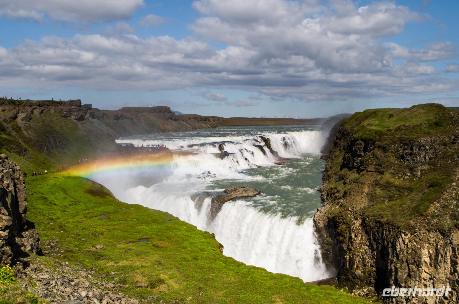 Weiter führte uns die Fahrt durch wildromantische Ebenen, geprägt von jahrtausendealten Lavafeldern. Wussten sie, dass man das Alter eines solchen Lavafeldes anhand der dort ansässigen Flora ungefähr bestimmen kann? Denn zunächst einmal wächst dort lange Zeit gar nichts, dann siedeln sich zunächst Moose und Flechten an und schließlich kleine Blumen. Bäume gibt es übrigens meist nur in den menschlichen Siedlungen, wo sie noch von Hand gepflanzt werden und nicht recht groß werden. Deshalb scherzen die Isländer gern: „Was macht ein Isländer in Island, wenn er sich im Wald verirrt hat? Er steht auf und schaut sich um." Um die Mittagszeit erreichten wir den Großen Geysir - Namensgeber für alle ihm ähnlichen Naturphänomene. Doch leider ist er schon sehr alt und nicht mehr sehr aktiv. Sein Sohn Strokkur allerdings begeisterte uns mit einer über 20 Meter hohen Wasser- und Dampfsäule. Jüngere Geysire zeigen im Abstand von wenigen Minuten eine Eruption, ältere Artgenossen nur im Abstand von ein paar Jahren, oder sie ruhen ganz. Vielleicht ist dieses Phänomen eine Erklärung dafür, dass in Island alle Geysire männliche Namen tragen. Nach diesem Höhepunkt und einem schmackhaften Mittagessen mit isländischen Köstlichkeiten machten wir uns auf dem Weg zum berühmten Gullfoss - dem goldenen Wasserfall. Und wahrlich schillerte um ihn ein großer Regenbogen in den schönsten Farben, als wir ihn erreichten. Die ganz Mutigen und Wasserdichten unter uns wagten sich bis ganz in die Nähe der ersten Fallstufe, des über 2 Stufen bis zu 70 Meter in die Tiefe stürzenden Wasserfalls - ein wahrhaft beeindruckendes Schauspiel!