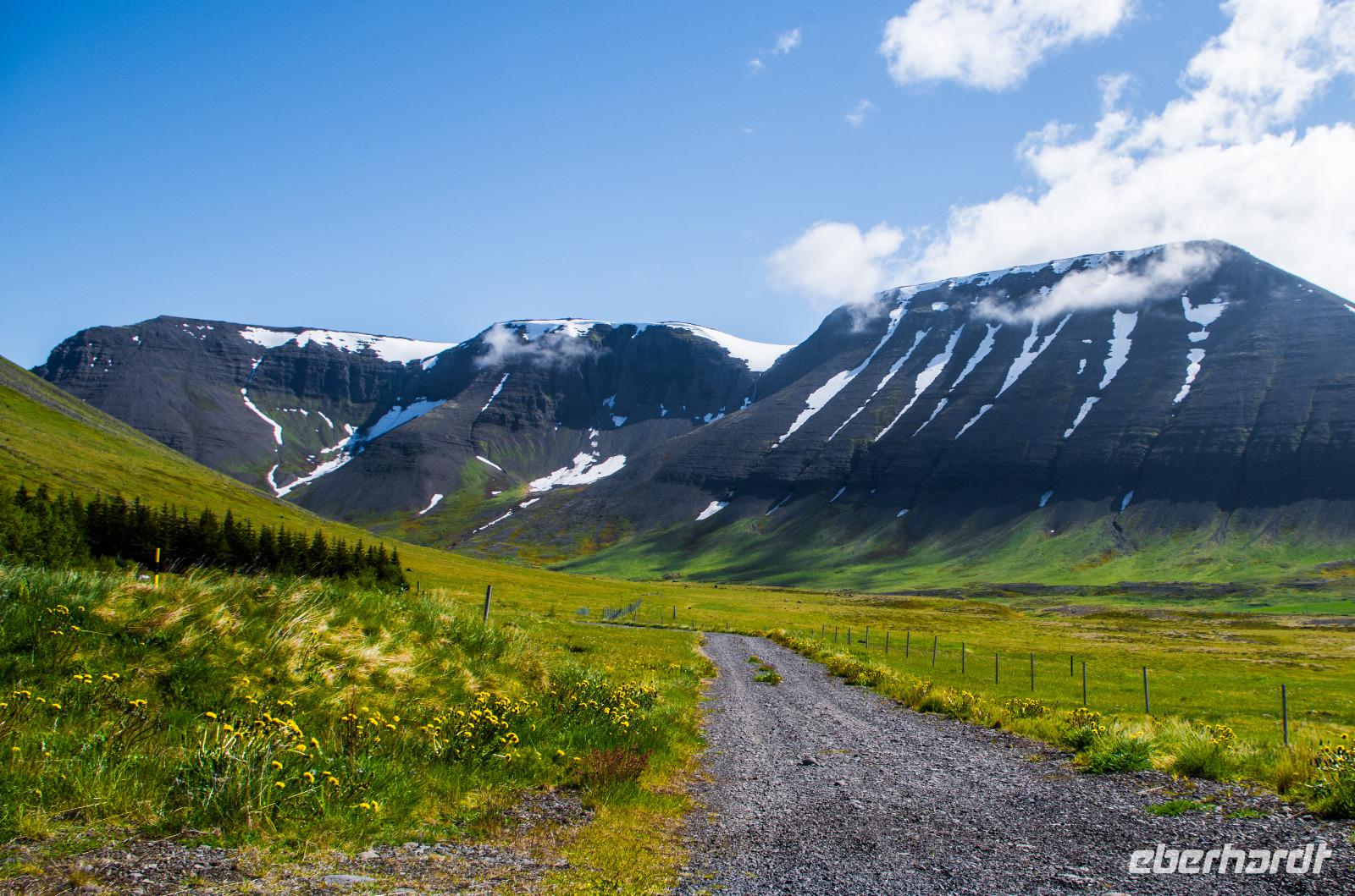 Am späteren Vormittag erreichten wir den einzigen größeren Ort in den Westfjorden Islands - Isafjördur. Das Wetter meinte es wieder gut mit uns und bei strahlendem Sonnenschein an den Berghängen von Eyrarfjall und Kirkjubolsfall in die Bucht von Isafjördur. An unserem Liegeplatz, nur wenige Gehminuten vom Ortszentrum entfernt, wartete schon unsere örtliche Reiseleiterin Claudia, die einen Großteil unserer Gruppe zu einem Ausflug in den botanischen Garten von Skrúdur und den malerischen Ort Flateyri begleitete. Durch tiefe Tunnel, über hohe Bergpässe und durch wunderschöne grüne Täler fuhren wir nach Skrúdur, einem bunten Kleinod an sonst kahlen Berghängen. Der Pfarrer Gudlaugsson legte diesen Schulgarten bereits 1908 an, hegte und pflegte ihn und erbrachte damit den Beweis, dass auch andere Pflanzen außer den heimischen Flechten und Moosen in diesen nördlichen Breitengraden wachsen und gedeihen können.