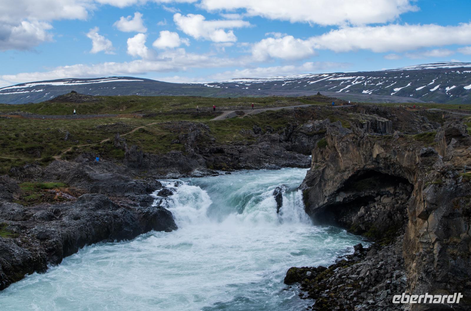 Nur 50 Kilometer vom Nördlichen Polarkreis entfernt, begrüßt uns Akureyri bei sommerlichen 14°Celsius. Am längsten Fjord Islands gelegen, beeindruckt die Stadt wohl vor allem mit ihrer eindrucksvollen Kulisse aus schneebedeckten Bergen und blau schillerndem Wasser. Für uns bietet Akureyri einen idealen Ausgangspunkt für Erkundungen ins Landesinnere, das mit sprudelnden Wasserfällen, grünen Weiden, heißen Schwefelquellen und malerischen Seenlandschaften viele Naturschätze zu bieten hat. Am Hafen erwartet uns schon Walter, ein Schweizer, der sich vor mehr als 50 Jahren in das Land und eine ganz bestimmte Landsmännin verliebt hat und seitdem dieses Fleckchen Erde seine Heimat nennt. Er kennt die Insel wahrhaft gut und weiß uns den ganzen Tag über mit seinem Schweizer Charme viel Interessantes über Island und die von uns besuchten Orte zu berichten.
