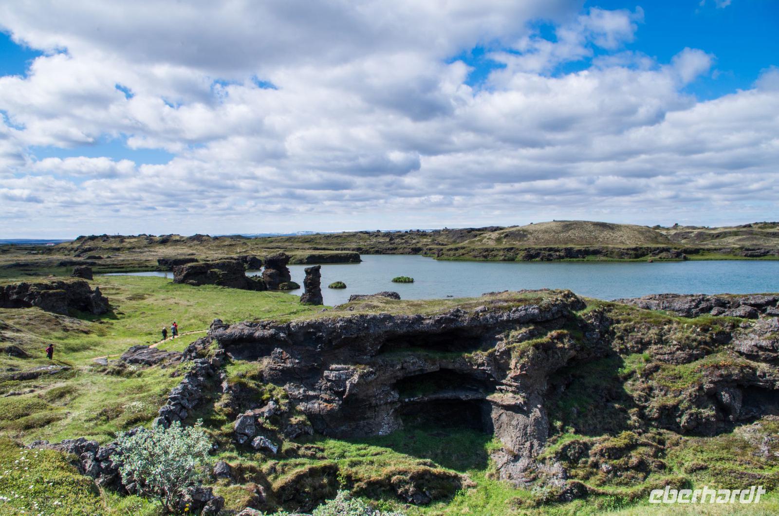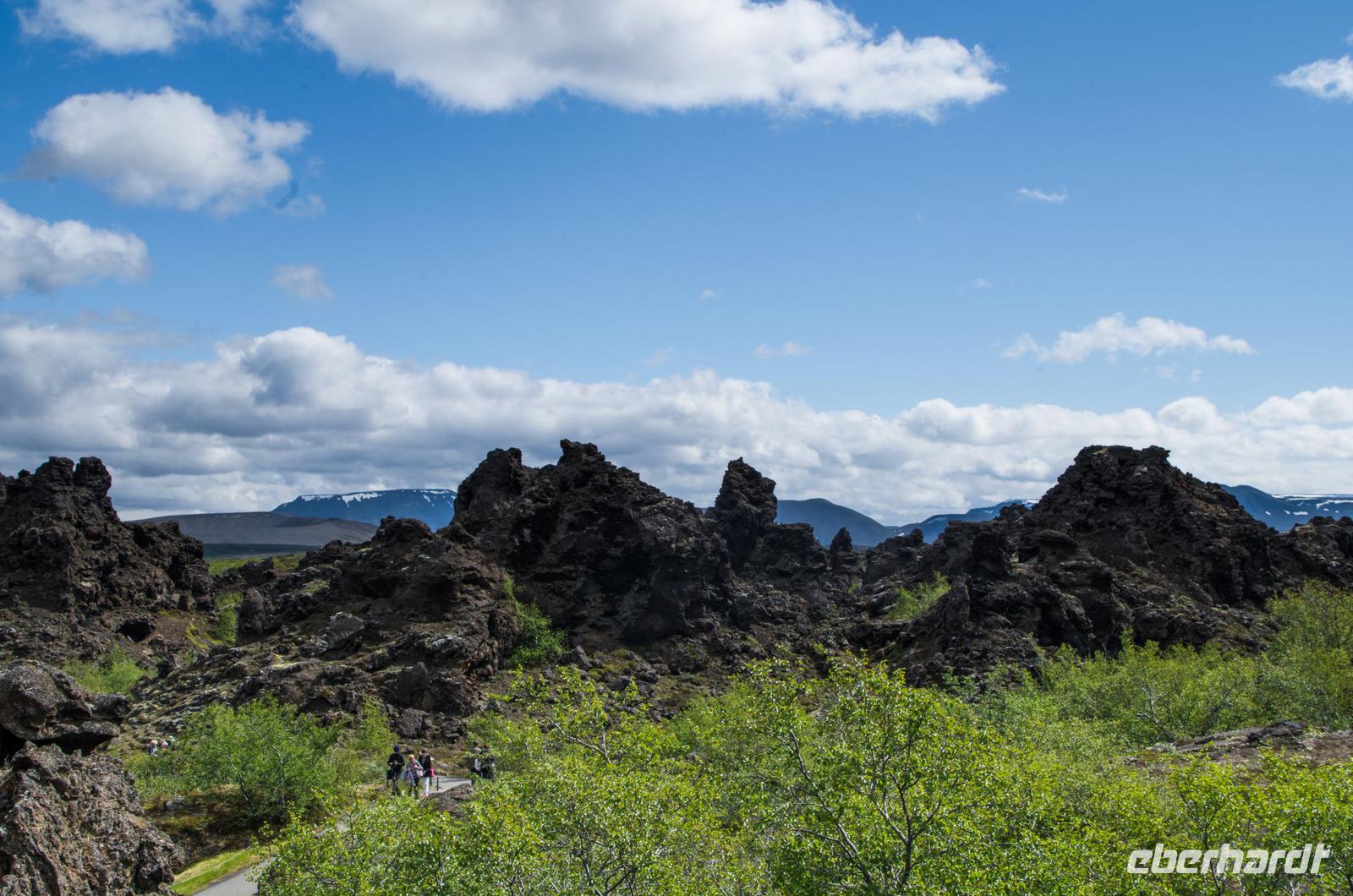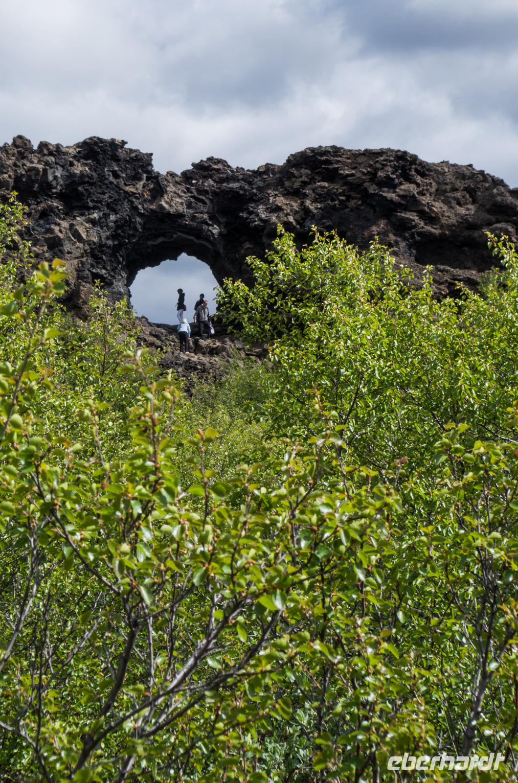 Vor dem Besuch des Lavagartens von Dimmuborgir stärken wir uns bei einem leckeren Mittagessen mit isländischer Lamm- oder Gemüsesuppe und über der Vulkanquelle gebackenem Brot. Beim anschließenden Spaziergang durch das Lavafeld entdecken wir viele der sogenannten Trollburgen: auf ihnen thronen sich küssende Trolle, zornige Könige und eine fette Henne sahen wir auch.