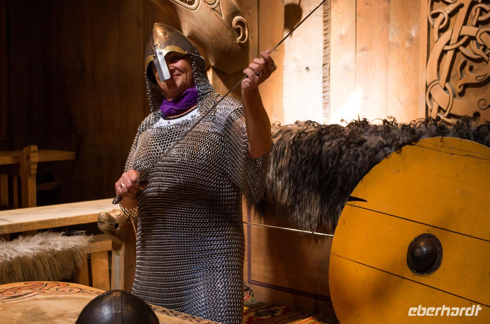 Wieder auf der Insel Vestvagoy angelangt, begaben wir uns auf den Weg nach Borg, wo uns ein traditionelles Mittagessen auf einem Wikingerhof erwartete. Bevor uns die Hausherrin höchstpersönlich begrüßte, konnten wir viel Interessantes über die hier einst ansässige Familie in einer Ausstellung erfahren. Ein rührender Film brachte uns die Familiengeschichte in Bild und Ton näher. Mit einem köstlichen Lammeintopf, Wasser und Met wurden wir herzlich empfangen und mit einem zauberhaften Wikingerlied von der Hausherrin persönlich verabschiedet.