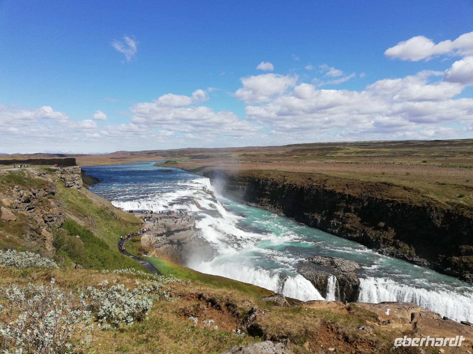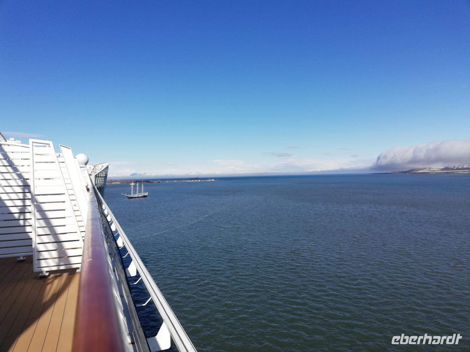 Das nächste Highlight unserer Reise beginnt. Um 10:00 Uhr erreichen wir die größte Vulkaninsel der Welt im Nordatlantischen Ozean. Auf unserem Ausflug bestaunen wir die Naturschönheiten Islands. Im Nationalpark in Thingvellir treffen wir auf die Spalte der eurasischen und der nordamerikanischen Kontinentalplatte. Kontinuierlich treiben die beiden Platten auseinander und bilden dabei die sogenannte Rift Zone die von Reykjanes bis Öxarfjördour das Land durchzieht. Auf der Fahrt zum Wasserfall „Gullfoss" zeigen sich atemberaubende Landschaften. Vor diesem Naturschauspiel stärken wir uns bei einem köstlichen Menü mit Suppe uns Lachs. Bei Königswetter kommen nun Wasserfall-Fans ganz auf Ihre Kosten. Blauer Himmel setzt einen der berühmtesten Wasserfälle Islands den „Gullfoss" besonders gut in Szene. Anschließend geht es in das Gebiet des Großen Geysirs zur Springquelle „Strokkur". Die Fotogeräte werden straff auf den sprudelnden Geysir gehalten um im richtigen Moment dieses Ereignis festzuhalten. Mit dieser Station ist der „Goldenen Kreis" um Reykjavik geschlossen und für uns heißt es die Rückfahrt anzutreten. Der Tag verging wie im Fluge. Am Schiff werden wir mit einem isländischen Glühwein empfangen. Wir verlassen den Hafen von Reykjavik und genießen die Ausfahrt.