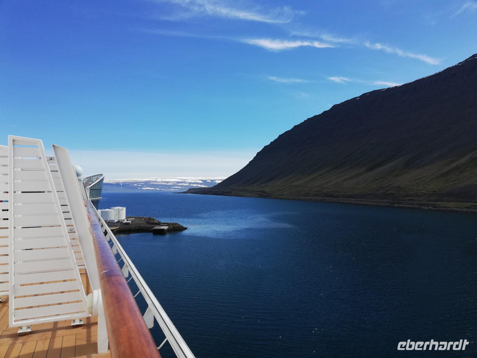 In der Nacht ist unser Kreuzfahrtschiff in Richtung Westen entlang der isländischen Küste gefahren und wir erreichen am frühen Morgen den westlichsten Zipfel der Insel. Ein kleiner verschlafener Ort wartet darauf von uns erkundet zu werden. Bei individuellen Spaziergängen oder Bootsausflügen lernen wir die Region der Westfjorde in Island kennen. Unberührte Natur und ein spektakuläres Bergpanoramen werden uns bereits bei der Einfahrt in den kleinen Hafen geboten. Mit ca. 2.600 Einwohnern ist dieser Ort recht dünn besiedelt. Die Fischerei spielt hier bis heute eine bedeutende Rolle. Auf der Vogelinsel Vigur bekommen wir sogar einige Papageientaucher und Küstenschwalben zu Gesicht. Den Nachmittag genießen wir bei strahlendem Sonnenschein auf einen der Sonnendecks und gönnen uns natürlich einen leckeren Kuchen. Später heißt es: „Leinen los" und wir nehmen die Fahrt in Richtung Akureyi auf.