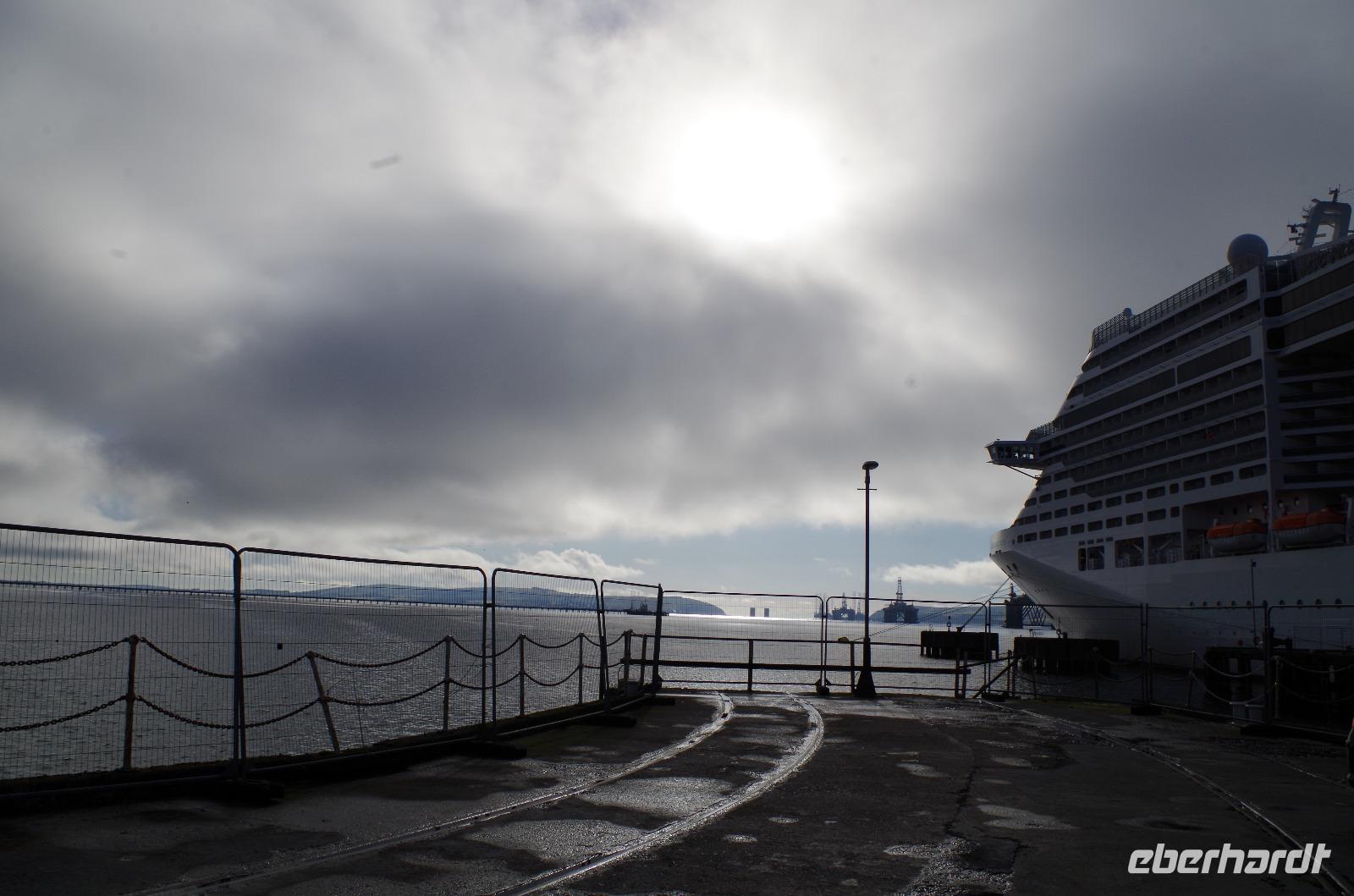 Gut gelaunt und nach einer ruhigeren Nacht starten wir mit einem leckeren Frühstück in den Tag. Es ist bewölkt bei rund 10 bis 15 Grad. Für den Landgang benötigen wir lediglich unsere Bordkarte. Pünktlich um 08.00 Uhr erreichen wir den Hafen von Kirkwall. Der Großteil der Gäste unternimmt am Vormittag einen von MSC durchgeführten Ausflug, abermals mit deutschsprachigen Reiseleitern :-) Zu empfehlen sind KWL02 "Panoramatour auf den Orkney-Inseln" und KWL07 "Alte Standing Stones und wilde Klippen". Um 08.15 Uhr treffen sich 13 Reisegäste und eine Reisebegleitung zum Ausflug KWL02 Panoramatour auf den Orkney-Inseln in Platinum Theatre auf Deck 6. Es wird uns eine Busnummer zugewiesen. Wir nehmen natürlich an, es geht auch gleich los. Dem ist aber leider nicht so :-( Wir haben noch keine Einreisegenehmigung von den Behörden erhalten. Der Genehmigung sowie der Start unseres Ausflugs verzögert sich um mehr als eine Stunde! Das lange Sitzen im Theater ist schon ein wenig nervend und anstrengend :-( Nach 09.00 Uhr dürfen wir dann endlich von Bord gehen und um 09.30 Uhr begrüßen wir unsere heutige Reiseleiterin Loraine. Sie ist eine nette ältere Lady, welche vor allem sehr charmant über ihre eigenen Scherze lachen kann. Loraine spricht zudem gutes Deutsch. Auch die anderen Gäste erleben Ausflüge mit deutschsprechenden Reiseführern. Unterwegs setzt leichter Regen ein, welcher aber in Schottland einfach dazu gehört! Wir fahren entlang der schönen Küste und an der historischen Bucht von Scapa Flow vorbei. Loraine erzählt uns dramatische Geschichten aus Kriegszeiten, durch welche diese Gewässer zu den bekanntesten Gegenden der Welt wurden. Dann fahren wir ins Landesinnere in das Herz des neolithischen Orkney, welches 1999 von der UNESCO zum Weltkulturerbe ernannt wurde. Ein Highlight der Tour ist die Besichtigung des berühmten "Ring von Brodgar". Den krönenden Abschluss bildet das nahe gelegene Birsay Moors RSPB Reservat (Royal Society for the Protection of Birds). Wir halten am Sandstrand der Birsay Bay, um die wunderschöne Sicht auf die beeindruckenden Klippen von Marwick Head zu genießen. Auch wenn wir kein Glück haben, Robben zu sehen, ist der Ausblick auf die Klippen dennoch spektakulär und das Rauschen des Meeres wirkt einfach nur entspannend. Danach fahren wir im Bus zurück nach Kirkwall. Gegen 13.00 Uhr sind wir wieder im Hafen. Nach dem Ausflug gönnen wir uns ein leckeres Mittagessen im Buffet-Restaurant "Inca & Maya". Am Nachmittag genießen wir die Annehmlichkeiten an Bord oder unternehmen einen eigenständigen Spaziergang durch das kleine Örtchen Kirkwall. Vom Hafen wird ein kostenfreier Bus-Shuttle-Service angeboten, welcher aller 15 Minuten zwischen Hafen und Zentrum hin- und herpendelt. Zu beachten ist auch, dass das individuelle Laufen im Hafengelände nicht gestattet ist. Das Abendessen verbringen wir wieder zusammen im "The Golden Lobster" mit spannenden Erzählungen und Erlebnissen des heutigen Tages. Gegen 20.00 Uhr fahren wir von Kirkwall ins rund 483 Seemeilen entfernte Hamburg. Im Anschluss an ein leckeres Abendessen und einem vorzüglichen Desserts schauen sich die Gäste unter anderem um 21.00 Uhr die Show "Ghostmasters" im Platinum Theatre an. Danach verabschieden wir uns und wünschen angenehme Träume. Wer aber noch nicht schlafen gehen möchte, kann ab 23.00 Uhr in der Galaxy Disco auf Deck 16 tanzen gehen.