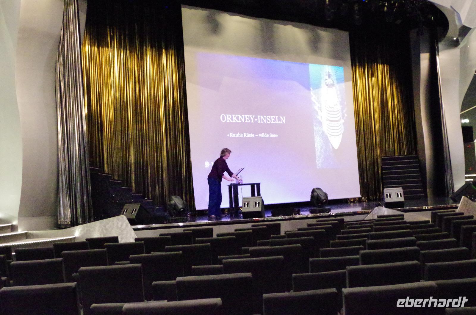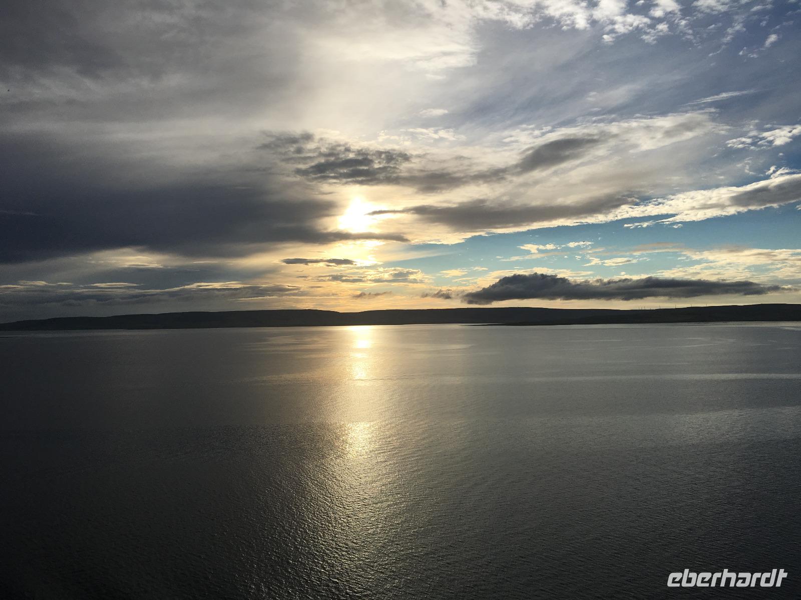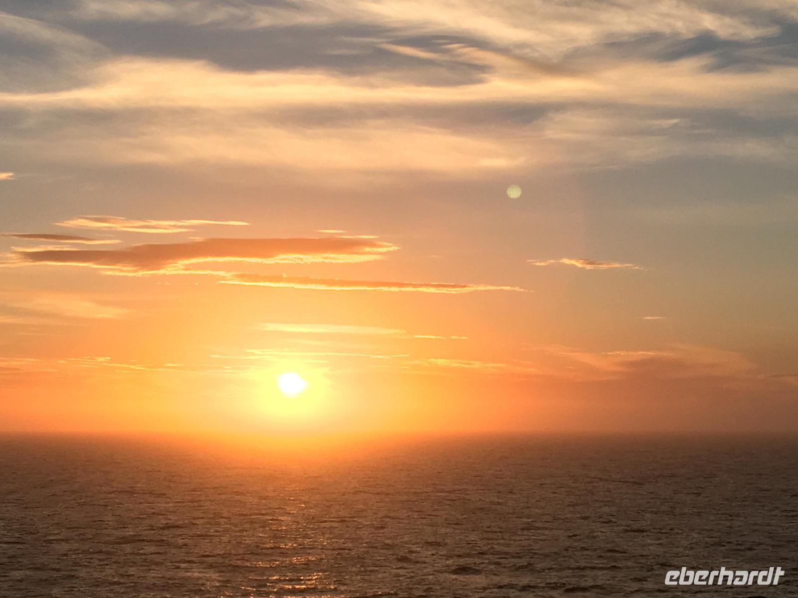 Wir haben eine wundervolle Zeit in Island verbracht, unsere Reise führt uns nun weiter zu den Orkney-Inseln. Heute gönnen wir uns aber zunächst einen entspannten Tag auf See. In der Nacht von Mittwoch zu Donnerstag sind zudem die Uhren eine Stunde vorzustellen. Frühstück ist wie immer ab 06.00 im Buffet-Restaurant "Inca & Maya" und ab 07.30 Uhr im Hauptrestaurant "The Golden Lobster" möglich. Bei leicht bewölktem Himmel mit bis zu 3 bis 12 Grad Celsius liegen rund 699 Seemeilen bis Kirkwall vor uns. Wer gern möchte, schaut um 09.30 Uhr bei der kulturhistorischen Bildpräsentation "Orkney-Inseln - rauhe Klippen und wilde Seen" von Lektorin Christina Linger im Platinum Theatre Deck 6 vorbei. Die Nacht und auch der Vormittag sind ein wenig stürmisch, auf den Geländern sind schon die Tüten für eventuelle Notfälle hinterlegt. Aufgrund des Wetters ist der Außenbereich abgesperrt und das eigentliche um 11.00 Uhr angesetzte Frühshoppen mit bayrischen Köstlichkeiten auf den letzten Tag auf See verschoben worden. Um 12.00 Uhr besteht die Möglichkeit im Buffet-Restaurant oder im Hauptrestaurant zu speisen. Die Eberhardt-Gäste sind heute wieder zu einer interessanten Präsentation von Eberhardt TRAVEL und der Reisebegleitung zu den "Orkney Inseln & Kirkwall" um 14.00 Uhr im "Sky & Stars" auf Deck 16 eingeladen. Der Nachmittag dient der weiteren Erholung und Entspannung ;o) Um 17.45 Uhr treffen wir uns zum gemeinsamen Abendessen im "The Golden Lobster", wo heute ein Gala-Abendessen stattfindet. Eine kleine Überraschung gibt es auch ;o) Viele kennen sicher die Eisbomben-Parade aus den "Traumschiff-Filmen", auch für uns wird der Raum abgedunkelt und schon marschieren die Kellner mit Eistorten und leuchtender Plastikkerze durch den Saal. Als Dessert können wir ein Stück diese Torte probieren, sie schmeckt uns wirklich ausgezeichnet! Das Unterhaltungsprogramm bietet um 21.00 Uhr die Show "Love me" im Platinum Theatre an. Um 22.30 Uhr können die Gäste dann bei "MSC Factor" in der Safari Lounge auf Deck 7 tanzen gehen.