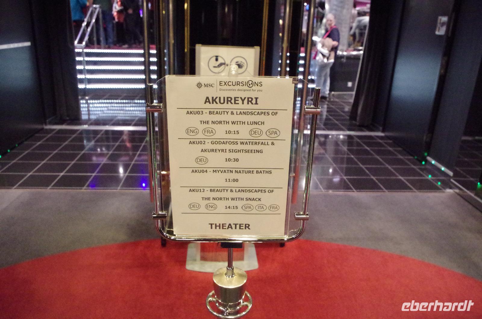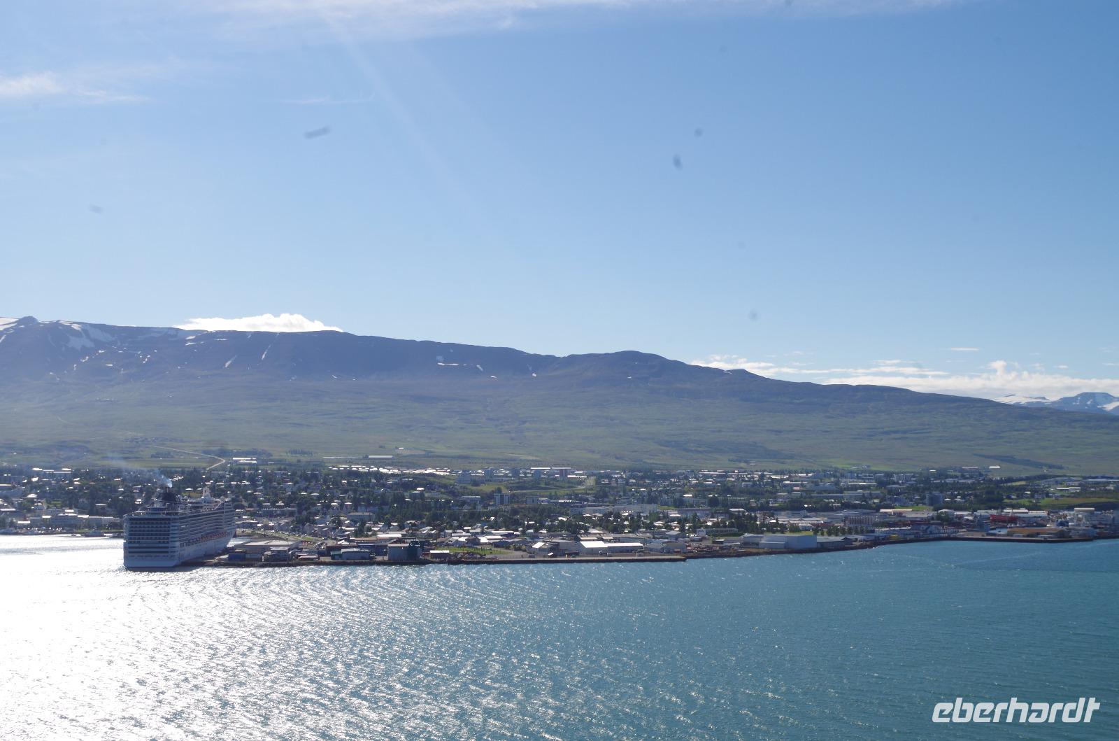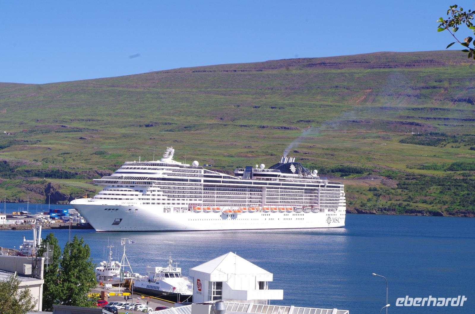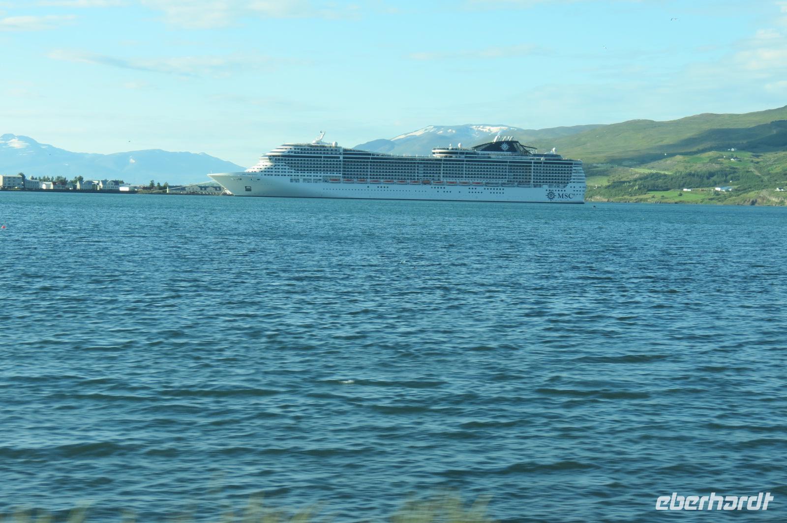 Auf einen Tag der Entspannung folgen drei spannende Ausflugstage in Island. Heute erreichen wir Akureyri, die "Hauptstadt von Nordisland" mit rund 17.304 Einwohnern. Sie ist nach Reykjavík die zweitgrößte Stadt Islands und wichtiges Fischereizentrum. Bereits ab 06.00 Uhr besteht die Möglichkeit, im Buffet-Restaurant zu frühstücken, um 07.30 Uhr dann auch im "The Golden Lobster". Wir haben wunderbaren Sonnenschein und blauen Himmel. Mit 15 bis 19 Grad ist es für isländische Verhältnisse schon sehr warm. Für den Landgang ist die Mitnahme der Bordkarte ausreichend. In Island wird (fast) überall die Kreditkarte akzeptiert, vereinzelt kann auch mit Euro bezahlt werden, das Rückgabegeld ist dann in der Landeswährung Isländische Kronen ISK. Der aktuelle Kurs liegt bei 1 Euro zu 115 ISK. Um 10.00 Uhr erreichen wir Akureyri. Zu den interessanten Unternehmungen in Akureyri und Umgebung zählt unter anderem der Besuch des Godafoss. Der "Götterwasserfall" besteht aus zwei Wasserfällen mit einer Höhe von sechs beziehungsweise zwölf Metern. Im Fischerstädtchen Húsavik befindet sich ein tolles Walmuseum mit vielen aufschlussreichen Auskünften zu den unterschiedlichen Walarten sowie auch eine kleine idyllische Holzkirche. Die Halbinsel Tjörnes ist ein Nationalpark mit der auffälligen Felsenschlucht Àsbyrgi. Das Besondere ist die Hufeisen-Form der Felsen, zu denen es mehrere Sagen gibt. Nicht weit von Akureyri entfernt liegt der See Mývatn sowie der Pseudokrater in Skútustaðir, welcher lediglich das Aussehen mit einem echten Krater gemeinsam hat. Empfehlenswert ist vielleicht auch der Besuch des Lava-Labyrinths in Dimmuborgir. Mithilfe der Wegweiser besteht keine Gefahr, sich im Labyrinth zu verlaufen. Beim Spaziergang können die verschiedenen Felsformationen bestaunt werden, welche mit viel Fantasie auch bestimmten Figuren ähneln sollen. Zudem ist das "Loch des 21. Dezembers" zu sehen. Seinen Namen hat dieses große Loch in einer Felswand daher erhalten, dass die Sonne nur am 21. Dezember komplett das ganze Loch ausfüllt. Für Entspannung und Erholung dient die kleinen Badelandschaft Jardbödin mit einem entspannten Bad im bis zu 40 Grad heißem Wasser. Spannend ist sicherlich auch das Hochtemperaturgebiet Námaskard mit seinen 70 bis 80 Grad kochenden Schlammquellen und Solfataren. Der nächstgelegene bekannte Wasserfall ist neben dem Godafoss der Dettifoss, dessen Größe und enorme Wasserkraft wirklich überwältigend ist. Unsere Gäste haben abermals unterschiedliche Ausflüge gebucht. Zu empfehlen sind AKU01 "Wasserfall der Götter und Laufas Museum", AKU02 "Godafoss Wasserfall und Besichtigung von Akureyri", AKU03 "Landschaftliche Reize im Norden", AKU04 "Myvatn Naturbäder" und AKU07 "Walsafari Húsavík". Für diejenigen Gäste, welche nicht die Möglichkeit gehabt haben, einen Ausflug in Akureyri an Bord zu buchen, bietet die Reisebegleitung an, individuell die Stadt zu besichtigen und eventuell mit einem örtlichen Reiseveranstalter zum Wasserfall Godafoss zu fahren. Wir treffen uns um 11.00 Uhr an der Rezeption auf Deck 5. Im Hafen angekommen warten bereits kleine Busse und Großraumtaxis auf die Touristen, der Preis für die Fahrt ist verhandelbar und kann auch in Euro bezahlt werden. Für einen Besuch am Morgen sind wir zu spät dran, so dass wir uns um 14.00 Uhr für eine Fahrt zum Godafoss verabreden. Die Stadt Akureyri ähnelt eher einer Kleinstadt im Vergleich zu deutschen Städten. Das Zentrum ist schnell erreicht. Wir besichtigen unter anderem die zwei Kirchen und spazieren durch den botanischen Garten. Das Mittagessen gönnen wir uns dann an Bord der MSC Preziosa. Gegen 14.00 Uhr treffen sich vier Reisegäste und eine Reisebegleitung im Hafen, um zum Godafoss zu fahren. Wir sind die einzigen Gäste am Nachmittag, also eine private Fahrt mit englischsprachigen Fahrer und zugleich Reiseführer ;-) Die Übersetzung erfolgt vorrangig durch die Reisebegleitung. Unterstützt wird sie netterweise durch einen Reisegast, welcher seine Englischkenntnisse verbessern möchte. Wir fahren rund 30 bis 45 Minuten zum Wasserfall. Am Godafoss angekommen haben wir rund 45 Minuten Zeit für eine individuelle Besichtigung dieses großartigen Wasserfalls. Wir können sogar einen kleinen Regebogen sehen. Danach fahren wir wieder zum Hafen zurück. Wer möchte, kann das kostenfreie WLAN direkt am Hafen nutzen. Die Gäste müssen sich lediglich mit ihrer E-Mail-Adresse anmelden. Am Abend treffen wir uns zur gewohnten Uhrzeit mit den anderen Reisegästen zum Essen und auch zum Austausch unserer spannenden Erlebnisse. Um 21.00 Uhr starten wir von Akureyri Richtung Ísafjörður. Am späten Abend findet die Show "Wonderland" im Theater statt. In der Safari Lounge um 22.45 Uhr können sich die Gäste den Tanzprofis MSC Preziosa International Dancers anschließen und beim Stardust-Wettbewerb ihre Tanzkünste vorführen. Wir freuen uns aber auch schon auf morgen, wenn wir die tolle Kleinstadt Ísafjörður besuchen werden. Nun liegt aber noch eine Fahrt von rund 186 Seemeilen vor uns.