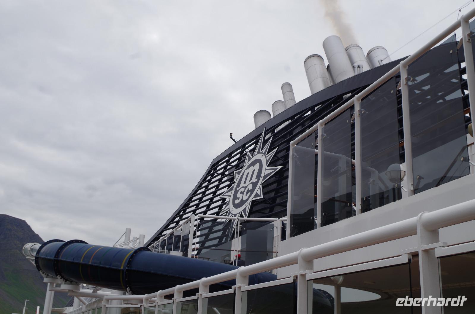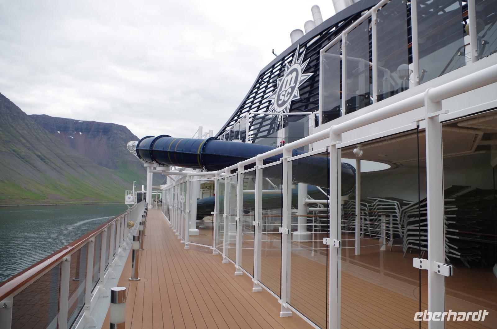 Wieder ein Tag zum Entspannen und Erholen auf See :-) Obwohl wir alle diese Tage individuell gestalten können, ist es doch sehr schön, einige Mahlzeiten oder Veranstaltungen gemeinsam zu besuchen. Wir haben rund 7 bis 11 Grad bei leicht bewölktem Himmel. In der Nacht sind die Uhren eine weitere Stunde zurückzustellen. Eine Erinnerung daran erhalten wir im heutigem Tagesprogramm ;-) Das Frühstücksbuffet im Restaurant "Inca & Maya" auf Deck 14 startet um 06.00 Uhr mit dem Frühaufsteher Frühstück und um 06.30 Uhr mit dem Frühstücksbuffet. Das Frühstück ist sehr lecker und bietet von herzhaft über süß und fruchtig eine gute Auswahl. Heute sind abermals die Uhren eine weitere Stunde zurückzustellen. Danach treffen sich einige Gäste um 09.30 Uhr im Platinum Theatre zur kulturhistorischen Bildpräsentation "Island. Feuer, Eis und Farbenspiel" von Lektorin Christina Linger. Um 11.00 Uhr findet im Rezeptionsbereich auf Deck 5, 6 und 7 die Arktische Polarkreis Taufe statt. Wenig später erfahren wir im Platinum Theatre vom International Host Nils in seinem Vortrag "Die Werft und die Perlen von MSC", wie MSC Kreuzfahrtschiffe gebaut werden. Im "The Golden Lobster" oder im Buffet-Restaurant "Inca & Maya" können wir uns ab 12.00 Uhr ein köstliches Mittagessen gönnen. Den Nachmittag gestalten die Gäste wieder individuell. Zur Erholung und Entspannung dienen die Indoor-Pools oder auch die Außenpools mit fantastischem Blick auf das weite Meer. Zudem werden verschiedene Tanz- und Sportkurse, mehrere Quizspiele, Italienisch Unterricht oder auch Bingo angeboten ;-) Zur gewohnten Uhrzeit treffen wir uns um 17.45 Uhr zum gemeinsamen Abendessen im "The Golden Lobster". Nach einem vorzüglichen Dinner schauen wir uns um 19.00 Uhr oder erst um 21.00 Uhr im Platinum Theatre die Show "Italian Classics" an. Später findet in der Safari Lounge um 22.30 Uhr die "Mediterranean Night" mit Musik, Tanz und Folklore aus dem Mittelmeerraum statt. Den Abend lassen wir bei leckeren Cocktails, Wein und Bier ausklingen. Weiter erhalten wir in unserem Tagesprogramm nautische Informationen zur Fahrt nach Island. Eine Überquerung des arktischen Polarkreises ist für 02.00 Uhr vorgesehen. Der arktische Polarkreis liegt bei einem Breitengrad von 66°33' N. Danach sollen wir gegen 06.00 Uhr in den Eyja Fjord mit einer Länge von rund 99 Kilometern einfahren