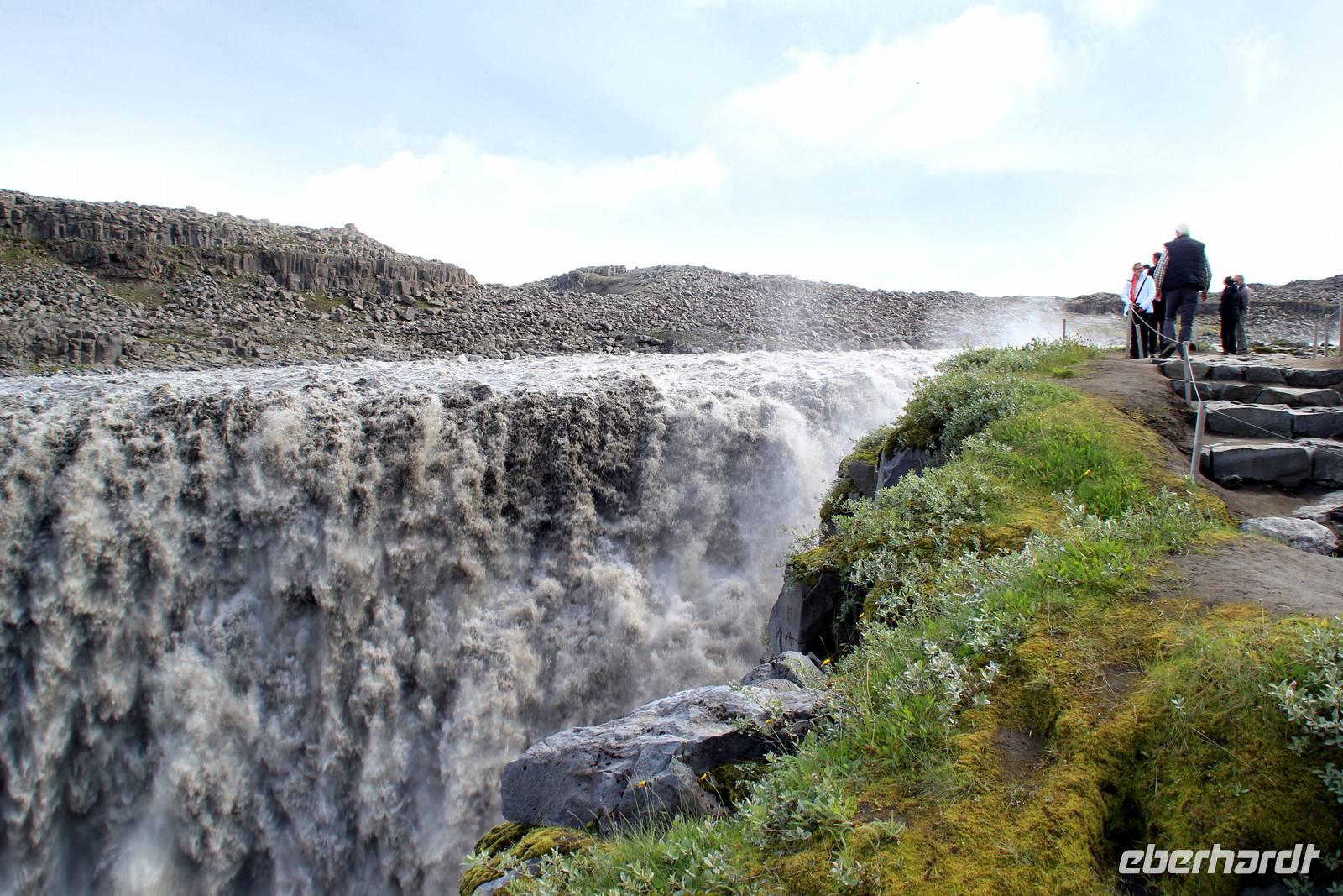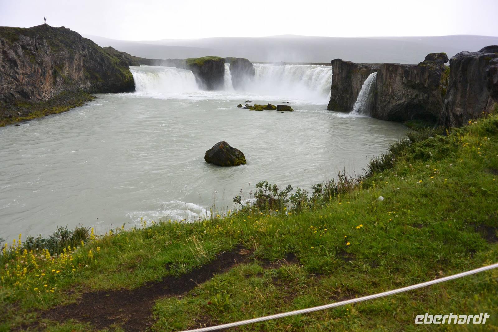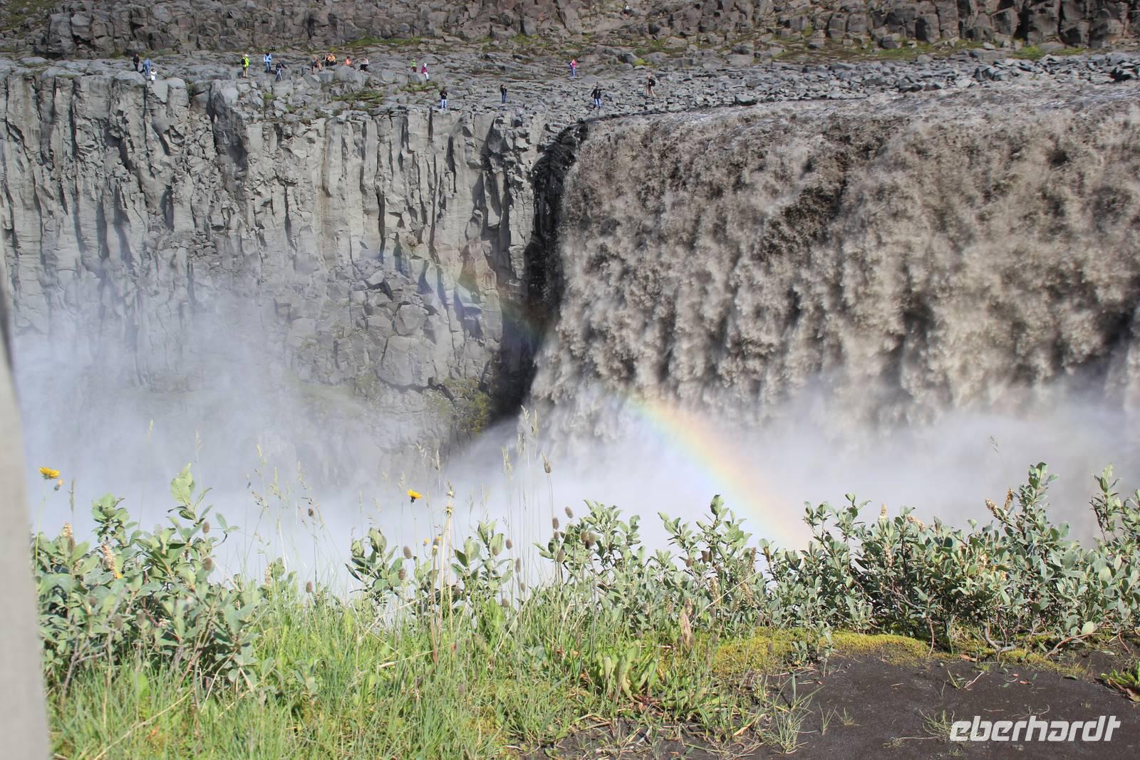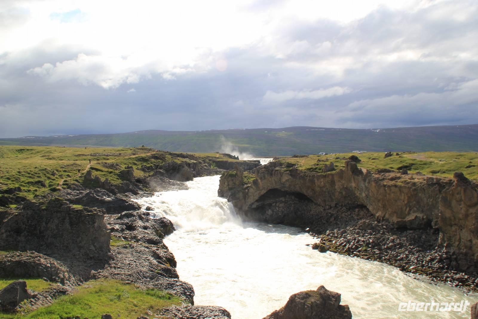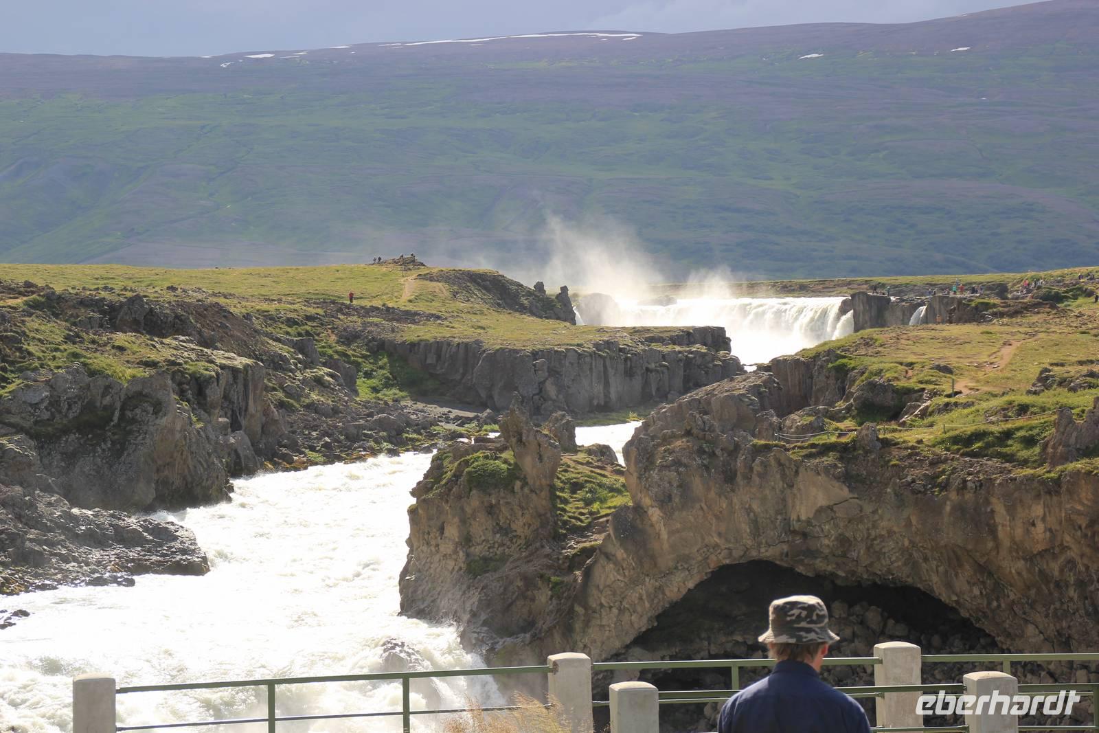 Den heutigen Tag starten wir mit einem Frühstück und Sonnenschein. Wir fahren kurz durch Akureyri und erhalten später einen tollen Blick von der anderen Seite des Fjordes auf die Stadt im Norden von Island. Unser erstes Ziel der heutigen Panoramafahrt ist Husavik, ein kleines hübsches Fischerstädtchen auf der Halbinsel Tjörnes. Wir haben Zeit für einen kleinen Bummel und kleinere Shoppingmöglichkeiten. Der nächste Halt ist ein wenig enttäuschend für die Vogelfreunde unter uns, denn der berühmte Papageitaucher lässt sich leider nicht in unserer Nähe sehen. Während wir weiter nach Asbyrgi fahren, erfahren wir von Rosa, wie Eisbären nach Island gelangen können. Dort angekommen nutzen wir das schöne Wetter und halten unsere Mittagspause auf der Terrasse des Besucherzentrums, von wo aus man einen tollen Blick auf die Ausläufer der Felsenschlucht hat. Diese hat die Form eines Hufeisens und man sagt, Odins Pferd Sleipnir soll hier kräftig aufgetreten haben. Das wollen wir uns genauer ansehen und fahren direkt hinein. Imposante Felswände um uns herum lassen uns klein wirken. Auf unserer Rückfahrt nach Akureyri machen wir Halt an Islands bekanntestem Wasserfall, dem Godafoss. Da die Wassermassen nicht nur den Wasserfall hinunter stürzen sondern auch vom Himmel, haben wir nicht genügend Zeit, den Götterwasserfall in Ruhe zu genießen. Leider ist auch einer unserer Reisegäste bis zur Unterwäsche durchnässt worden...