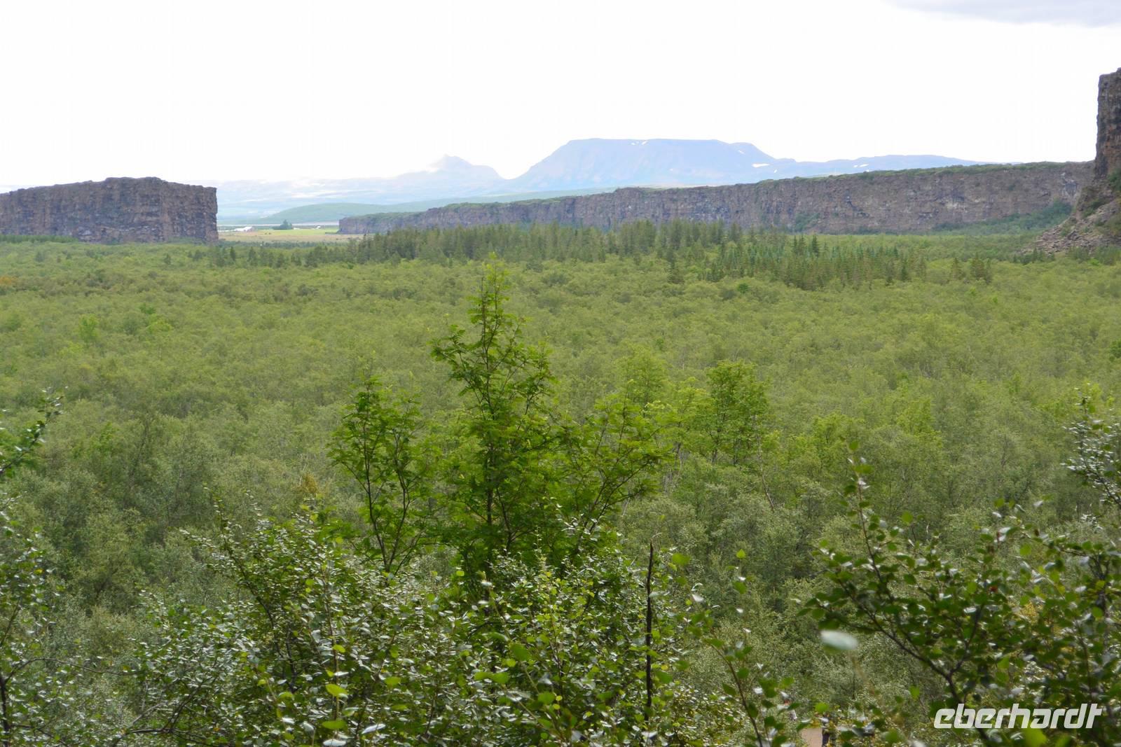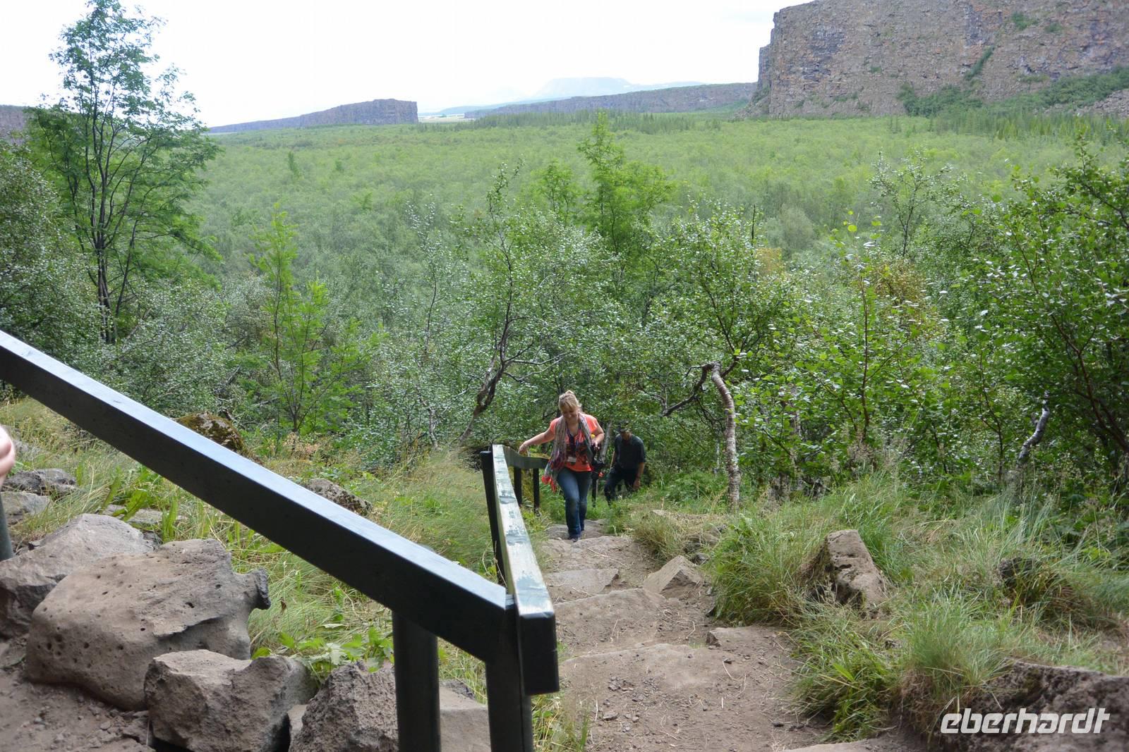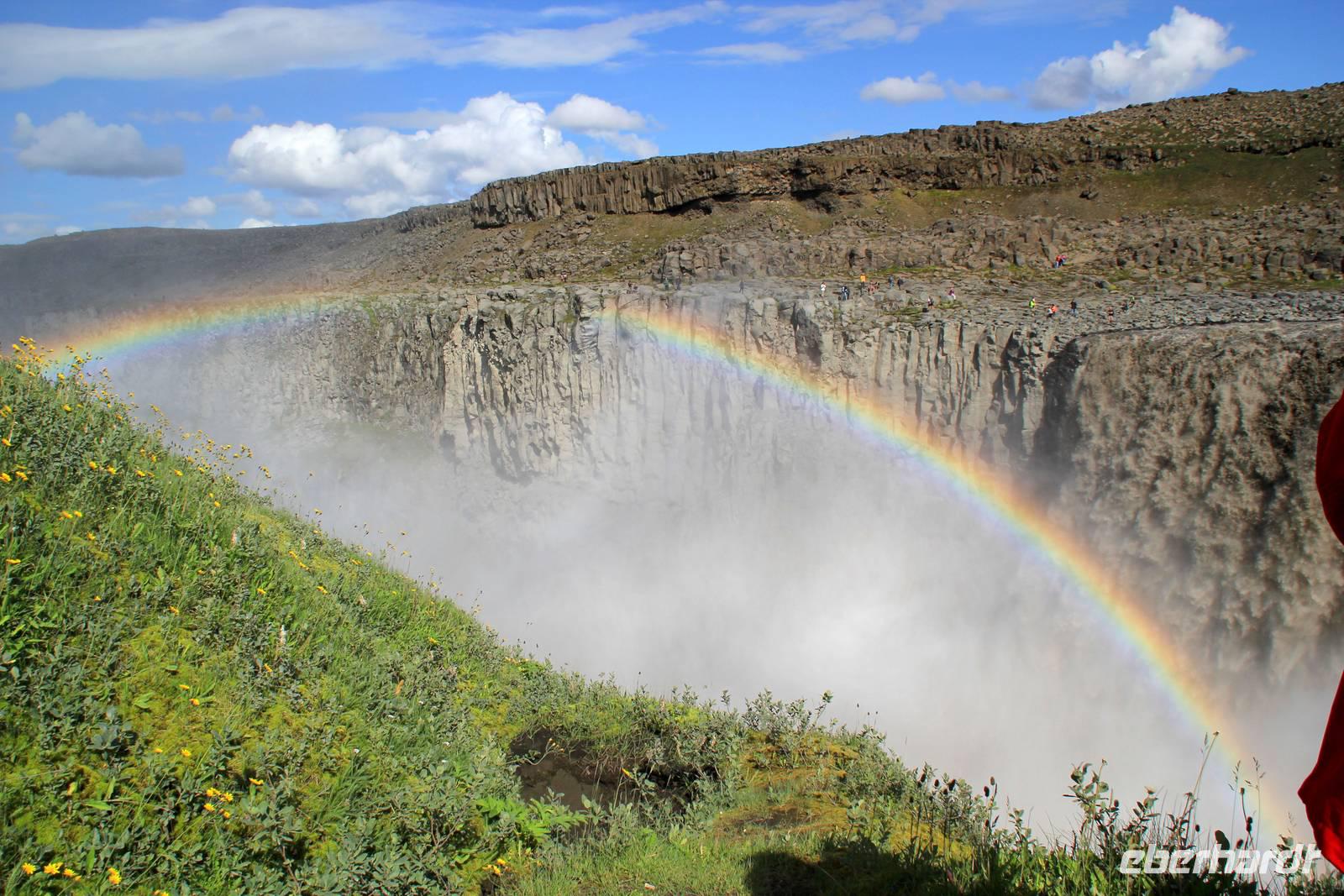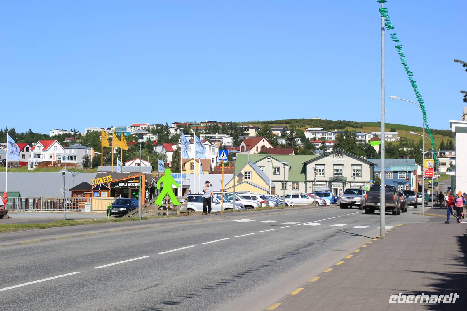 Den heutigen Tag starten wir mit einem Frühstück und Sonnenschein. Wir fahren kurz durch Akureyri und erhalten später einen tollen Blick von der anderen Seite des Fjordes auf die Stadt im Norden von Island. Unser erstes Ziel der heutigen Panoramafahrt ist Husavik, ein kleines hübsches Fischerstädtchen auf der Halbinsel Tjörnes. Wir haben Zeit für einen kleinen Bummel und kleinere Shoppingmöglichkeiten. Der nächste Halt ist ein wenig enttäuschend für die Vogelfreunde unter uns, denn der berühmte Papageitaucher lässt sich leider nicht in unserer Nähe sehen. Während wir weiter nach Asbyrgi fahren, erfahren wir von Rosa, wie Eisbären nach Island gelangen können. Dort angekommen nutzen wir das schöne Wetter und halten unsere Mittagspause auf der Terrasse des Besucherzentrums, von wo aus man einen tollen Blick auf die Ausläufer der Felsenschlucht hat. Diese hat die Form eines Hufeisens und man sagt, Odins Pferd Sleipnir soll hier kräftig aufgetreten haben. Das wollen wir uns genauer ansehen und fahren direkt hinein. Imposante Felswände um uns herum lassen uns klein wirken. Auf unserer Rückfahrt nach Akureyri machen wir Halt an Islands bekanntestem Wasserfall, dem Godafoss. Da die Wassermassen nicht nur den Wasserfall hinunter stürzen sondern auch vom Himmel, haben wir nicht genügend Zeit, den Götterwasserfall in Ruhe zu genießen. Leider ist auch einer unserer Reisegäste bis zur Unterwäsche durchnässt worden...