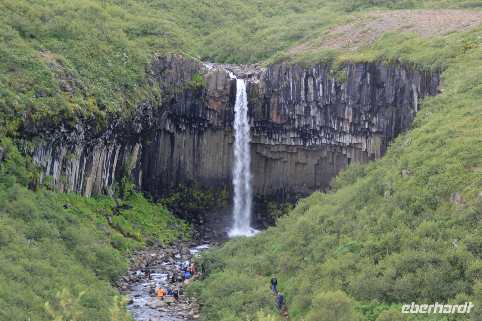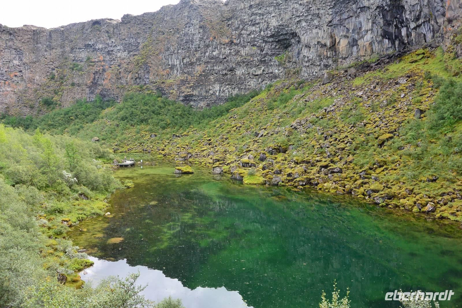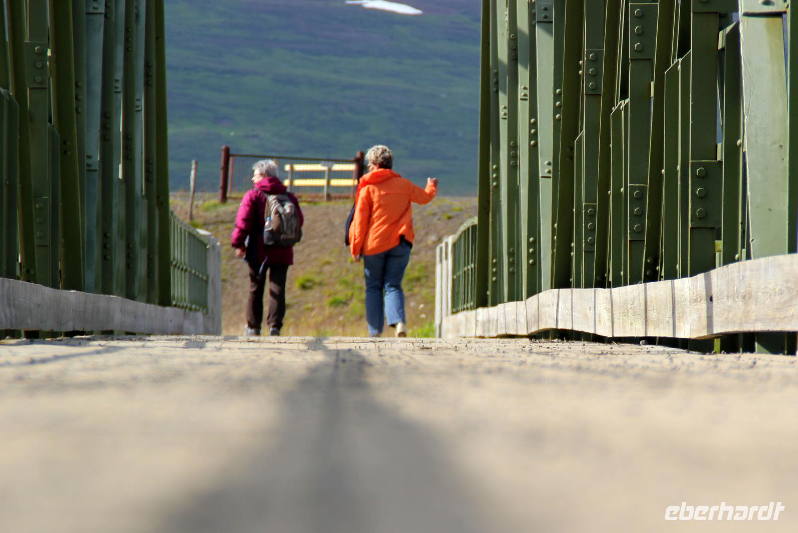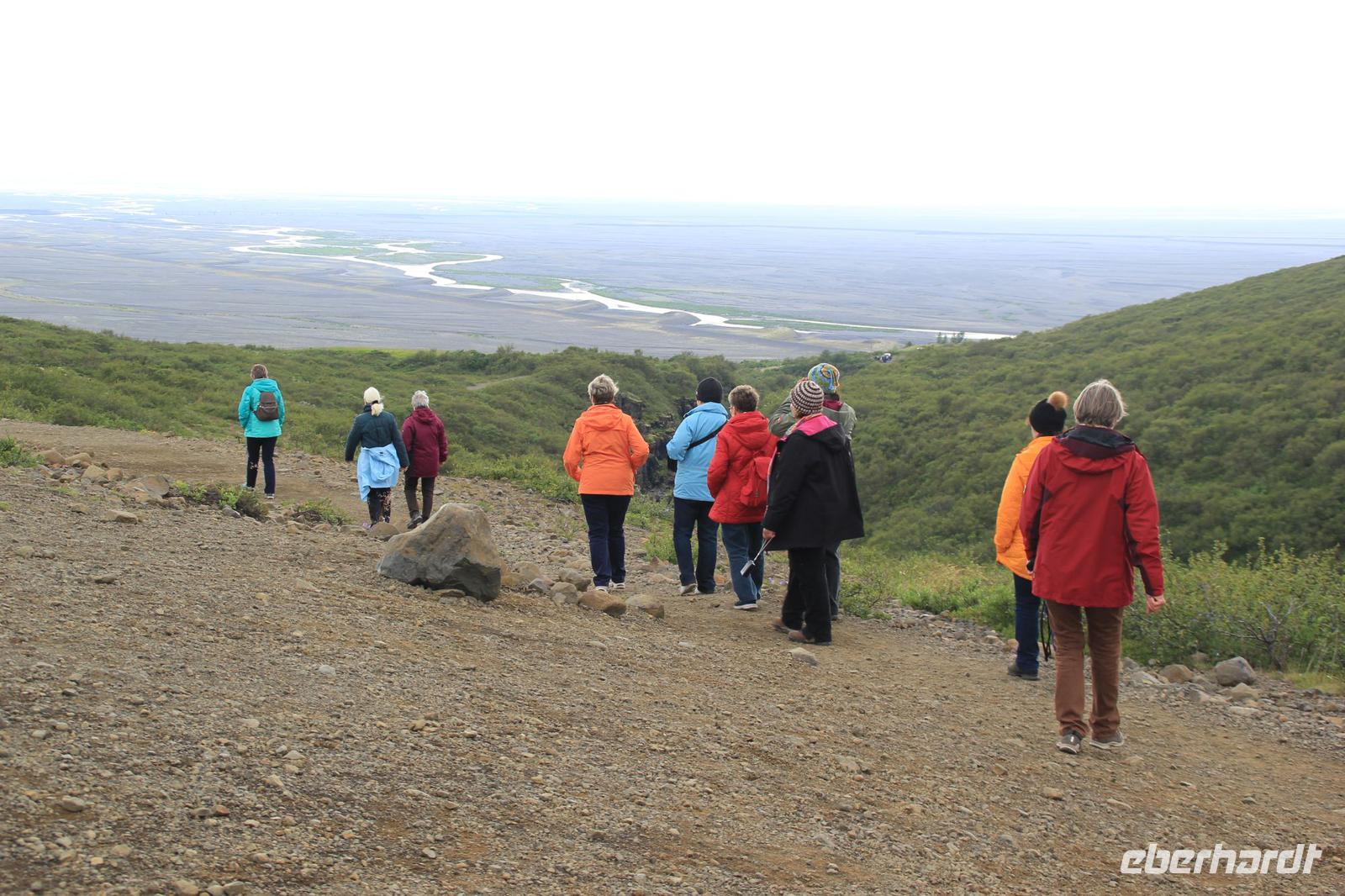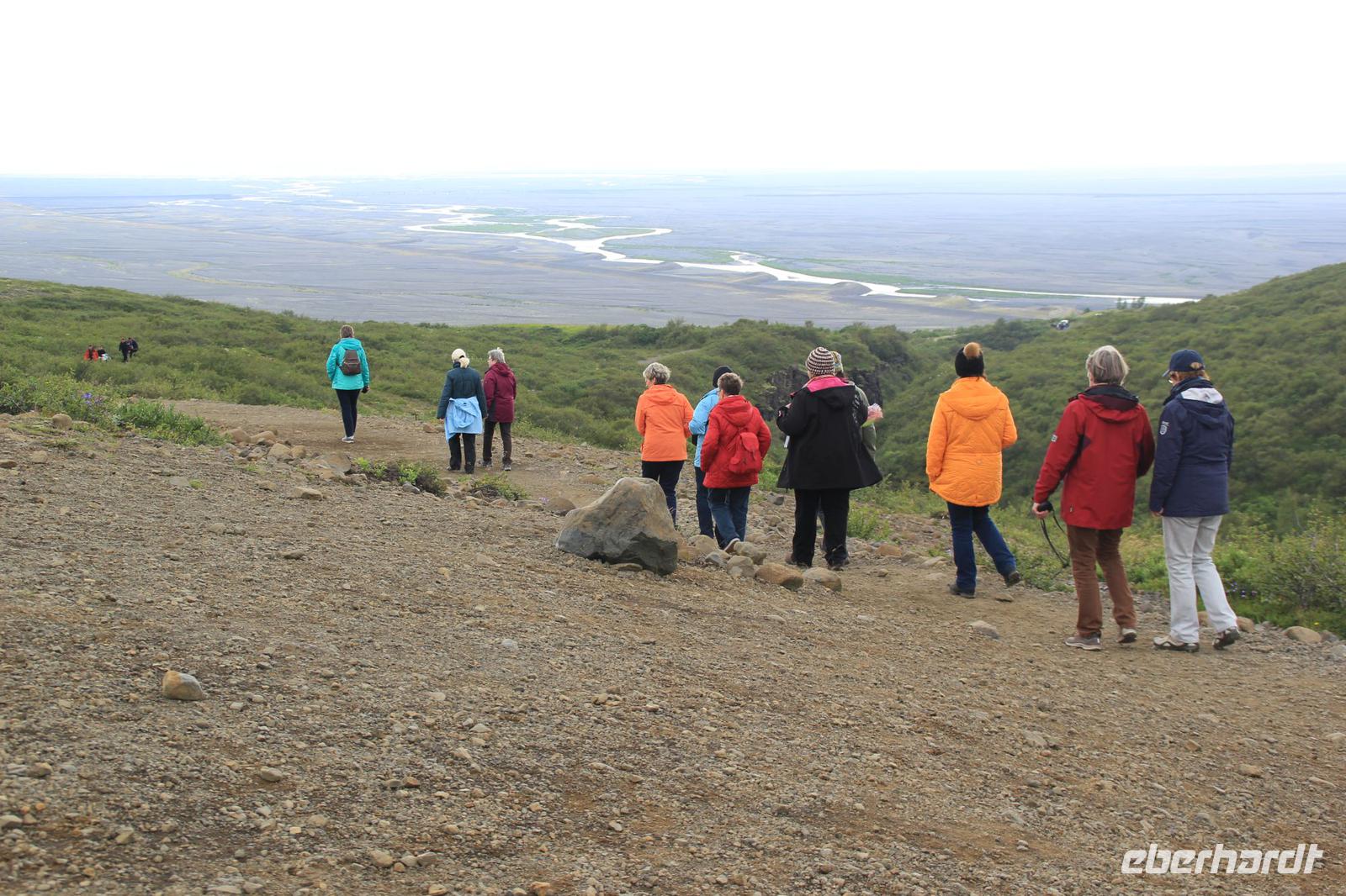 Den heutigen Tag starten wir mit einem Frühstück und Sonnenschein. Wir fahren kurz durch Akureyri und erhalten später einen tollen Blick von der anderen Seite des Fjordes auf die Stadt im Norden von Island. Unser erstes Ziel der heutigen Panoramafahrt ist Husavik, ein kleines hübsches Fischerstädtchen auf der Halbinsel Tjörnes. Wir haben Zeit für einen kleinen Bummel und kleinere Shoppingmöglichkeiten. Der nächste Halt ist ein wenig enttäuschend für die Vogelfreunde unter uns, denn der berühmte Papageitaucher lässt sich leider nicht in unserer Nähe sehen. Während wir weiter nach Asbyrgi fahren, erfahren wir von Rosa, wie Eisbären nach Island gelangen können. Dort angekommen nutzen wir das schöne Wetter und halten unsere Mittagspause auf der Terrasse des Besucherzentrums, von wo aus man einen tollen Blick auf die Ausläufer der Felsenschlucht hat. Diese hat die Form eines Hufeisens und man sagt, Odins Pferd Sleipnir soll hier kräftig aufgetreten haben. Das wollen wir uns genauer ansehen und fahren direkt hinein. Imposante Felswände um uns herum lassen uns klein wirken. Auf unserer Rückfahrt nach Akureyri machen wir Halt an Islands bekanntestem Wasserfall, dem Godafoss. Da die Wassermassen nicht nur den Wasserfall hinunter stürzen sondern auch vom Himmel, haben wir nicht genügend Zeit, den Götterwasserfall in Ruhe zu genießen. Leider ist auch einer unserer Reisegäste bis zur Unterwäsche durchnässt worden...