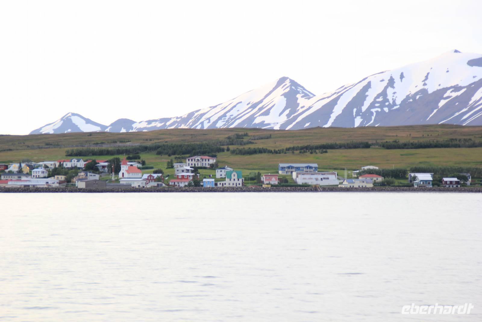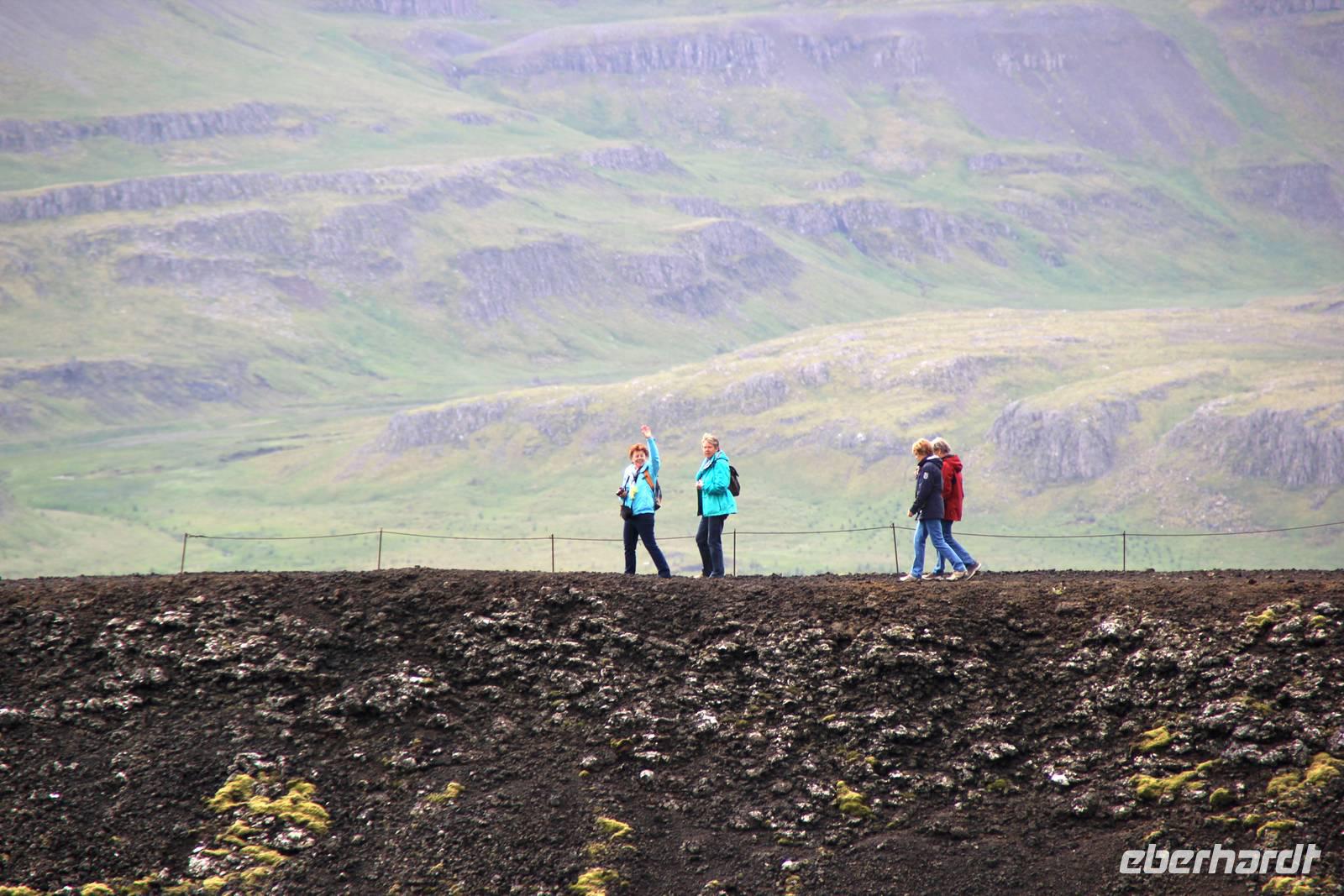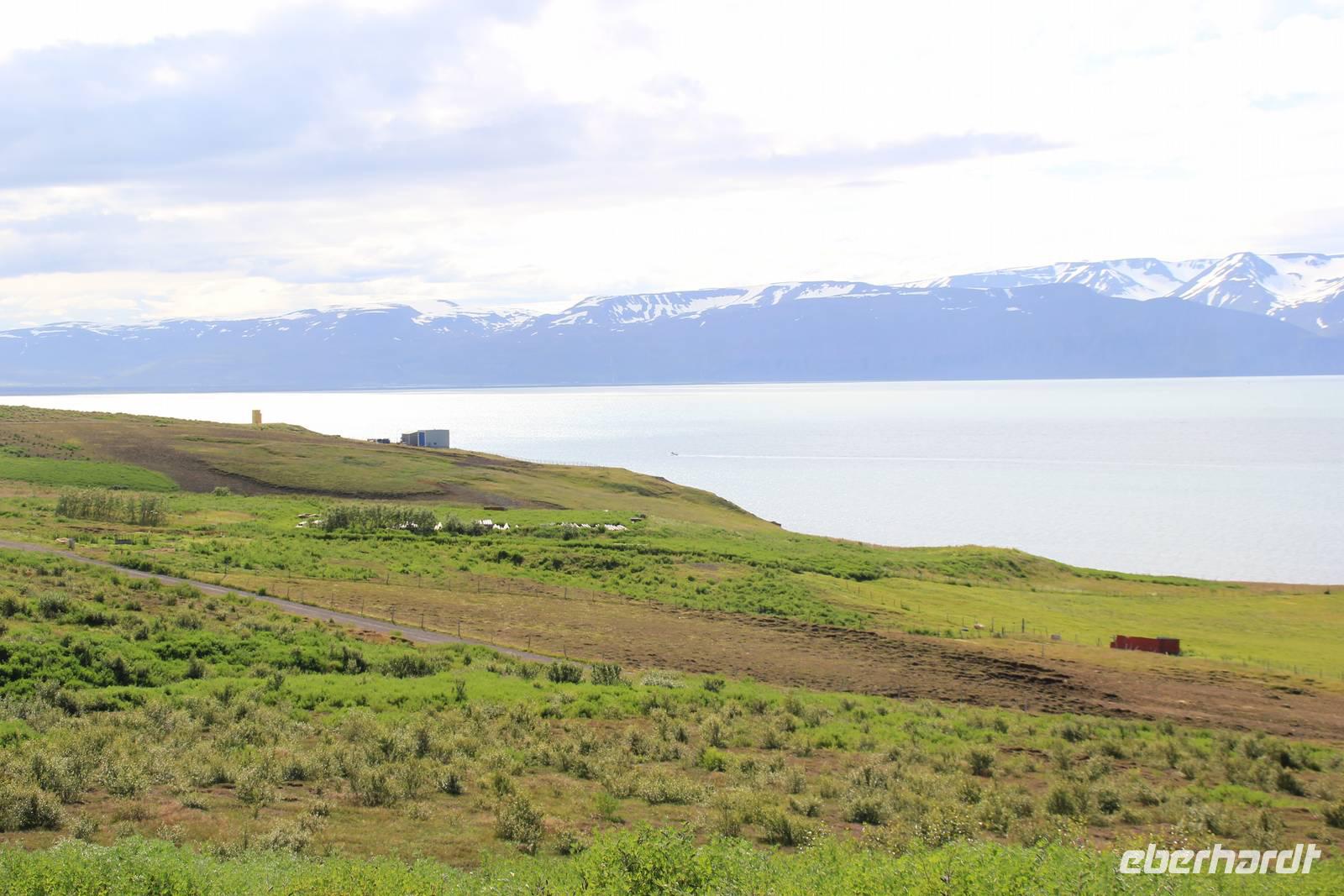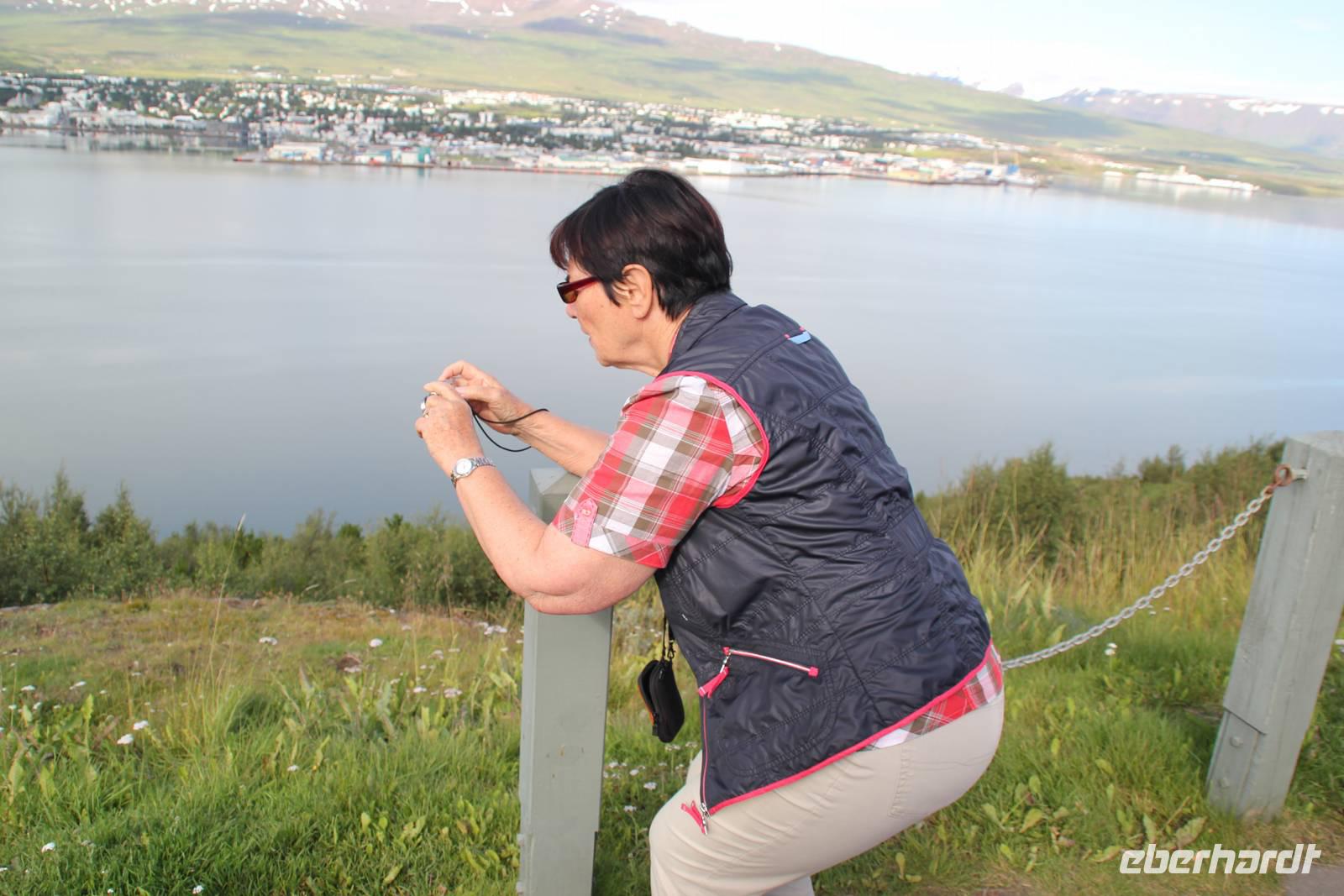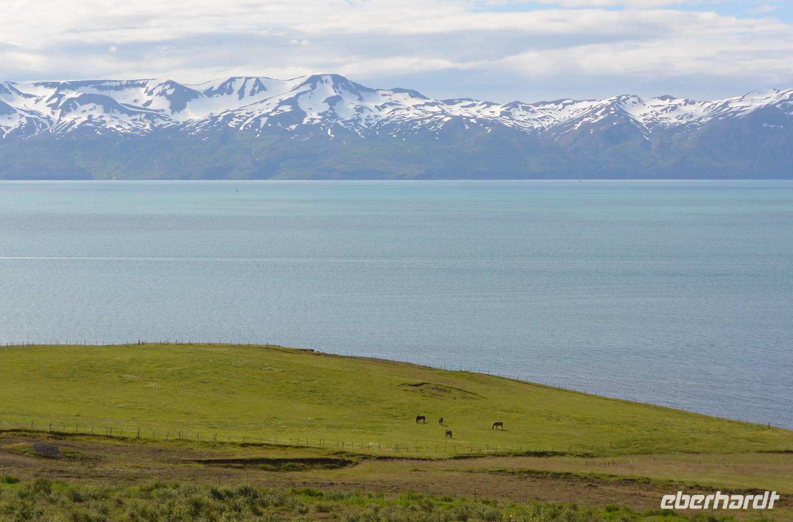 Nachdem in der Nacht der letzte Gast das Hotel erreicht hat, ist unsere Reisegruppe zum Frühstück mit 18 Personen vollständig. Rosa holt uns mit unserem neuen Busfahrer Olaf ab und die Fahrt in Richtung Norden geht los. Wir fahren durch den 5770 Meter langen Walfjord-Tunnel, welcher 165 Meter unter dem Meer liegt. Unser erster Stopp ist in dem kleinen Städtchen Borgarnes, wo erste Postkarten gekauft werden. Die Fahrt geht weiter nördlich in das Nordurartal, wo wir den erloschenen Vulkan-Krater Grabrok besteigen. Ein toller Ausblick in die Umgebung bietet sich uns. Danach fahren wir zu Anna und ihrer Islandpferdezucht. Sie zeigt uns ihre Pferde, den Hof und die Stallungen, erklärt uns die 5 verschiedenen Gangarten Schritt, Trab, Galopp, Tölt und Pass, welche wir live vorgeführt bekommen und erfahren viel über das isländische Leben von ihr und ihrer Familie bei Kaffee und leckerem Gebäck. Auf unserer Weiterfahrt erfahren wir von Rosa viele Geschichten über Elfen und Trolle. Fotostopp in der Hochebene von Holtavörduheidi und weiter in Richtung Akureyri. Nachdem wir zum späten Nachmittag die zweitgrößte Stadt Islands erreicht und unsere Zimmer bezogen haben, hat jeder genug Zeit, die kleine Stadt auf eigene Faust zu erkunden. Nach dem unglaublich reichhaltigen Buffet im Edda Hotel wartet ein weiterer Höhepunkt für den Großteil der Reisegruppe auf uns am Abend. Wir fahren mit dem Schiff auf den Fjord Eyjafjördur und schon bald erblicken wir Buckelwale, Schweinswale und Delphine in dieser unglaublich schönen Fjordbucht, während am Hochizont die Sonne versucht unter zu gehen. Unser Guide Andy hat ein Adlerauge und zeigt uns sofort, wenn die typischen Fontänen oder Rückenflossen an der Meeresoberfläche zu sehen sind. Tief beeindruckt von diesem Naturschauspiel fahren wir zurück zum Hotel.