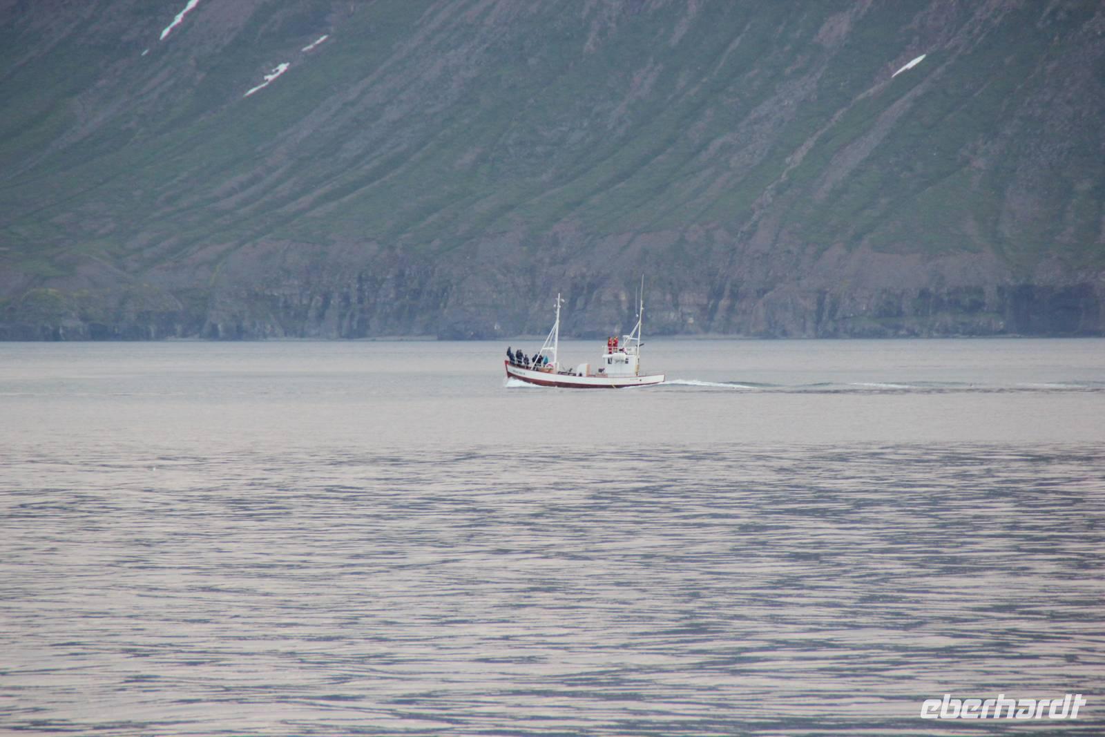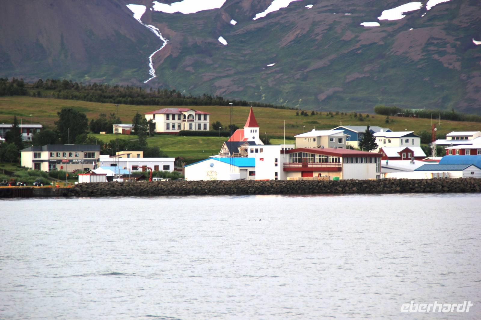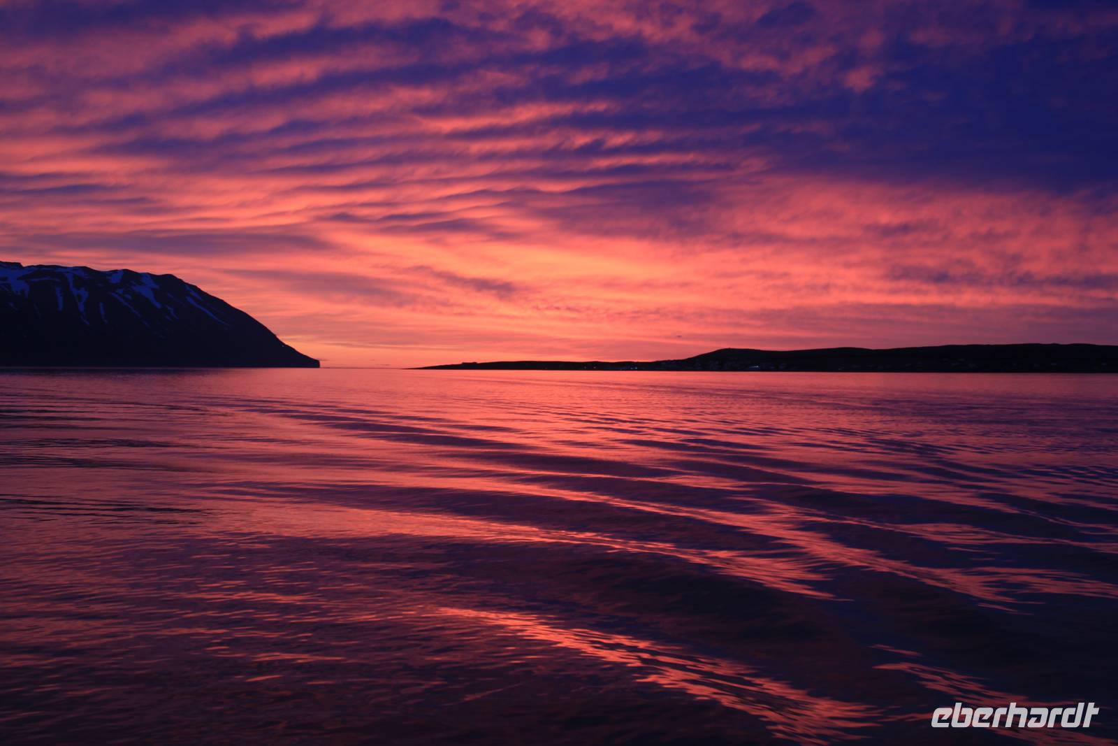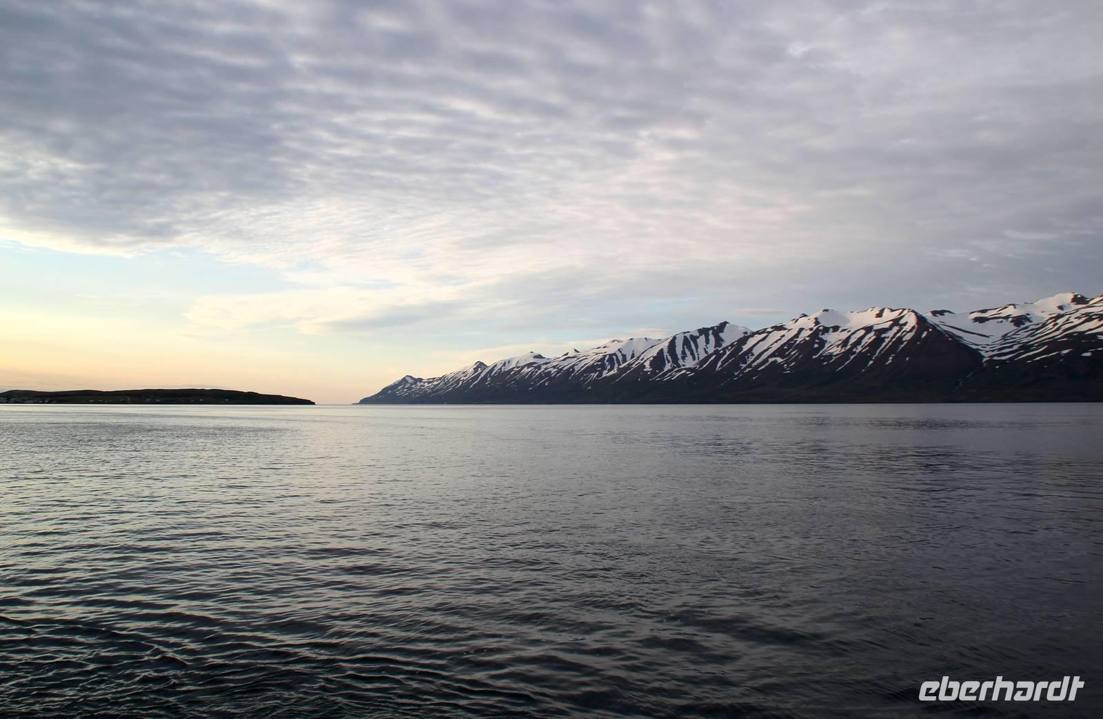 Nachdem in der Nacht der letzte Gast das Hotel erreicht hat, ist unsere Reisegruppe zum Frühstück mit 18 Personen vollständig. Rosa holt uns mit unserem neuen Busfahrer Olaf ab und die Fahrt in Richtung Norden geht los. Wir fahren durch den 5770 Meter langen Walfjord-Tunnel, welcher 165 Meter unter dem Meer liegt. Unser erster Stopp ist in dem kleinen Städtchen Borgarnes, wo erste Postkarten gekauft werden. Die Fahrt geht weiter nördlich in das Nordurartal, wo wir den erloschenen Vulkan-Krater Grabrok besteigen. Ein toller Ausblick in die Umgebung bietet sich uns. Danach fahren wir zu Anna und ihrer Islandpferdezucht. Sie zeigt uns ihre Pferde, den Hof und die Stallungen, erklärt uns die 5 verschiedenen Gangarten Schritt, Trab, Galopp, Tölt und Pass, welche wir live vorgeführt bekommen und erfahren viel über das isländische Leben von ihr und ihrer Familie bei Kaffee und leckerem Gebäck. Auf unserer Weiterfahrt erfahren wir von Rosa viele Geschichten über Elfen und Trolle. Fotostopp in der Hochebene von Holtavörduheidi und weiter in Richtung Akureyri. Nachdem wir zum späten Nachmittag die zweitgrößte Stadt Islands erreicht und unsere Zimmer bezogen haben, hat jeder genug Zeit, die kleine Stadt auf eigene Faust zu erkunden. Nach dem unglaublich reichhaltigen Buffet im Edda Hotel wartet ein weiterer Höhepunkt für den Großteil der Reisegruppe auf uns am Abend. Wir fahren mit dem Schiff auf den Fjord Eyjafjördur und schon bald erblicken wir Buckelwale, Schweinswale und Delphine in dieser unglaublich schönen Fjordbucht, während am Hochizont die Sonne versucht unter zu gehen. Unser Guide Andy hat ein Adlerauge und zeigt uns sofort, wenn die typischen Fontänen oder Rückenflossen an der Meeresoberfläche zu sehen sind. Tief beeindruckt von diesem Naturschauspiel fahren wir zurück zum Hotel.