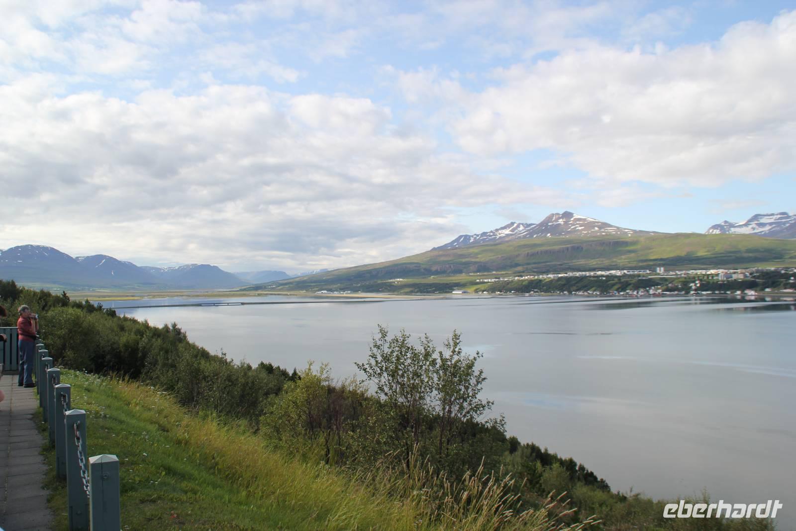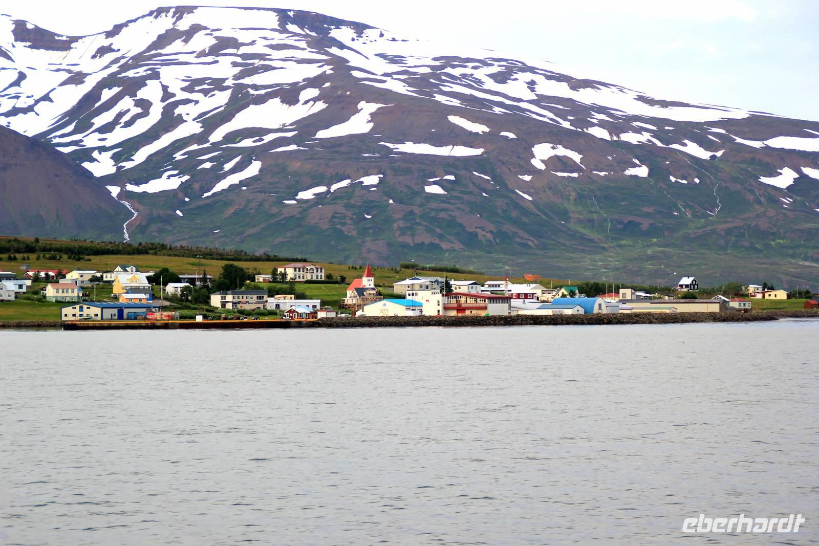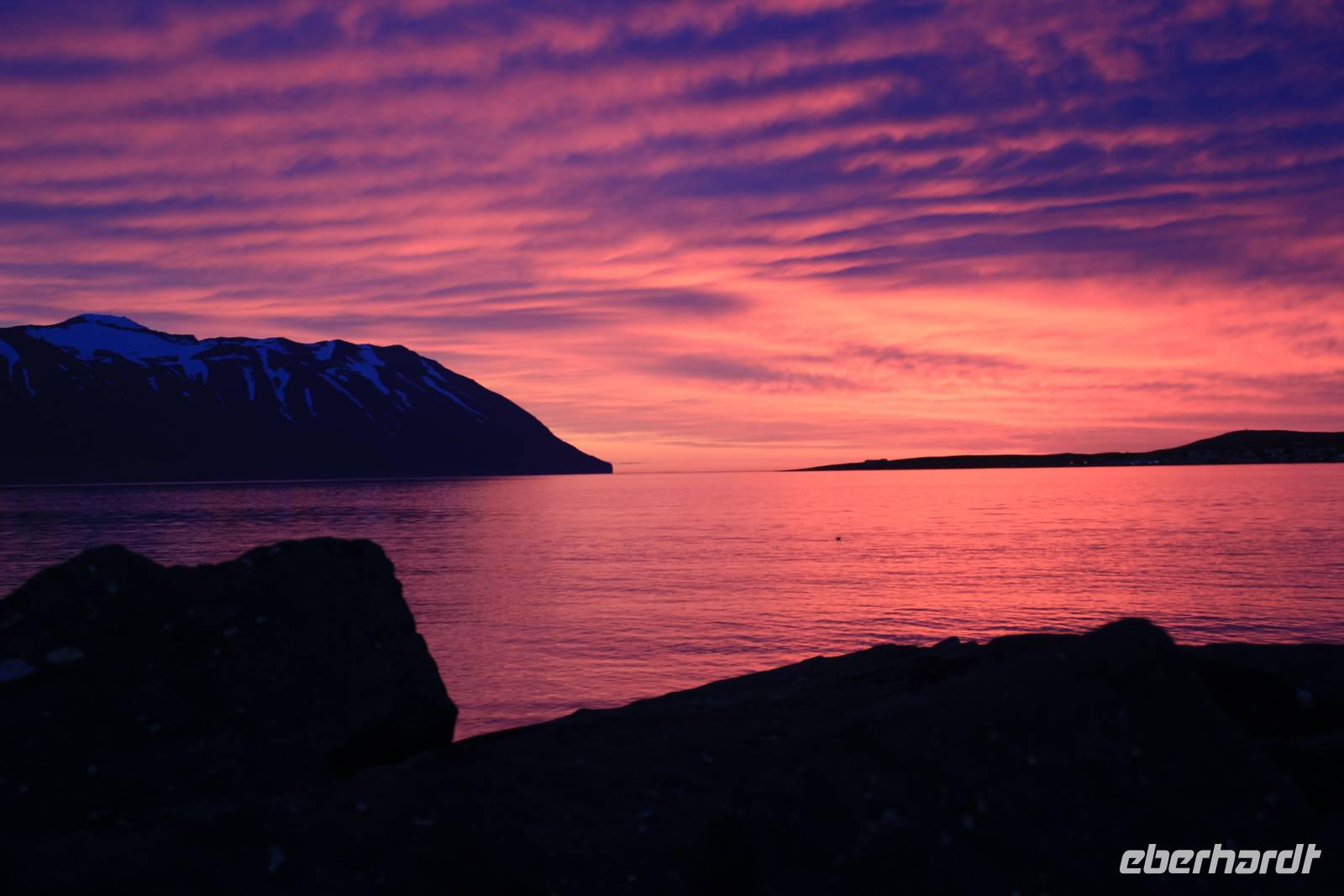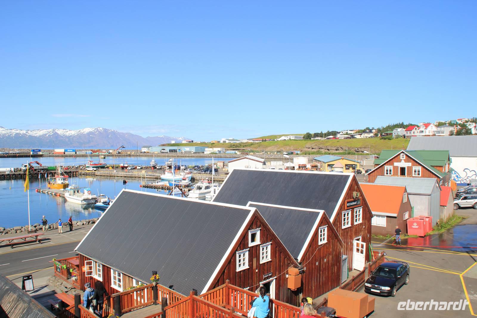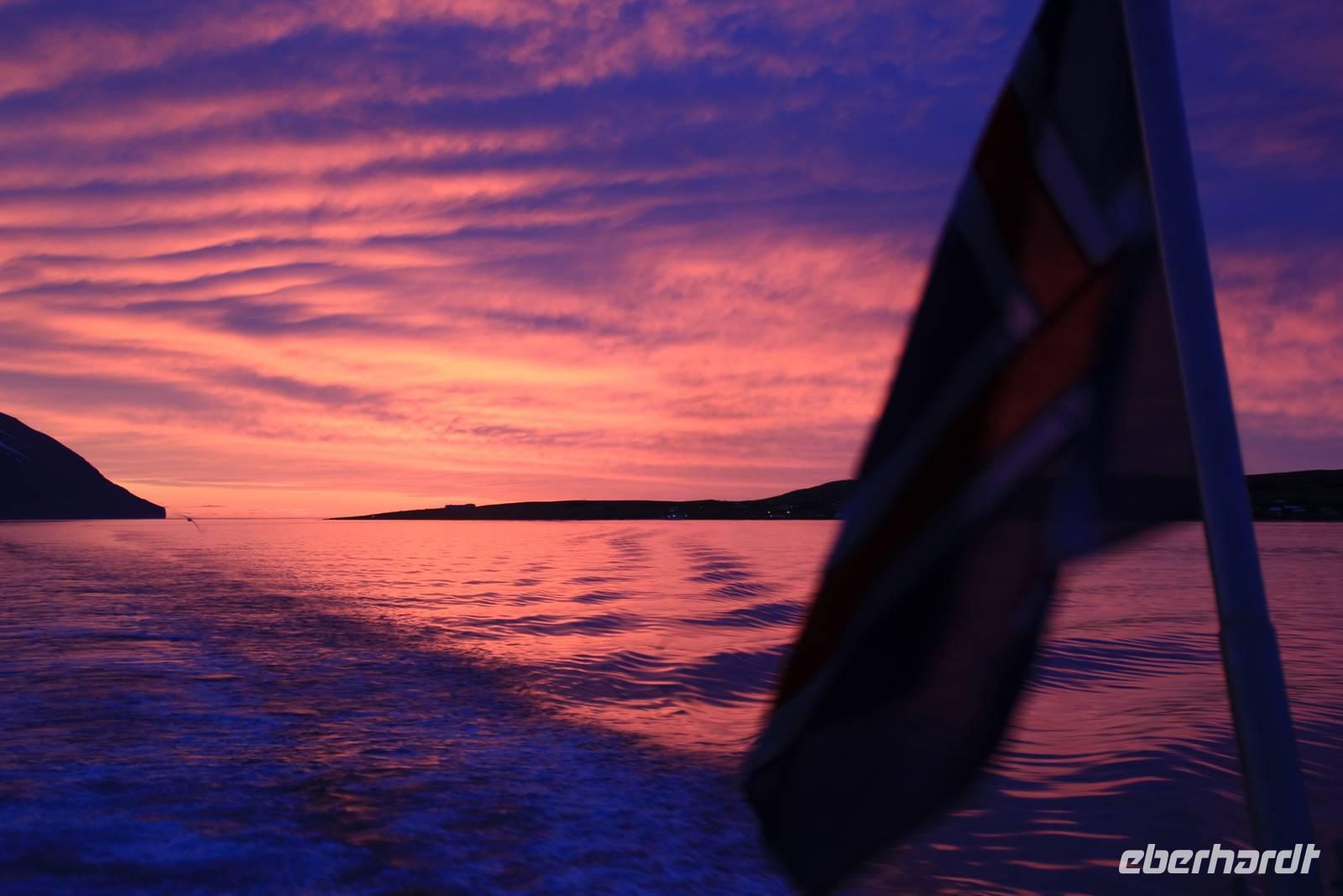 Nachdem in der Nacht der letzte Gast das Hotel erreicht hat, ist unsere Reisegruppe zum Frühstück mit 18 Personen vollständig. Rosa holt uns mit unserem neuen Busfahrer Olaf ab und die Fahrt in Richtung Norden geht los. Wir fahren durch den 5770 Meter langen Walfjord-Tunnel, welcher 165 Meter unter dem Meer liegt. Unser erster Stopp ist in dem kleinen Städtchen Borgarnes, wo erste Postkarten gekauft werden. Die Fahrt geht weiter nördlich in das Nordurartal, wo wir den erloschenen Vulkan-Krater Grabrok besteigen. Ein toller Ausblick in die Umgebung bietet sich uns. Danach fahren wir zu Anna und ihrer Islandpferdezucht. Sie zeigt uns ihre Pferde, den Hof und die Stallungen, erklärt uns die 5 verschiedenen Gangarten Schritt, Trab, Galopp, Tölt und Pass, welche wir live vorgeführt bekommen und erfahren viel über das isländische Leben von ihr und ihrer Familie bei Kaffee und leckerem Gebäck. Auf unserer Weiterfahrt erfahren wir von Rosa viele Geschichten über Elfen und Trolle. Fotostopp in der Hochebene von Holtavörduheidi und weiter in Richtung Akureyri. Nachdem wir zum späten Nachmittag die zweitgrößte Stadt Islands erreicht und unsere Zimmer bezogen haben, hat jeder genug Zeit, die kleine Stadt auf eigene Faust zu erkunden. Nach dem unglaublich reichhaltigen Buffet im Edda Hotel wartet ein weiterer Höhepunkt für den Großteil der Reisegruppe auf uns am Abend. Wir fahren mit dem Schiff auf den Fjord Eyjafjördur und schon bald erblicken wir Buckelwale, Schweinswale und Delphine in dieser unglaublich schönen Fjordbucht, während am Hochizont die Sonne versucht unter zu gehen. Unser Guide Andy hat ein Adlerauge und zeigt uns sofort, wenn die typischen Fontänen oder Rückenflossen an der Meeresoberfläche zu sehen sind. Tief beeindruckt von diesem Naturschauspiel fahren wir zurück zum Hotel.