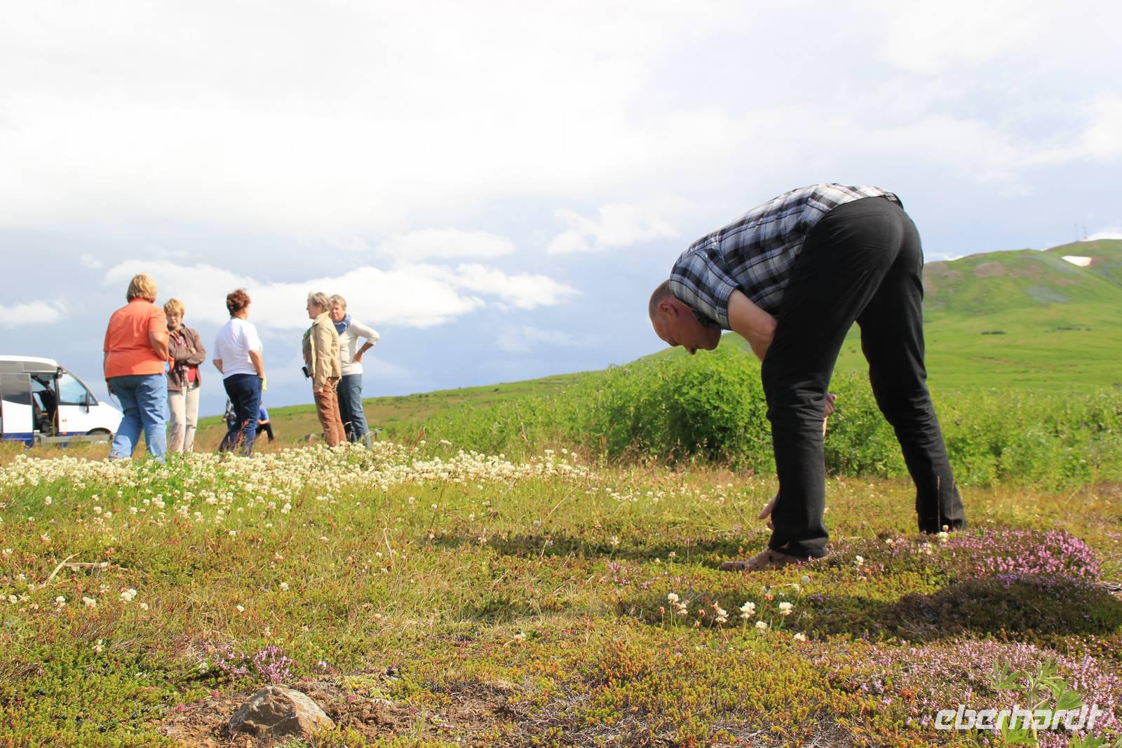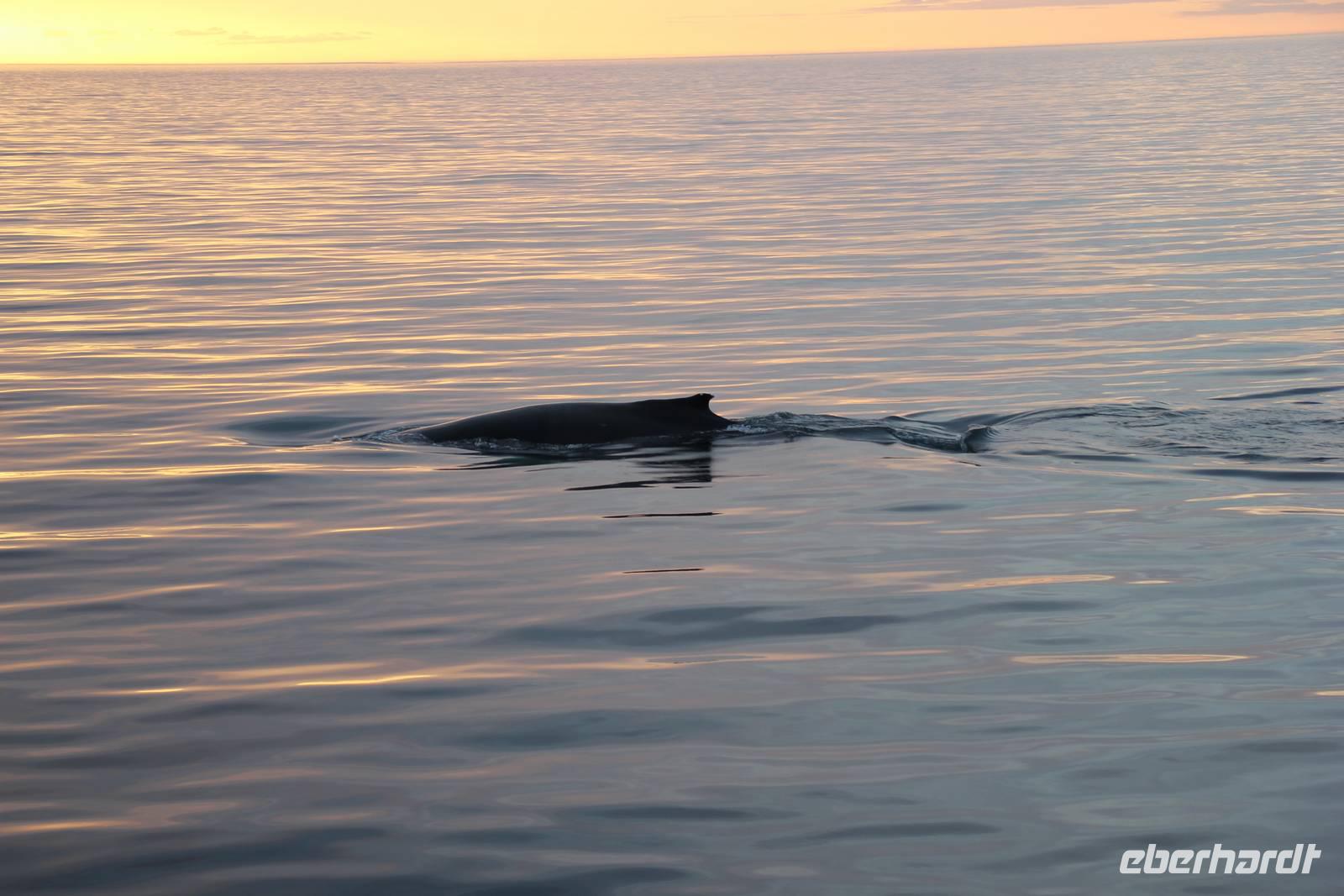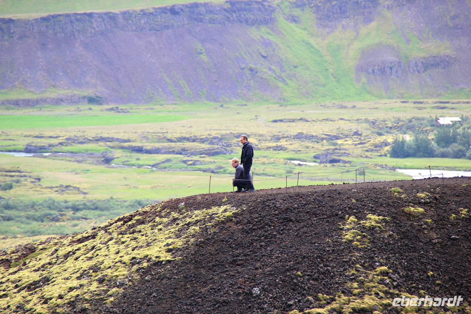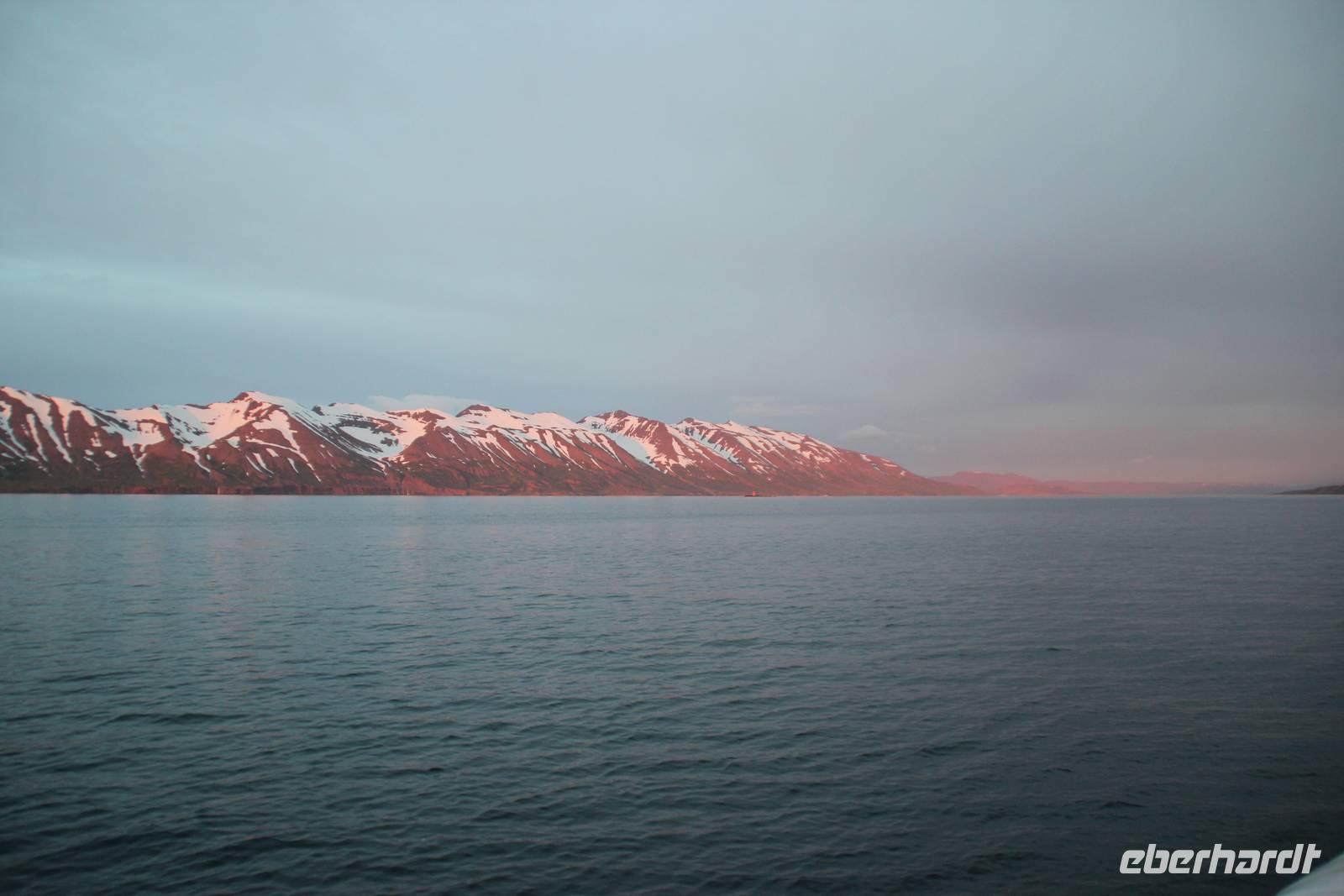Nachdem in der Nacht der letzte Gast das Hotel erreicht hat, ist unsere Reisegruppe zum Frühstück mit 18 Personen vollständig. Rosa holt uns mit unserem neuen Busfahrer Olaf ab und die Fahrt in Richtung Norden geht los. Wir fahren durch den 5770 Meter langen Walfjord-Tunnel, welcher 165 Meter unter dem Meer liegt. Unser erster Stopp ist in dem kleinen Städtchen Borgarnes, wo erste Postkarten gekauft werden. Die Fahrt geht weiter nördlich in das Nordurartal, wo wir den erloschenen Vulkan-Krater Grabrok besteigen. Ein toller Ausblick in die Umgebung bietet sich uns. Danach fahren wir zu Anna und ihrer Islandpferdezucht. Sie zeigt uns ihre Pferde, den Hof und die Stallungen, erklärt uns die 5 verschiedenen Gangarten Schritt, Trab, Galopp, Tölt und Pass, welche wir live vorgeführt bekommen und erfahren viel über das isländische Leben von ihr und ihrer Familie bei Kaffee und leckerem Gebäck. Auf unserer Weiterfahrt erfahren wir von Rosa viele Geschichten über Elfen und Trolle. Fotostopp in der Hochebene von Holtavörduheidi und weiter in Richtung Akureyri. Nachdem wir zum späten Nachmittag die zweitgrößte Stadt Islands erreicht und unsere Zimmer bezogen haben, hat jeder genug Zeit, die kleine Stadt auf eigene Faust zu erkunden. Nach dem unglaublich reichhaltigen Buffet im Edda Hotel wartet ein weiterer Höhepunkt für den Großteil der Reisegruppe auf uns am Abend. Wir fahren mit dem Schiff auf den Fjord Eyjafjördur und schon bald erblicken wir Buckelwale, Schweinswale und Delphine in dieser unglaublich schönen Fjordbucht, während am Hochizont die Sonne versucht unter zu gehen. Unser Guide Andy hat ein Adlerauge und zeigt uns sofort, wenn die typischen Fontänen oder Rückenflossen an der Meeresoberfläche zu sehen sind. Tief beeindruckt von diesem Naturschauspiel fahren wir zurück zum Hotel.