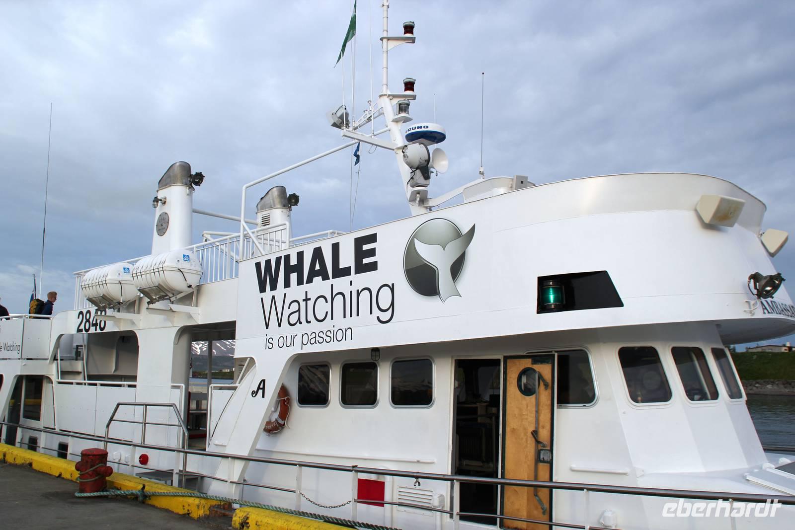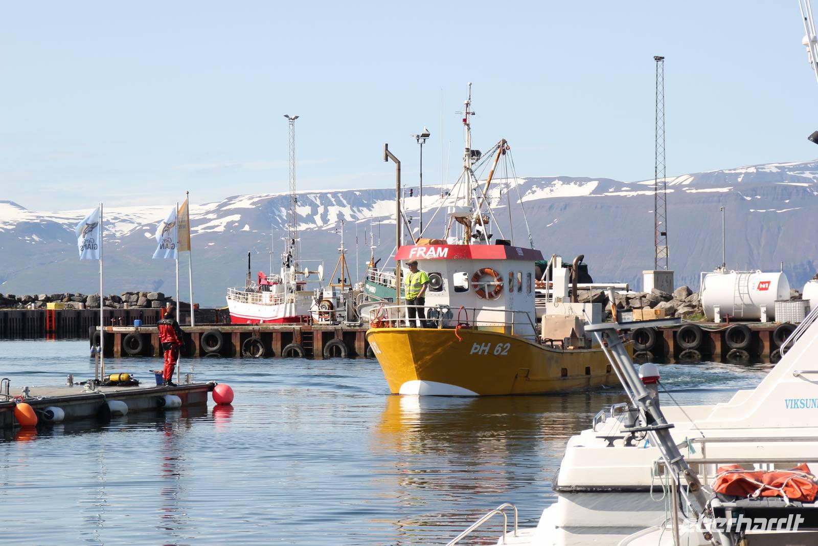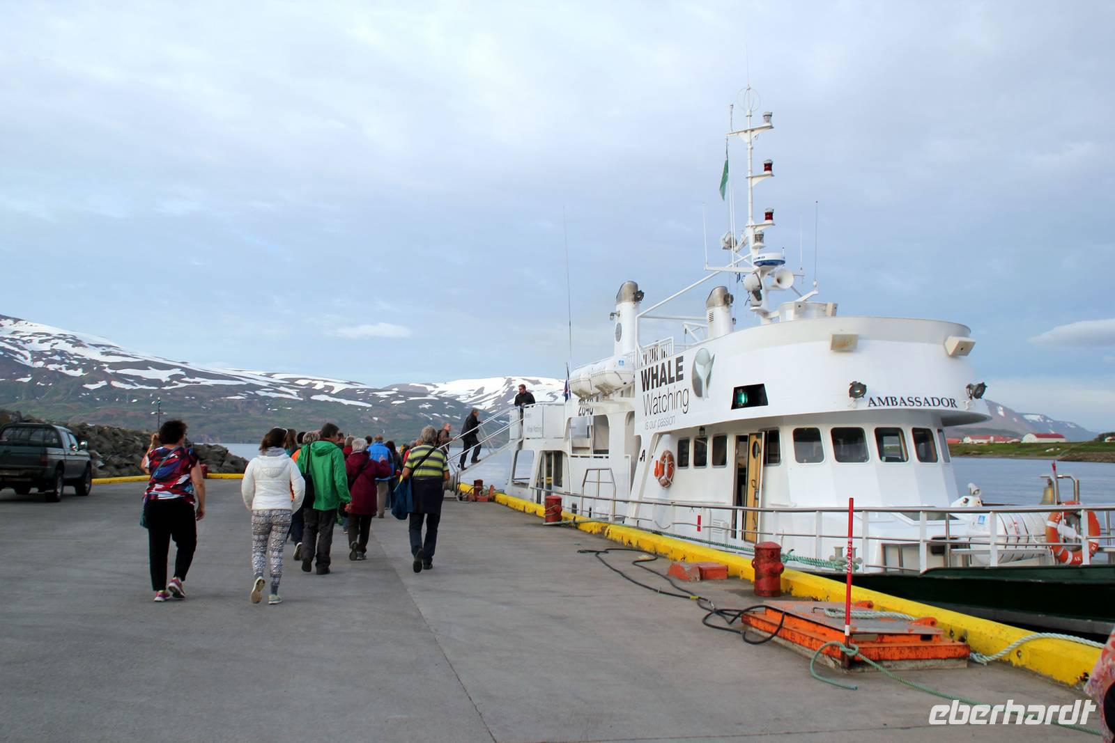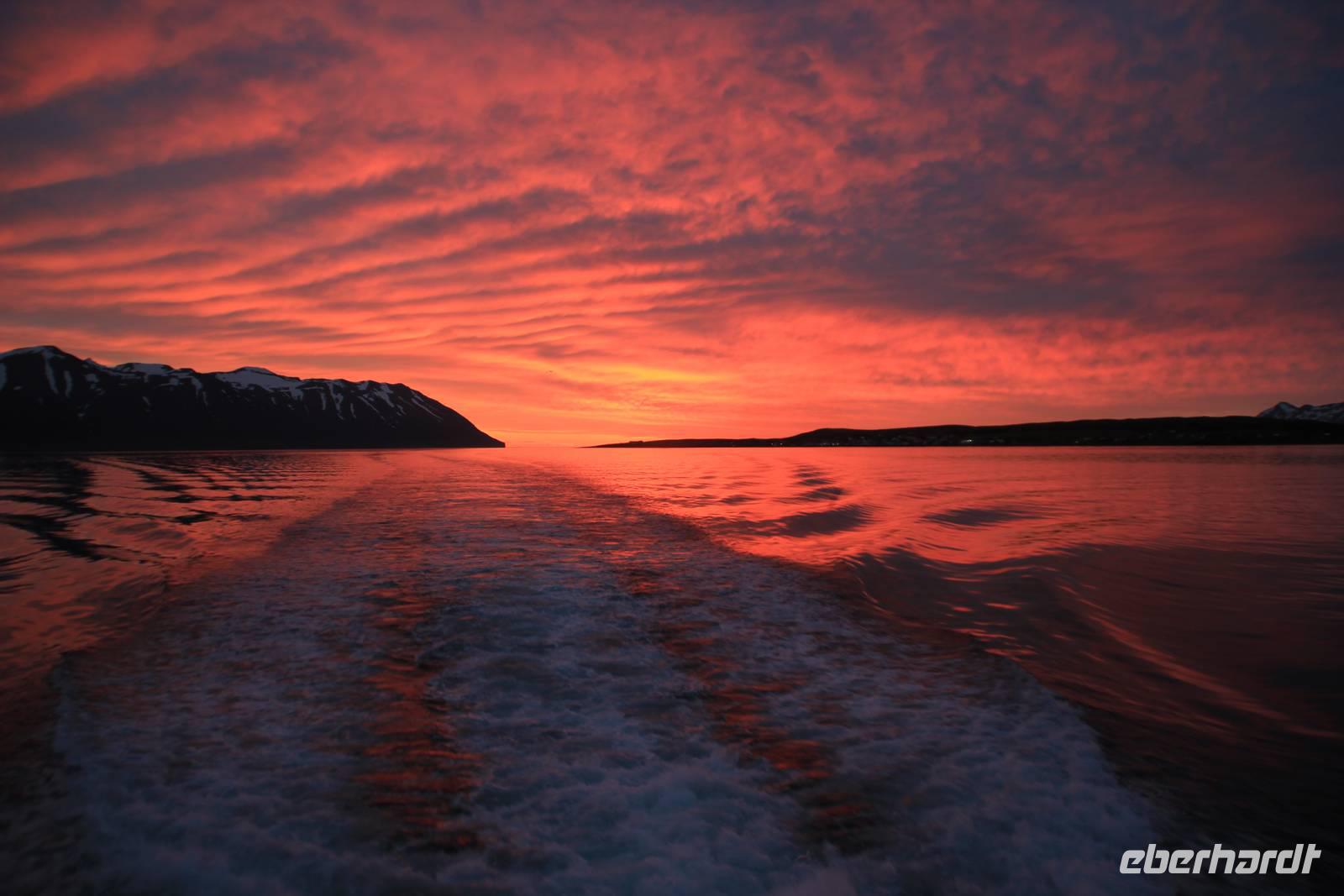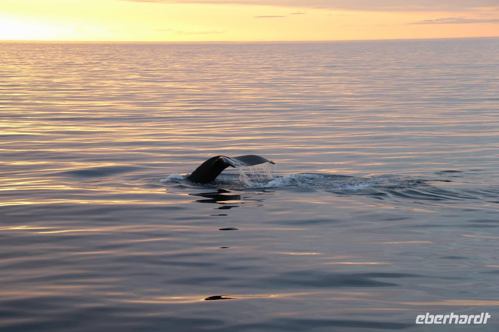 Nachdem in der Nacht der letzte Gast das Hotel erreicht hat, ist unsere Reisegruppe zum Frühstück mit 18 Personen vollständig. Rosa holt uns mit unserem neuen Busfahrer Olaf ab und die Fahrt in Richtung Norden geht los. Wir fahren durch den 5770 Meter langen Walfjord-Tunnel, welcher 165 Meter unter dem Meer liegt. Unser erster Stopp ist in dem kleinen Städtchen Borgarnes, wo erste Postkarten gekauft werden. Die Fahrt geht weiter nördlich in das Nordurartal, wo wir den erloschenen Vulkan-Krater Grabrok besteigen. Ein toller Ausblick in die Umgebung bietet sich uns. Danach fahren wir zu Anna und ihrer Islandpferdezucht. Sie zeigt uns ihre Pferde, den Hof und die Stallungen, erklärt uns die 5 verschiedenen Gangarten Schritt, Trab, Galopp, Tölt und Pass, welche wir live vorgeführt bekommen und erfahren viel über das isländische Leben von ihr und ihrer Familie bei Kaffee und leckerem Gebäck. Auf unserer Weiterfahrt erfahren wir von Rosa viele Geschichten über Elfen und Trolle. Fotostopp in der Hochebene von Holtavörduheidi und weiter in Richtung Akureyri. Nachdem wir zum späten Nachmittag die zweitgrößte Stadt Islands erreicht und unsere Zimmer bezogen haben, hat jeder genug Zeit, die kleine Stadt auf eigene Faust zu erkunden. Nach dem unglaublich reichhaltigen Buffet im Edda Hotel wartet ein weiterer Höhepunkt für den Großteil der Reisegruppe auf uns am Abend. Wir fahren mit dem Schiff auf den Fjord Eyjafjördur und schon bald erblicken wir Buckelwale, Schweinswale und Delphine in dieser unglaublich schönen Fjordbucht, während am Hochizont die Sonne versucht unter zu gehen. Unser Guide Andy hat ein Adlerauge und zeigt uns sofort, wenn die typischen Fontänen oder Rückenflossen an der Meeresoberfläche zu sehen sind. Tief beeindruckt von diesem Naturschauspiel fahren wir zurück zum Hotel.
