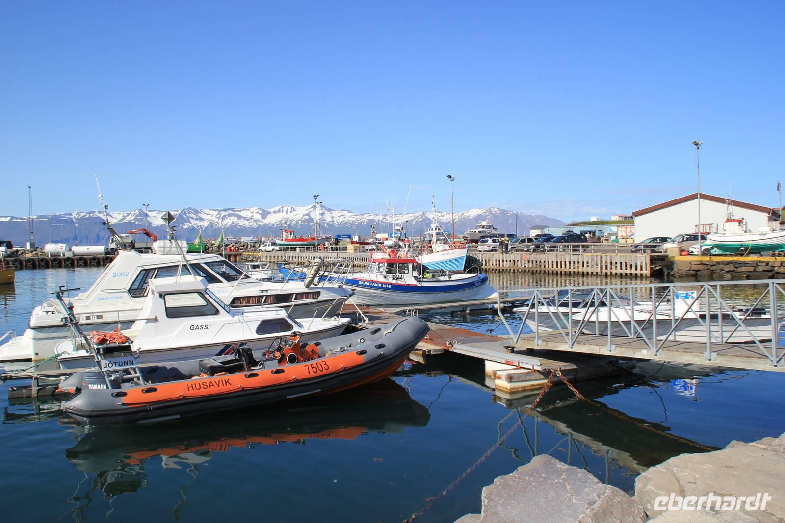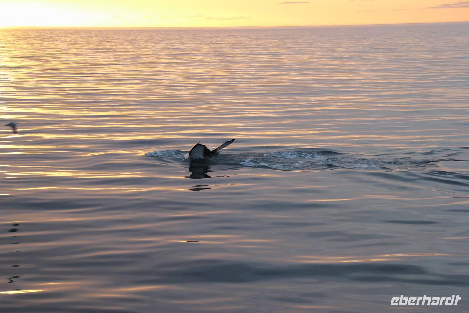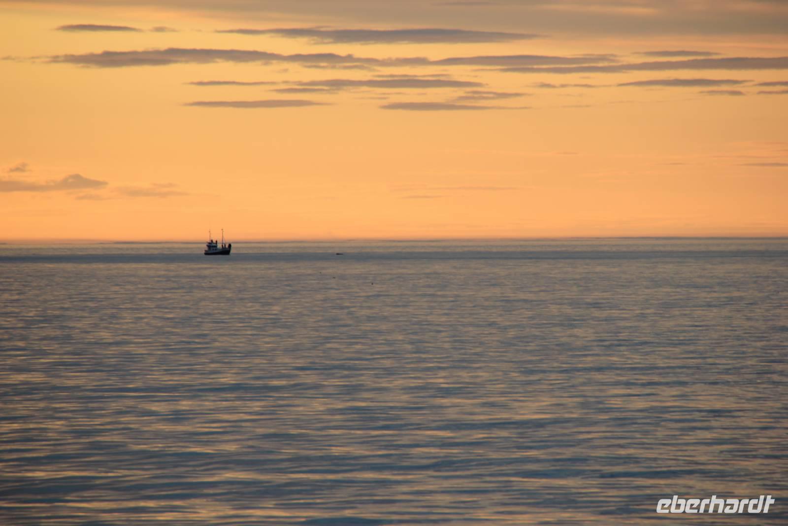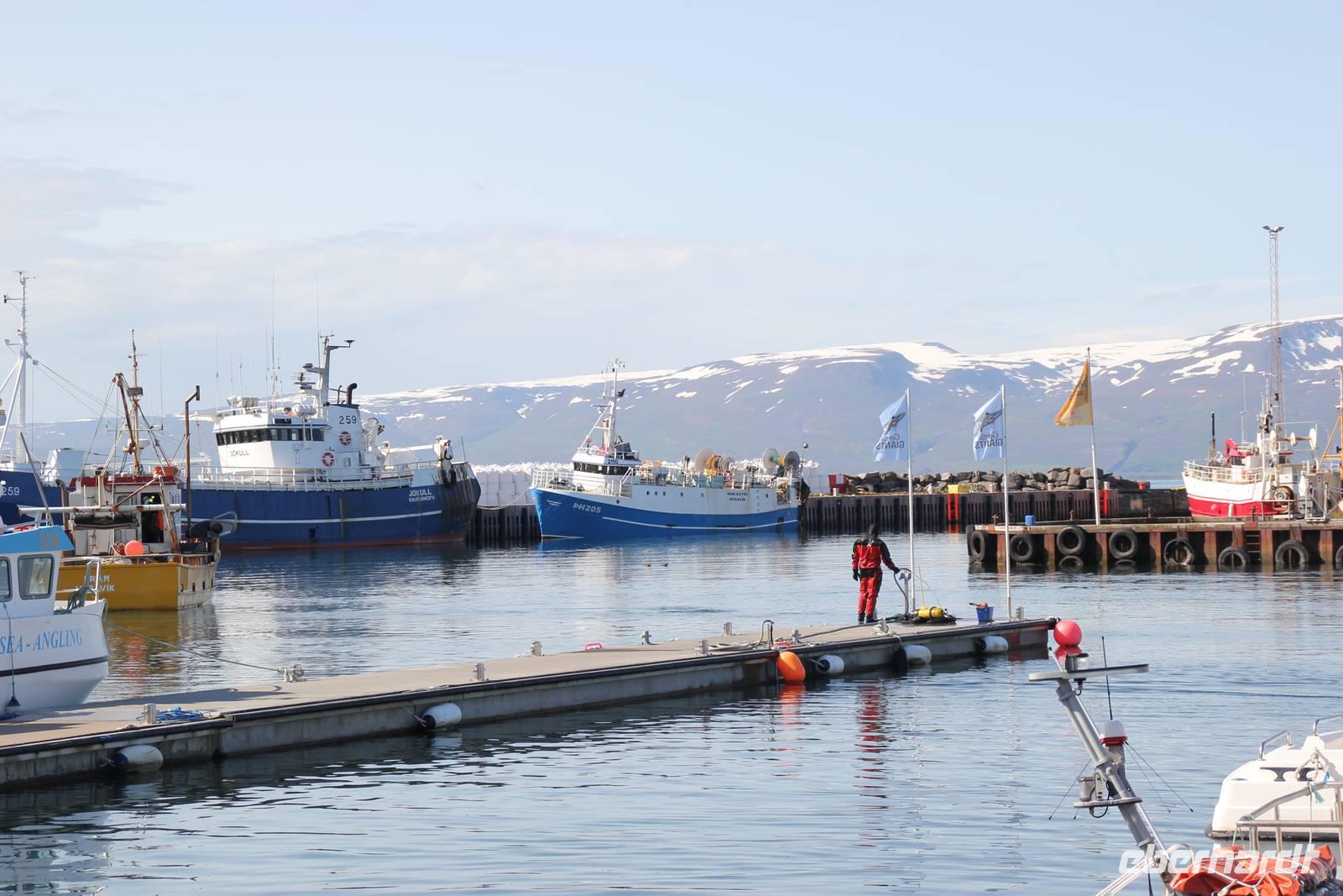Nachdem in der Nacht der letzte Gast das Hotel erreicht hat, ist unsere Reisegruppe zum Frühstück mit 18 Personen vollständig. Rosa holt uns mit unserem neuen Busfahrer Olaf ab und die Fahrt in Richtung Norden geht los. Wir fahren durch den 5770 Meter langen Walfjord-Tunnel, welcher 165 Meter unter dem Meer liegt. Unser erster Stopp ist in dem kleinen Städtchen Borgarnes, wo erste Postkarten gekauft werden. Die Fahrt geht weiter nördlich in das Nordurartal, wo wir den erloschenen Vulkan-Krater Grabrok besteigen. Ein toller Ausblick in die Umgebung bietet sich uns. Danach fahren wir zu Anna und ihrer Islandpferdezucht. Sie zeigt uns ihre Pferde, den Hof und die Stallungen, erklärt uns die 5 verschiedenen Gangarten Schritt, Trab, Galopp, Tölt und Pass, welche wir live vorgeführt bekommen und erfahren viel über das isländische Leben von ihr und ihrer Familie bei Kaffee und leckerem Gebäck. Auf unserer Weiterfahrt erfahren wir von Rosa viele Geschichten über Elfen und Trolle. Fotostopp in der Hochebene von Holtavörduheidi und weiter in Richtung Akureyri. Nachdem wir zum späten Nachmittag die zweitgrößte Stadt Islands erreicht und unsere Zimmer bezogen haben, hat jeder genug Zeit, die kleine Stadt auf eigene Faust zu erkunden. Nach dem unglaublich reichhaltigen Buffet im Edda Hotel wartet ein weiterer Höhepunkt für den Großteil der Reisegruppe auf uns am Abend. Wir fahren mit dem Schiff auf den Fjord Eyjafjördur und schon bald erblicken wir Buckelwale, Schweinswale und Delphine in dieser unglaublich schönen Fjordbucht, während am Hochizont die Sonne versucht unter zu gehen. Unser Guide Andy hat ein Adlerauge und zeigt uns sofort, wenn die typischen Fontänen oder Rückenflossen an der Meeresoberfläche zu sehen sind. Tief beeindruckt von diesem Naturschauspiel fahren wir zurück zum Hotel.