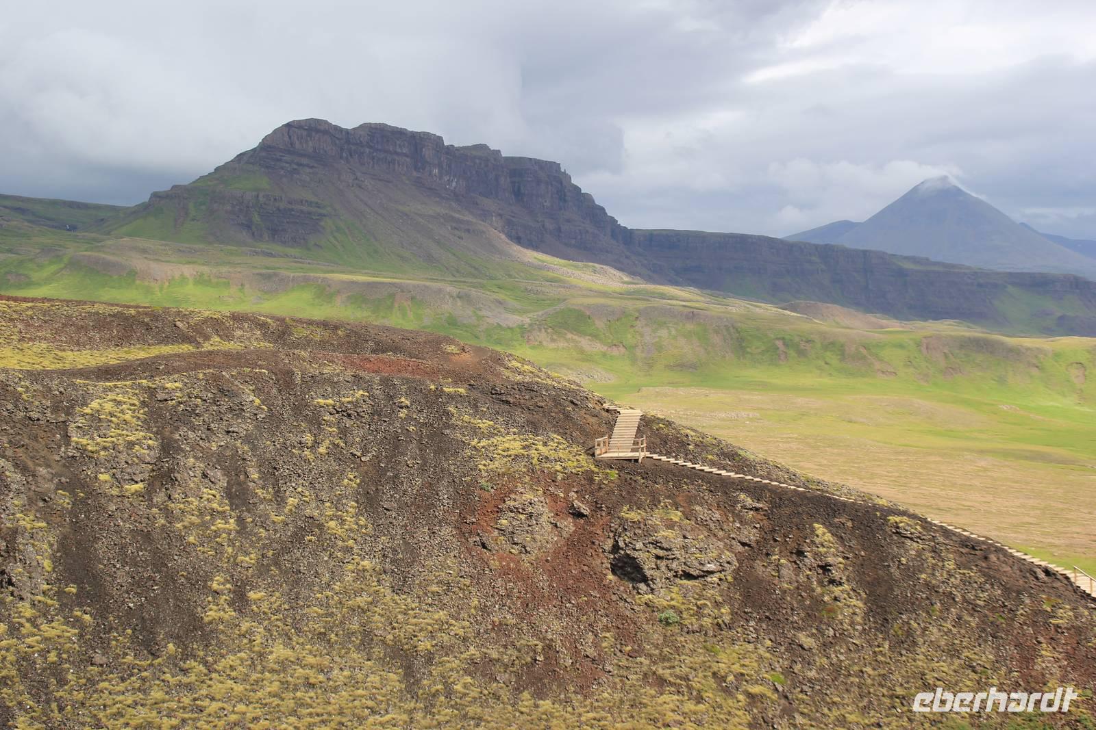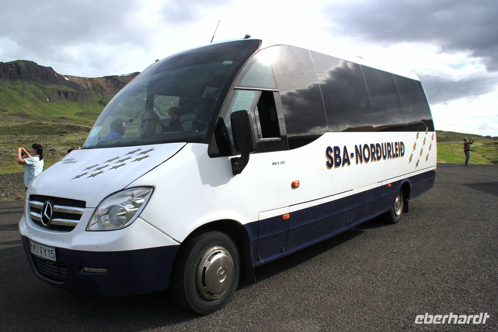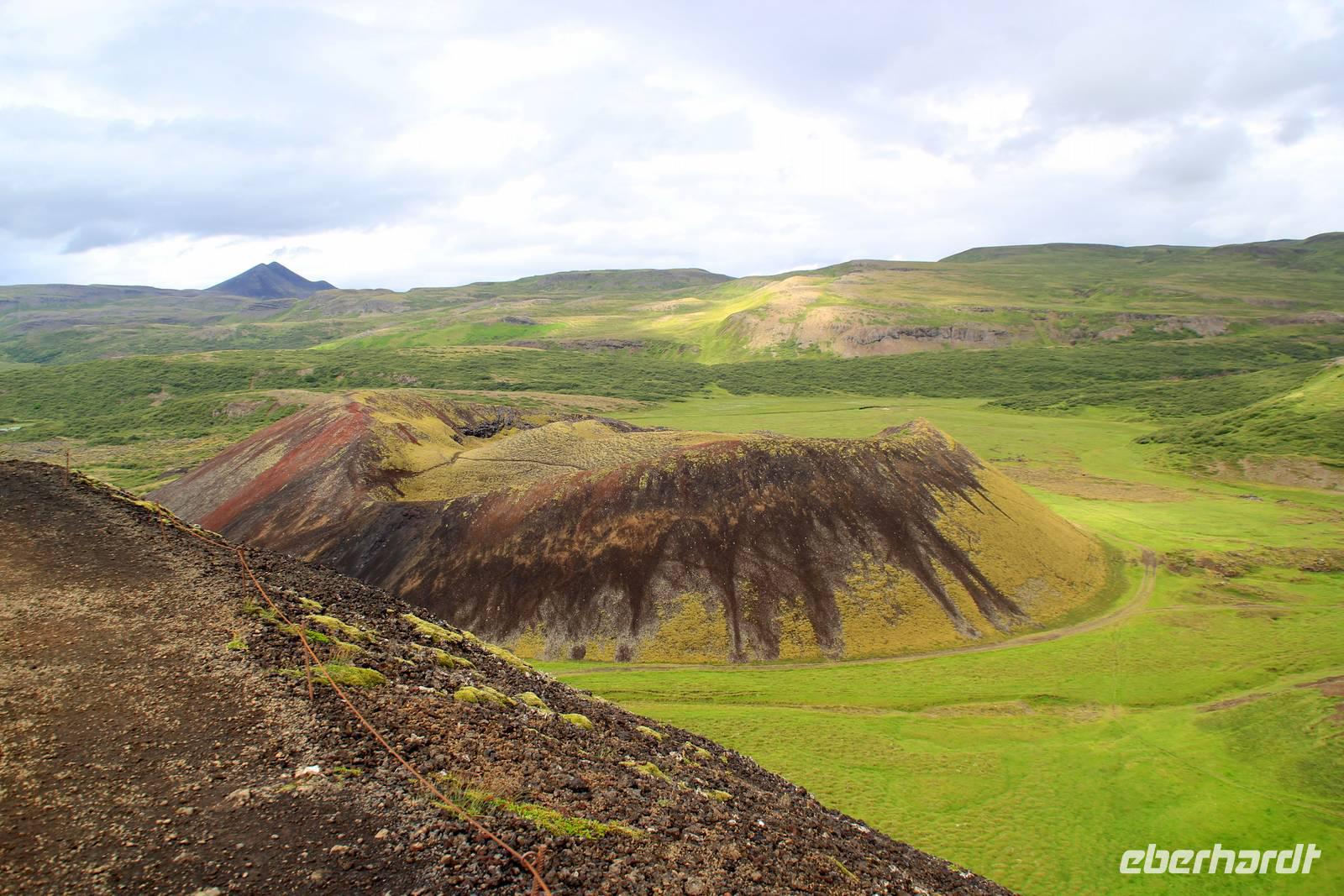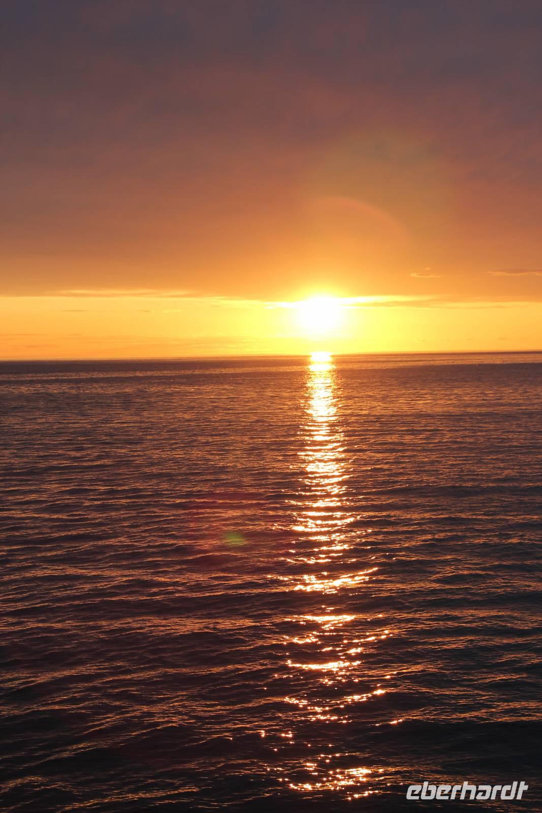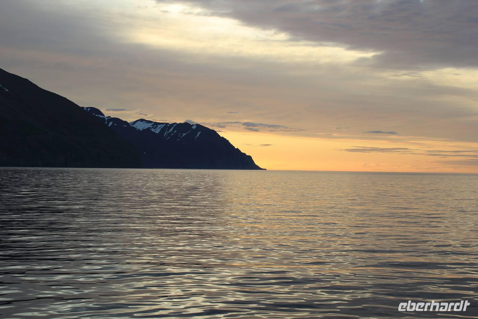Nachdem in der Nacht der letzte Gast das Hotel erreicht hat, ist unsere Reisegruppe zum Frühstück mit 18 Personen vollständig. Rosa holt uns mit unserem neuen Busfahrer Olaf ab und die Fahrt in Richtung Norden geht los. Wir fahren durch den 5770 Meter langen Walfjord-Tunnel, welcher 165 Meter unter dem Meer liegt. Unser erster Stopp ist in dem kleinen Städtchen Borgarnes, wo erste Postkarten gekauft werden. Die Fahrt geht weiter nördlich in das Nordurartal, wo wir den erloschenen Vulkan-Krater Grabrok besteigen. Ein toller Ausblick in die Umgebung bietet sich uns. Danach fahren wir zu Anna und ihrer Islandpferdezucht. Sie zeigt uns ihre Pferde, den Hof und die Stallungen, erklärt uns die 5 verschiedenen Gangarten Schritt, Trab, Galopp, Tölt und Pass, welche wir live vorgeführt bekommen und erfahren viel über das isländische Leben von ihr und ihrer Familie bei Kaffee und leckerem Gebäck. Auf unserer Weiterfahrt erfahren wir von Rosa viele Geschichten über Elfen und Trolle. Fotostopp in der Hochebene von Holtavörduheidi und weiter in Richtung Akureyri. Nachdem wir zum späten Nachmittag die zweitgrößte Stadt Islands erreicht und unsere Zimmer bezogen haben, hat jeder genug Zeit, die kleine Stadt auf eigene Faust zu erkunden. Nach dem unglaublich reichhaltigen Buffet im Edda Hotel wartet ein weiterer Höhepunkt für den Großteil der Reisegruppe auf uns am Abend. Wir fahren mit dem Schiff auf den Fjord Eyjafjördur und schon bald erblicken wir Buckelwale, Schweinswale und Delphine in dieser unglaublich schönen Fjordbucht, während am Hochizont die Sonne versucht unter zu gehen. Unser Guide Andy hat ein Adlerauge und zeigt uns sofort, wenn die typischen Fontänen oder Rückenflossen an der Meeresoberfläche zu sehen sind. Tief beeindruckt von diesem Naturschauspiel fahren wir zurück zum Hotel.