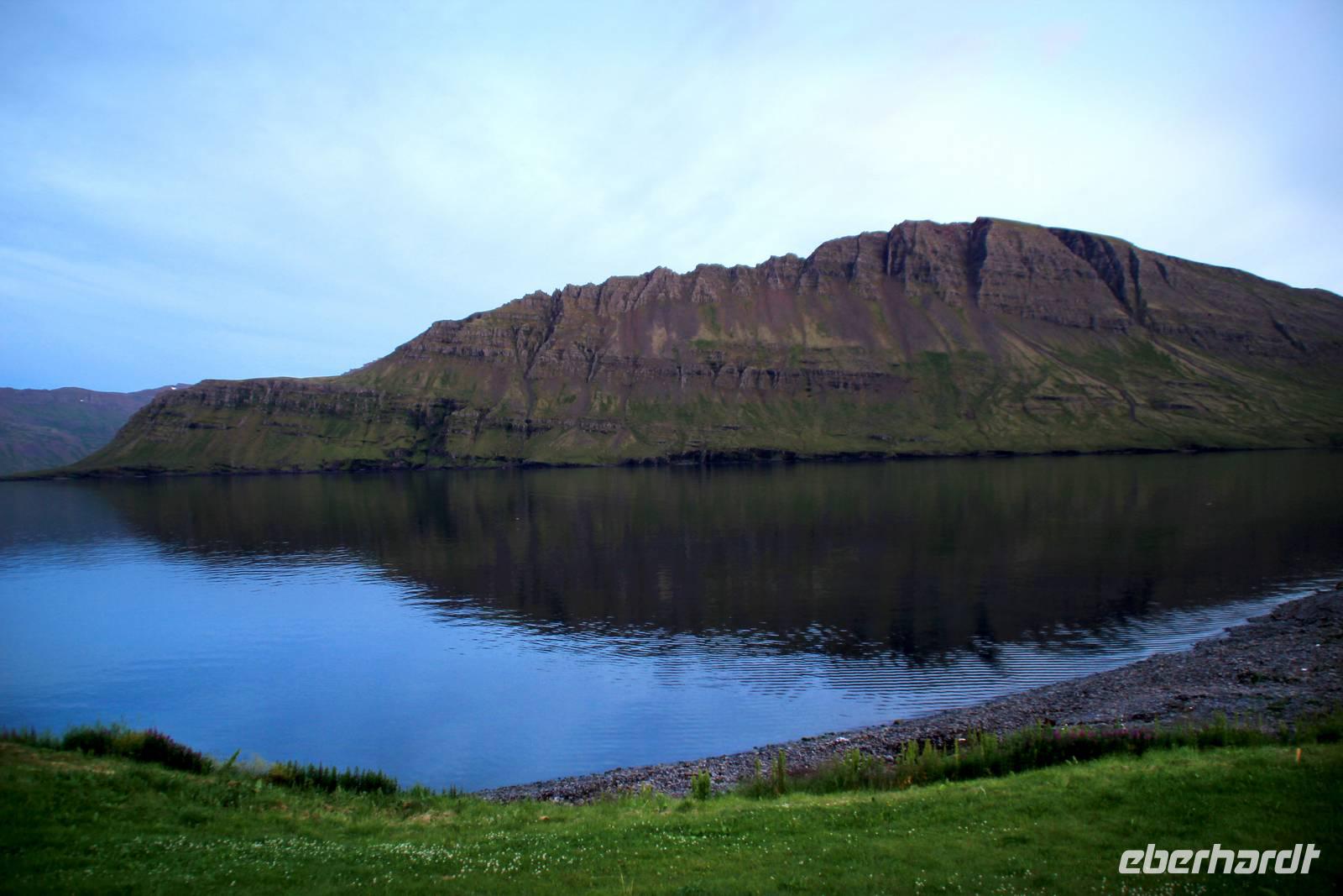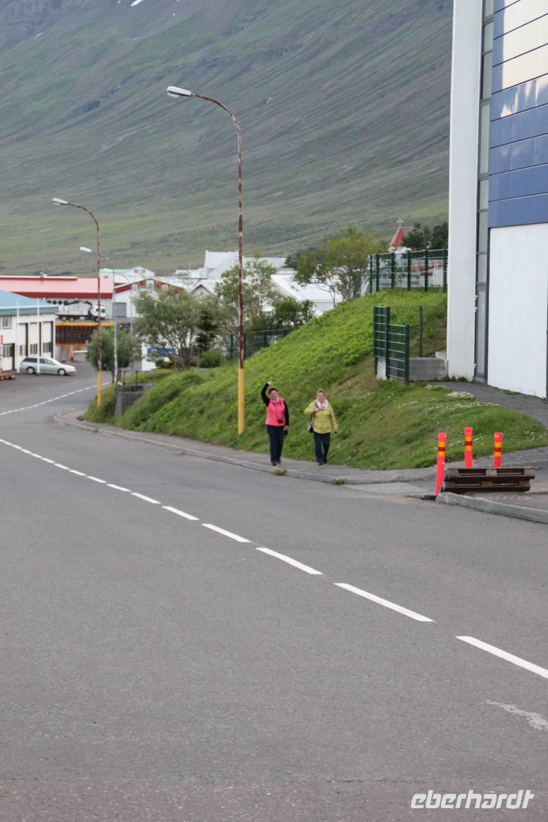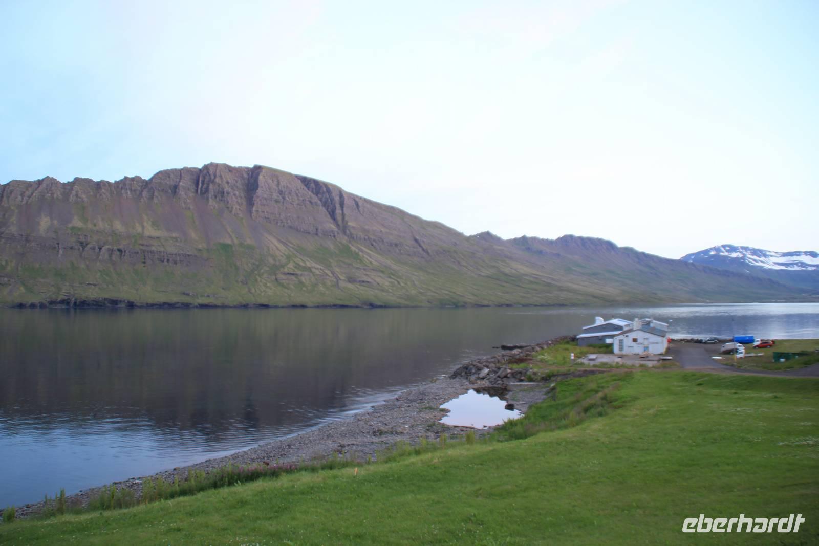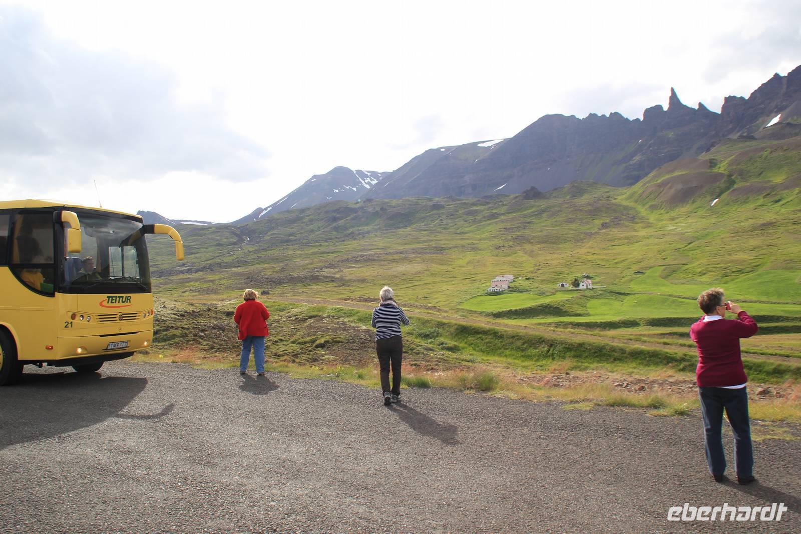 Wir haben einen langen Tag mit vielen Programmpunkten vor uns und nach einem reichhaltigen Frühstück und einer kleinen Suchaktion eines vermissten Handys geht es dann auch los. Wir haben Glück am Myvatn, den Mückensee. Auf Grund des Windes haben wir keine Probleme mit den Namensgebern. Während eines kleinen Spazierganges erkunden wir die Gegend der Pseudokrater welche durch den Fluss frischer Lava über dieses Feuchtgebiet entstanden sind. In der Ferne sieht man Islandpferde am See grasen, Enten haben hier ihren Lebensraum gefunden, insgesamt sogar 16 verschiedene Arten. In einem kleinen Souvenirshop entdecken wir das ein oder andere Mitbringsel oder gehen unseren Bedürfnissen nach ? Danach fahren wir in das bizarre Gebiet der Lava-Landschaft Dimmuborgir und versuchen in den Lavaformationen Troll-Gesichter zu entdecken. An einem Loch in den Formationen machen wir einen spontanen Fotostopp und lassen unsere Wink-Elemente kreisen und entdecken sogar hier und da einen essbaren Pilz, was unter den Pilzfreunden in der Reisegruppe zu spontaner Sammellust führt. Weiter geht die Fahrt zur Entspannung in die Badelandschaft Jardbödin. Sie ist das Gegenstück zur Blauen Lagune im Westen. Es riecht am Anfang etwas streng aber nach einiger Zeit gewöhnt man sich daran. Wir lassen uns im warmen, stellen weise sogar zu heißen, milchig weißen Wasser umhertreiben, umgeben von schwarzen Lavasteinen ein besonderes Erlebnis. Viel zu schnell müssen wir wieder aus diesem entspannenden Bad und es geht ein kleines Stück weiter zu einem Fotostopp, an dem man nochmal den Blick über das Thermalbad und der angrenzenden Lavalandschaft genießen kann. Wir setzen unsere Fahrt in das Hochtemperaturgebiet Namaskard fort, auch umgangssprachlich die Hexenküche genannt. Wieder sind wir von Schwefelgeruch umgeben, welche r durch die aufsteigenden Gase kommt. Es ist ein beeindruckendes Naturschauspiel, in Gelb-, Orange- und Brauntönen. Dass die Erde lebt, bekommt hier eine völlig neue Bedeutung. Noch beeindruckt von diesem Naturerlebnis geht unsere Reise zum nächsten überwältigten Naturereignis: dem Dettifoss. Er ist der der leistungsstärkste Wasserfall Europas und das merken wir alle, als wir vor ihm stehen. Die grauen Wassermassen stürzen sich in eine Tiefe von bis zu 45 Metern. Genau hier wurde auch die Anfangssequenz von dem Film Prometheus gedreht. Nachdem alle am Bus eingetroffen sind, wird eine Runde typisch isländischer Trockenfisch probiert. In Butter getunkt eine recht interessante Mahlzeit ? Einen weiteren kulinarischen Zwischenstopp gibt es im höchstgelegenen und abgelegensten Bauernhof von Island - auf dem Hof Mödrudalur. Wir probieren die isländischen Liebeshoden und genießen den Ausblick und die Ruhe in 470 Meter Höhe. Nach einer interessanten Fahrt durch die karge Wüstenlandschaft erreichen wir die Berge an den Ostfjorden. Unser Busfahrer Olaf meistert die vielen engen Serpentinen in den Bergen und wir erreichen am Abend unser Edda Hotel in Neskaupsstadur. Wir sind restlos begeistert. Diese Idylle ist perfekt nach einem so ereignisreichen Tag. Wir genießen das Abendessen und lassen im Anschluss die Seele baumeln. Ob mit Decke am Fjord oder als Spaziergang im Ort - jeder genießt die Ruhe in Neskaupsstadur auf die eigene Weise. Es wird sogar erzählt, dass eine Elfenhochzeit direkt am Wasser beobachtet wurde ?