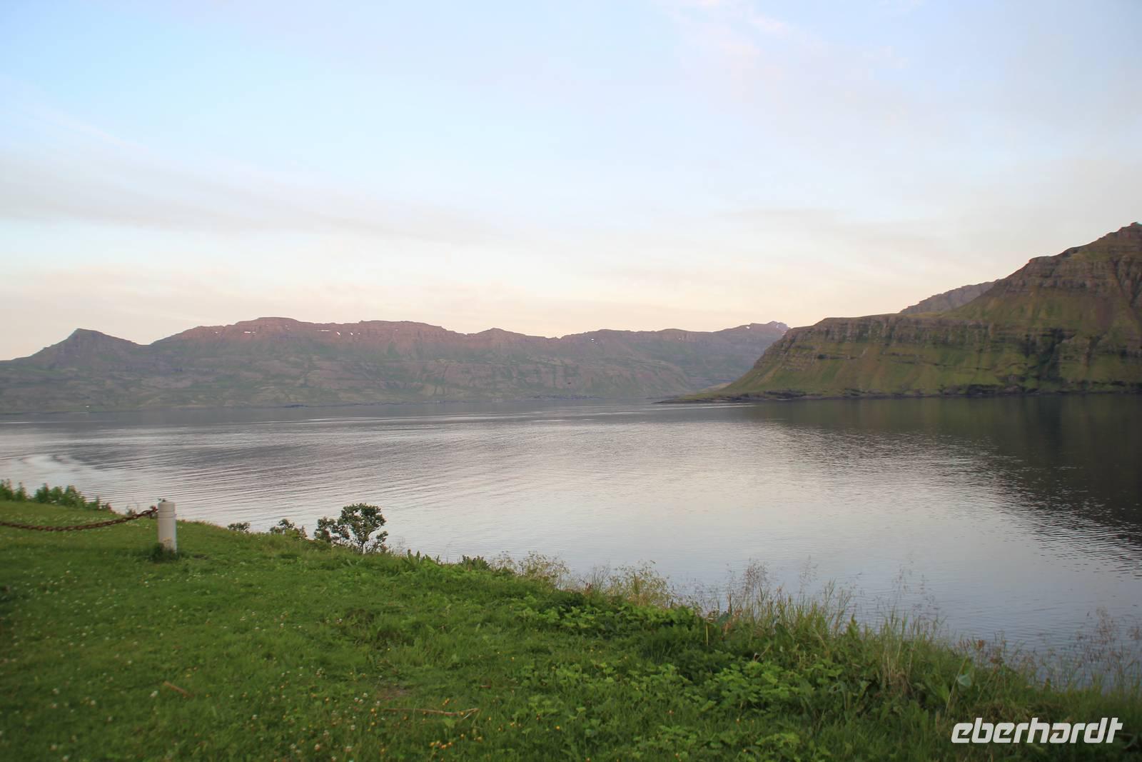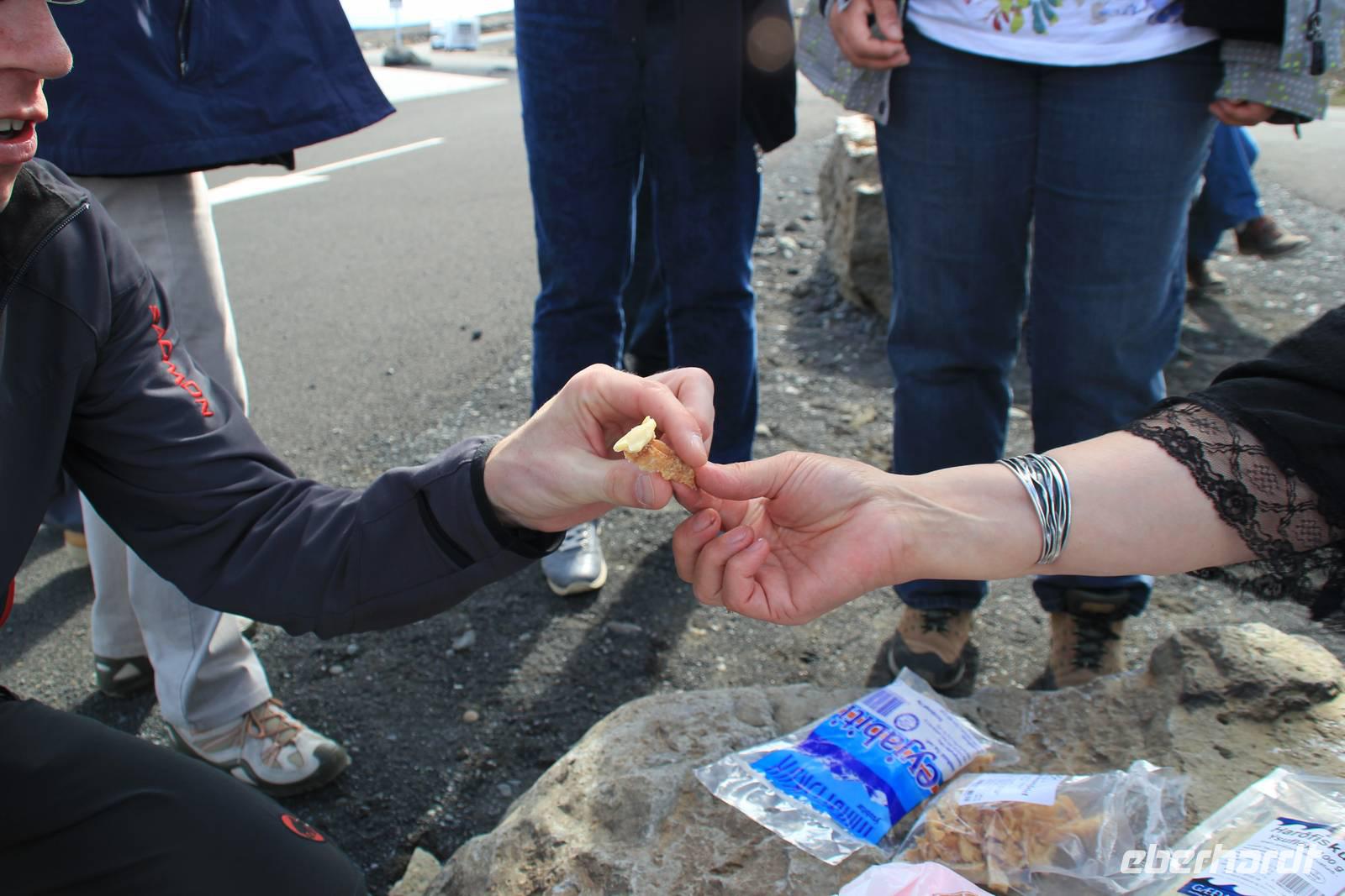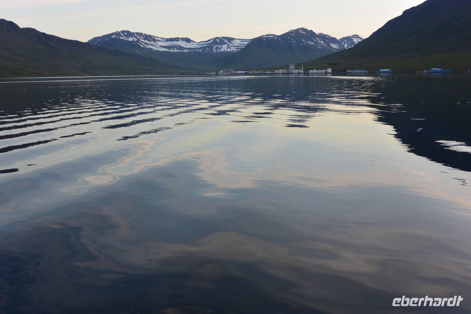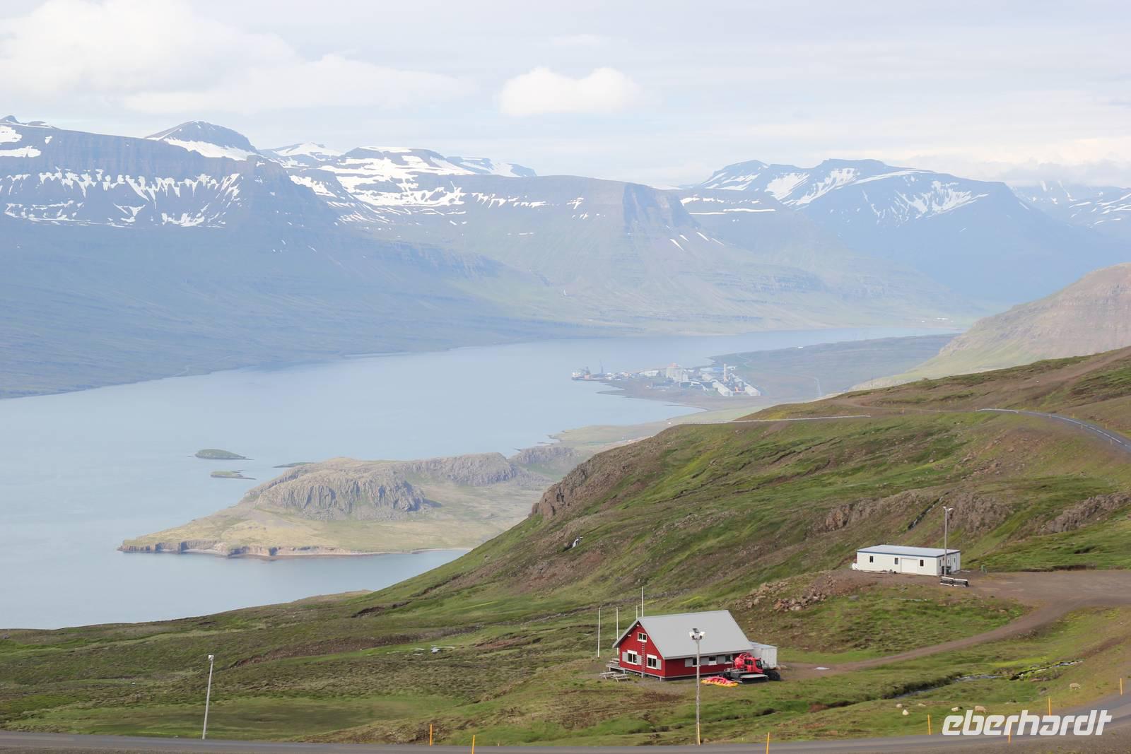 Wir haben einen langen Tag mit vielen Programmpunkten vor uns und nach einem reichhaltigen Frühstück und einer kleinen Suchaktion eines vermissten Handys geht es dann auch los. Wir haben Glück am Myvatn, den Mückensee. Auf Grund des Windes haben wir keine Probleme mit den Namensgebern. Während eines kleinen Spazierganges erkunden wir die Gegend der Pseudokrater welche durch den Fluss frischer Lava über dieses Feuchtgebiet entstanden sind. In der Ferne sieht man Islandpferde am See grasen, Enten haben hier ihren Lebensraum gefunden, insgesamt sogar 16 verschiedene Arten. In einem kleinen Souvenirshop entdecken wir das ein oder andere Mitbringsel oder gehen unseren Bedürfnissen nach ? Danach fahren wir in das bizarre Gebiet der Lava-Landschaft Dimmuborgir und versuchen in den Lavaformationen Troll-Gesichter zu entdecken. An einem Loch in den Formationen machen wir einen spontanen Fotostopp und lassen unsere Wink-Elemente kreisen und entdecken sogar hier und da einen essbaren Pilz, was unter den Pilzfreunden in der Reisegruppe zu spontaner Sammellust führt. Weiter geht die Fahrt zur Entspannung in die Badelandschaft Jardbödin. Sie ist das Gegenstück zur Blauen Lagune im Westen. Es riecht am Anfang etwas streng aber nach einiger Zeit gewöhnt man sich daran. Wir lassen uns im warmen, stellen weise sogar zu heißen, milchig weißen Wasser umhertreiben, umgeben von schwarzen Lavasteinen ein besonderes Erlebnis. Viel zu schnell müssen wir wieder aus diesem entspannenden Bad und es geht ein kleines Stück weiter zu einem Fotostopp, an dem man nochmal den Blick über das Thermalbad und der angrenzenden Lavalandschaft genießen kann. Wir setzen unsere Fahrt in das Hochtemperaturgebiet Namaskard fort, auch umgangssprachlich die Hexenküche genannt. Wieder sind wir von Schwefelgeruch umgeben, welche r durch die aufsteigenden Gase kommt. Es ist ein beeindruckendes Naturschauspiel, in Gelb-, Orange- und Brauntönen. Dass die Erde lebt, bekommt hier eine völlig neue Bedeutung. Noch beeindruckt von diesem Naturerlebnis geht unsere Reise zum nächsten überwältigten Naturereignis: dem Dettifoss. Er ist der der leistungsstärkste Wasserfall Europas und das merken wir alle, als wir vor ihm stehen. Die grauen Wassermassen stürzen sich in eine Tiefe von bis zu 45 Metern. Genau hier wurde auch die Anfangssequenz von dem Film Prometheus gedreht. Nachdem alle am Bus eingetroffen sind, wird eine Runde typisch isländischer Trockenfisch probiert. In Butter getunkt eine recht interessante Mahlzeit ? Einen weiteren kulinarischen Zwischenstopp gibt es im höchstgelegenen und abgelegensten Bauernhof von Island - auf dem Hof Mödrudalur. Wir probieren die isländischen Liebeshoden und genießen den Ausblick und die Ruhe in 470 Meter Höhe. Nach einer interessanten Fahrt durch die karge Wüstenlandschaft erreichen wir die Berge an den Ostfjorden. Unser Busfahrer Olaf meistert die vielen engen Serpentinen in den Bergen und wir erreichen am Abend unser Edda Hotel in Neskaupsstadur. Wir sind restlos begeistert. Diese Idylle ist perfekt nach einem so ereignisreichen Tag. Wir genießen das Abendessen und lassen im Anschluss die Seele baumeln. Ob mit Decke am Fjord oder als Spaziergang im Ort - jeder genießt die Ruhe in Neskaupsstadur auf die eigene Weise. Es wird sogar erzählt, dass eine Elfenhochzeit direkt am Wasser beobachtet wurde ?