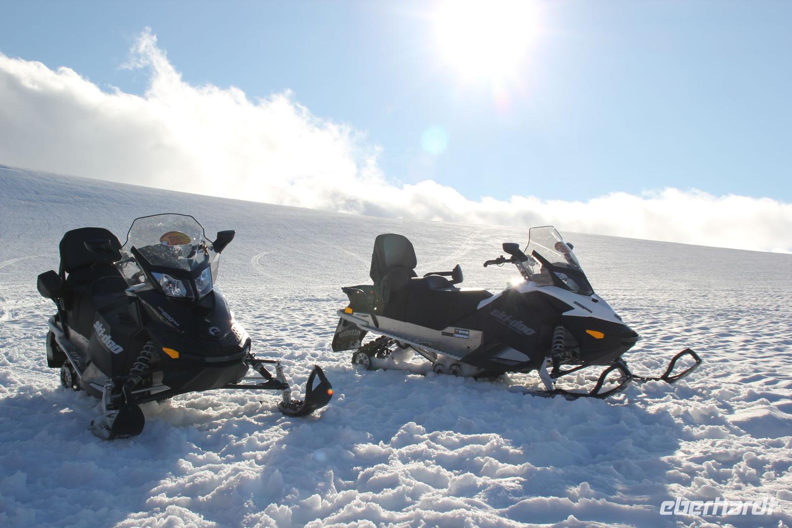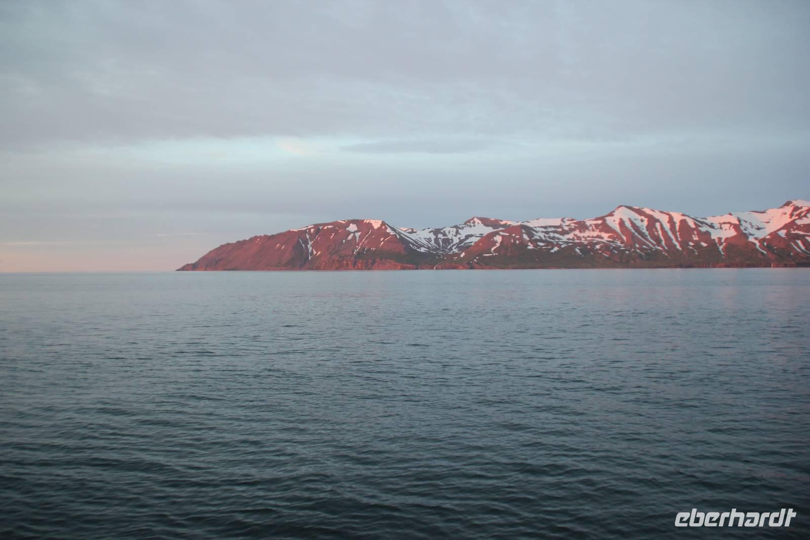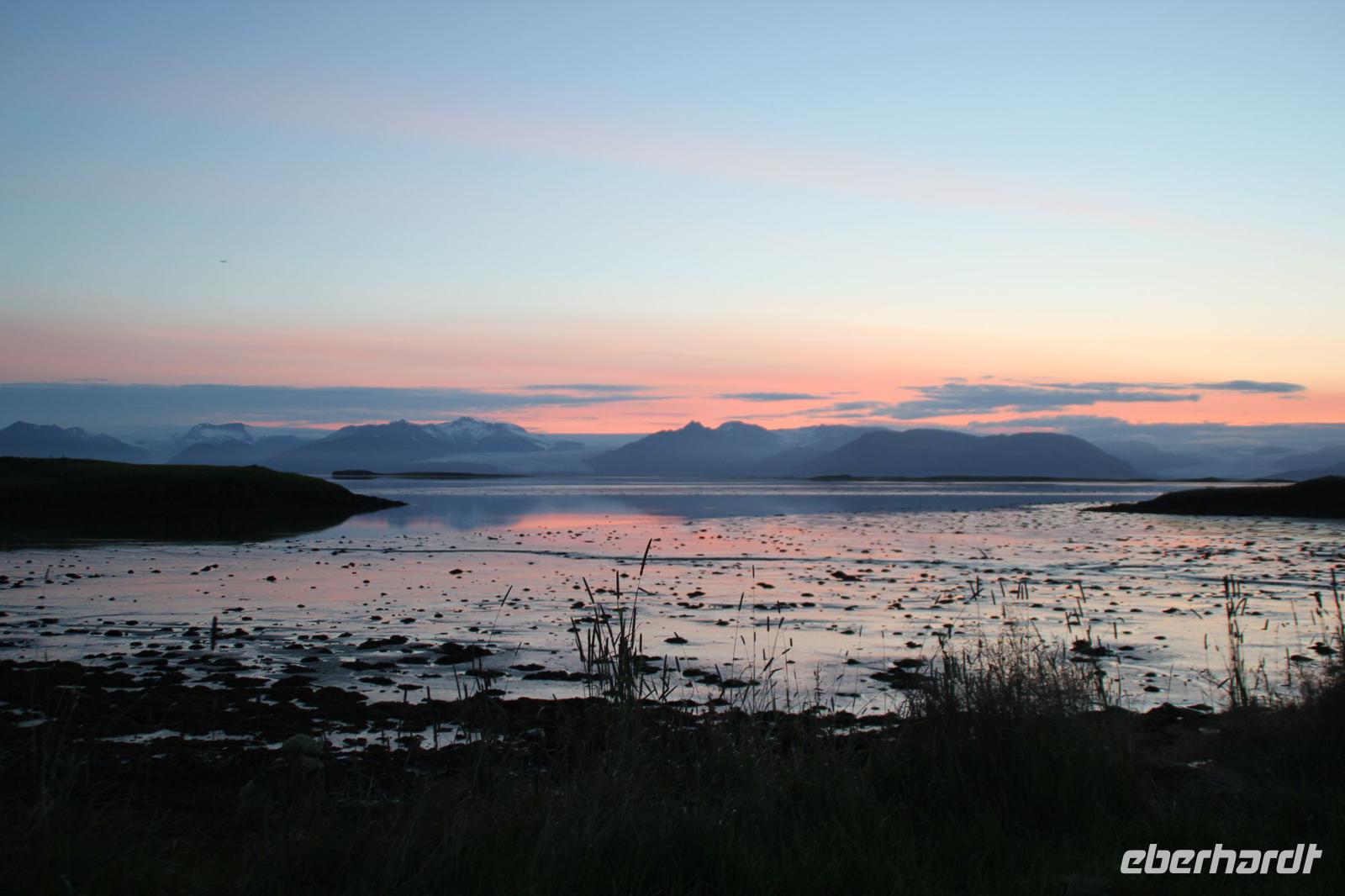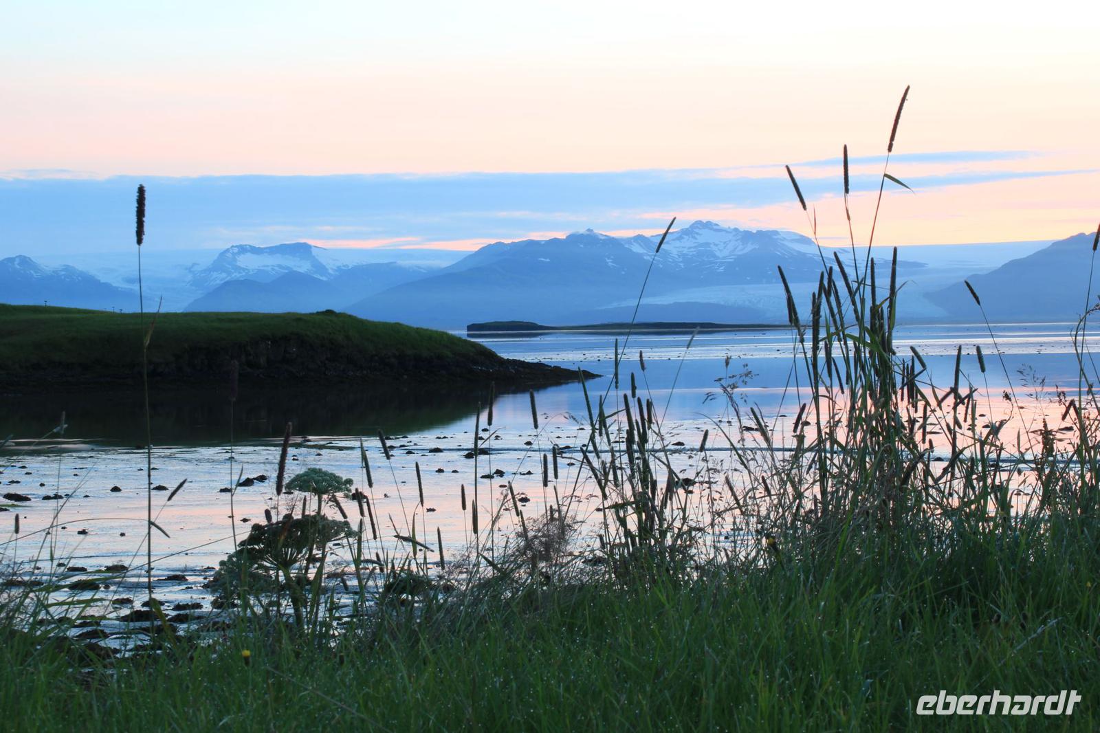 Ausgeruht starten wir von unserem idyllischen Hotel entlang der Ostfjorde in Richtung Höfn. Rosa erzählt uns während der Fahrt Legenden über Elfe und Trolle, die mal überraschend mal traurig enden. In einem Supermarkt besorge ich ein paar Kleinigkeiten für ein späteres Picknick. Wir richten mehrere Fotostopps ein und unser erstes gemeinsames Gruppenbild entsteht. In Stödvarfjördur angekommen, besichtigen wir Petras Steinhaus. Petra Maria Sveinsdottir war eine leidenschaftliche Steinsammlerin und hat zu ihren Lebzeiten eine der größten Sammlungen verschiedener Steine und Mineralien der Welt geschaffen. Bei schönstem Sonnenwetter spazieren wir durch den Garten und bewundern die verschiedenen Gesteinsarten, die überall im Garten präsentiert werden. Kleine Mitbringsel aus Stein werden gekauft und schon geht die Fahrt weiter. Unterwegs machen wir in einem kleinen malerischen Fischerstädtchen eine Picknickpause in der wir einen wundervollen Blick auf den Hafen haben. Als wir am Nachmittag unser Hotel in Höfn erreichen, warten schon die Jeeps auf uns, die uns zum Gletscher Vatnajökull zu einer abenteuerlichen Schneemobilfahrt bringen sollen. Bis auf zwei Gäste sind alle dabei. Das Wetter ist super! Klare Sicht, blauer Himmel und die Sonne strahlt. Im Vorfeld haben wir die Gruppe in Fahrer und Beifahrer geteilt, so bleiben wir zusammen, was auch viel mehr Spaß macht. Wir schlüpfen in die Schnee-Overalls, die uns zur Verfügung gestellt werden und los geht die Fahrt. Zwei Franzosen sind auch mit von der Partie. Wie die Profis düsen wir den größten Gletscher Europas hinauf und wieder erleben wir Island von einer ganz anderen Seite. Das Eis unter uns hat eine Dicke von bis zu 400 Meter, kann aber maximal sogar bis zu 1000 Meter dick sein. Zum Abschluss noch ein Gruppenfoto und zurück zum Hotel. Glücklich vom erlebten lassen wir uns das leckere Menü schmecken. Die Helligkeit nutzen noch einige, um einen kleinen Spaziergang am Strand zu unternehmen und dabei auf die Ausläufer des Gletschers zu schauen, welcher durch den Sonnenuntergang in ein rot-violettes Licht getaucht wird.