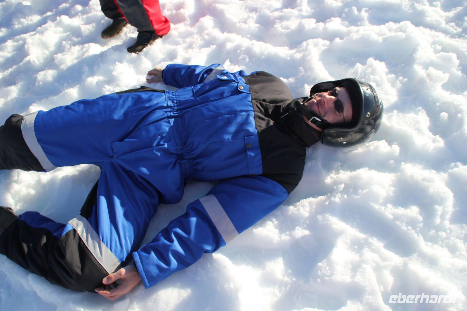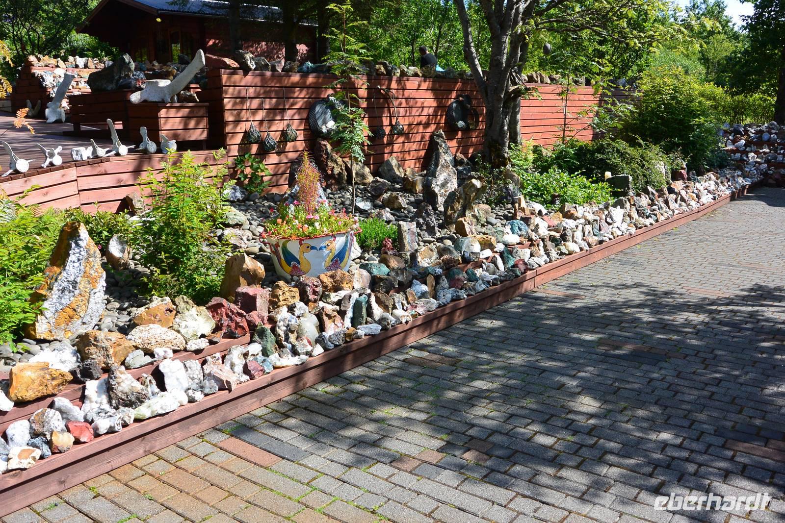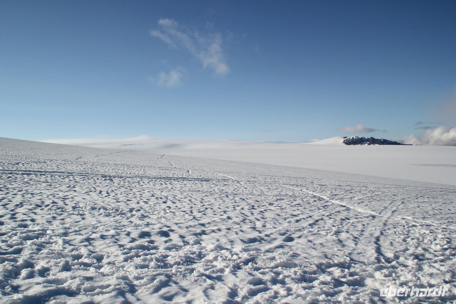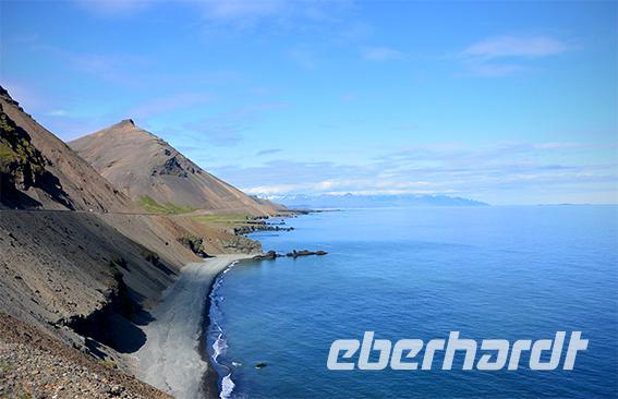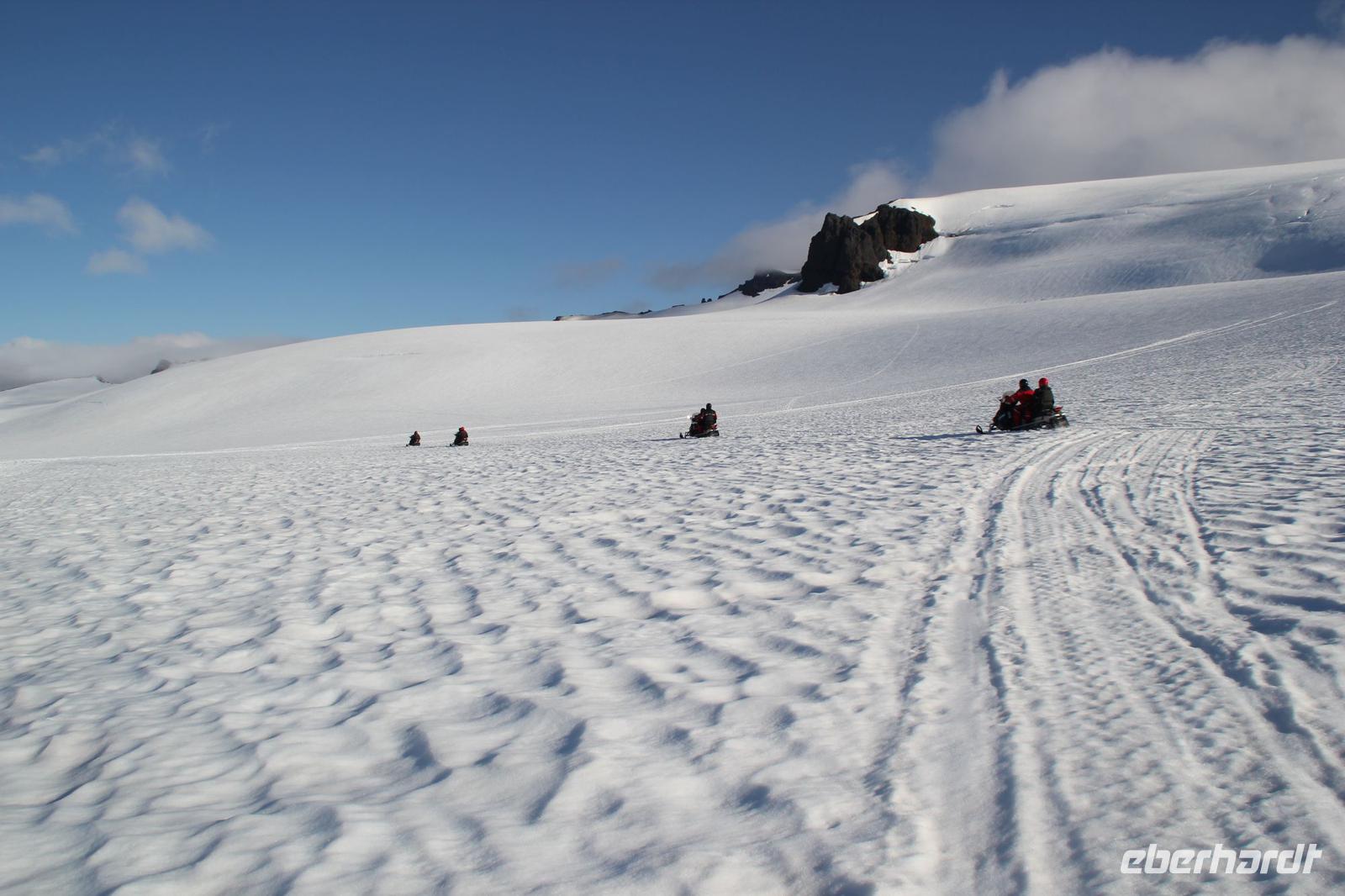 Ausgeruht starten wir von unserem idyllischen Hotel entlang der Ostfjorde in Richtung Höfn. Rosa erzählt uns während der Fahrt Legenden über Elfe und Trolle, die mal überraschend mal traurig enden. In einem Supermarkt besorge ich ein paar Kleinigkeiten für ein späteres Picknick. Wir richten mehrere Fotostopps ein und unser erstes gemeinsames Gruppenbild entsteht. In Stödvarfjördur angekommen, besichtigen wir Petras Steinhaus. Petra Maria Sveinsdottir war eine leidenschaftliche Steinsammlerin und hat zu ihren Lebzeiten eine der größten Sammlungen verschiedener Steine und Mineralien der Welt geschaffen. Bei schönstem Sonnenwetter spazieren wir durch den Garten und bewundern die verschiedenen Gesteinsarten, die überall im Garten präsentiert werden. Kleine Mitbringsel aus Stein werden gekauft und schon geht die Fahrt weiter. Unterwegs machen wir in einem kleinen malerischen Fischerstädtchen eine Picknickpause in der wir einen wundervollen Blick auf den Hafen haben. Als wir am Nachmittag unser Hotel in Höfn erreichen, warten schon die Jeeps auf uns, die uns zum Gletscher Vatnajökull zu einer abenteuerlichen Schneemobilfahrt bringen sollen. Bis auf zwei Gäste sind alle dabei. Das Wetter ist super! Klare Sicht, blauer Himmel und die Sonne strahlt. Im Vorfeld haben wir die Gruppe in Fahrer und Beifahrer geteilt, so bleiben wir zusammen, was auch viel mehr Spaß macht. Wir schlüpfen in die Schnee-Overalls, die uns zur Verfügung gestellt werden und los geht die Fahrt. Zwei Franzosen sind auch mit von der Partie. Wie die Profis düsen wir den größten Gletscher Europas hinauf und wieder erleben wir Island von einer ganz anderen Seite. Das Eis unter uns hat eine Dicke von bis zu 400 Meter, kann aber maximal sogar bis zu 1000 Meter dick sein. Zum Abschluss noch ein Gruppenfoto und zurück zum Hotel. Glücklich vom erlebten lassen wir uns das leckere Menü schmecken. Die Helligkeit nutzen noch einige, um einen kleinen Spaziergang am Strand zu unternehmen und dabei auf die Ausläufer des Gletschers zu schauen, welcher durch den Sonnenuntergang in ein rot-violettes Licht getaucht wird.