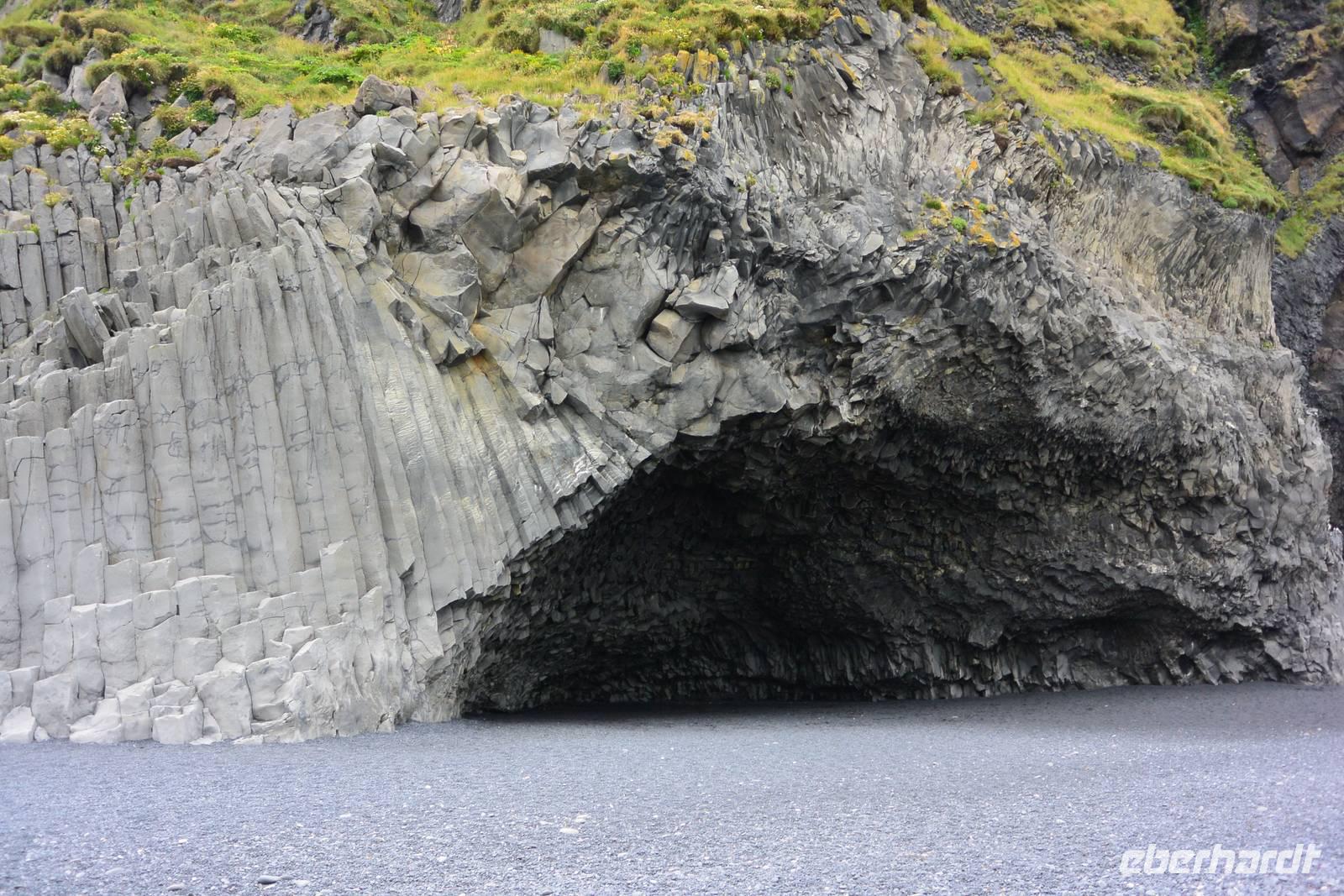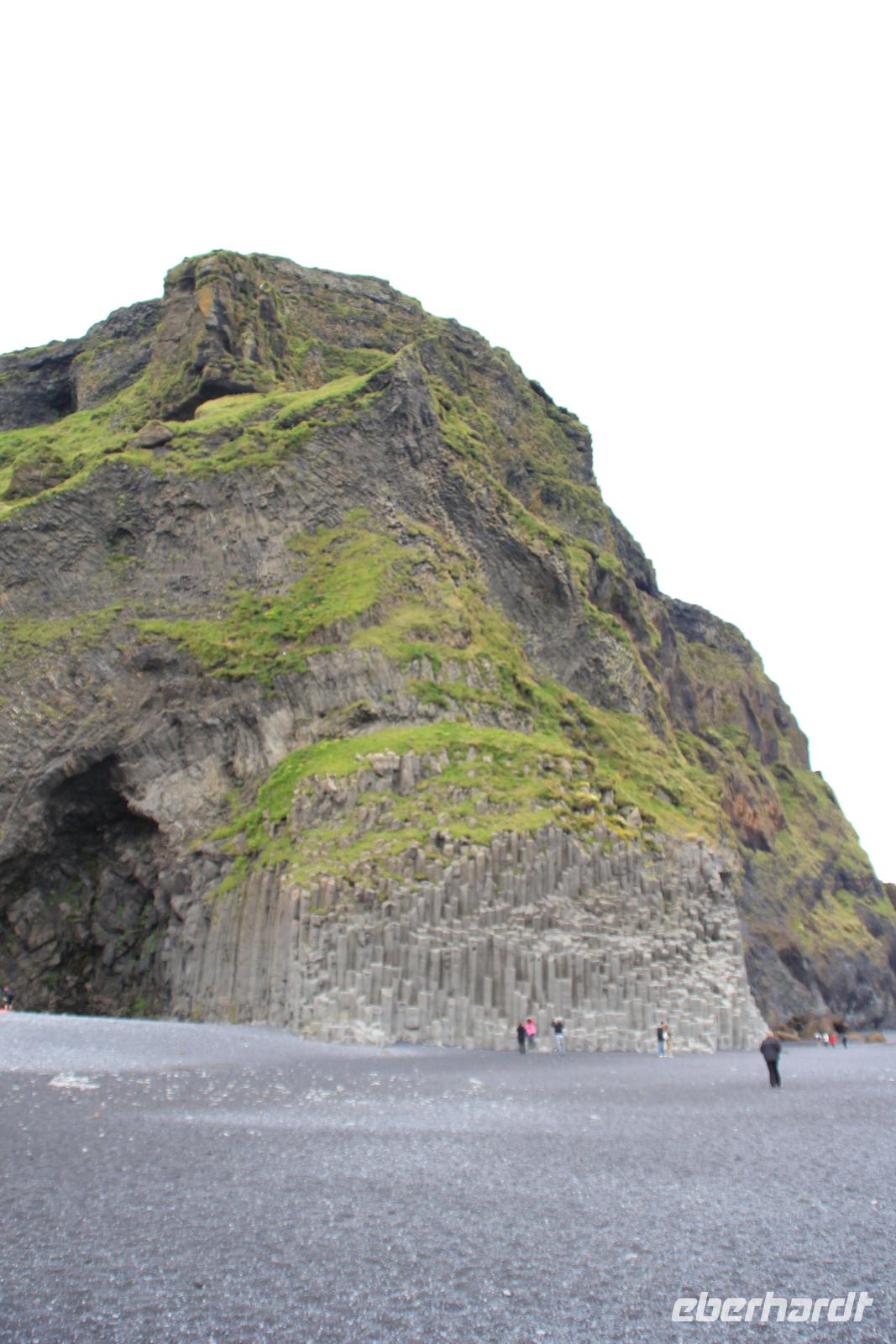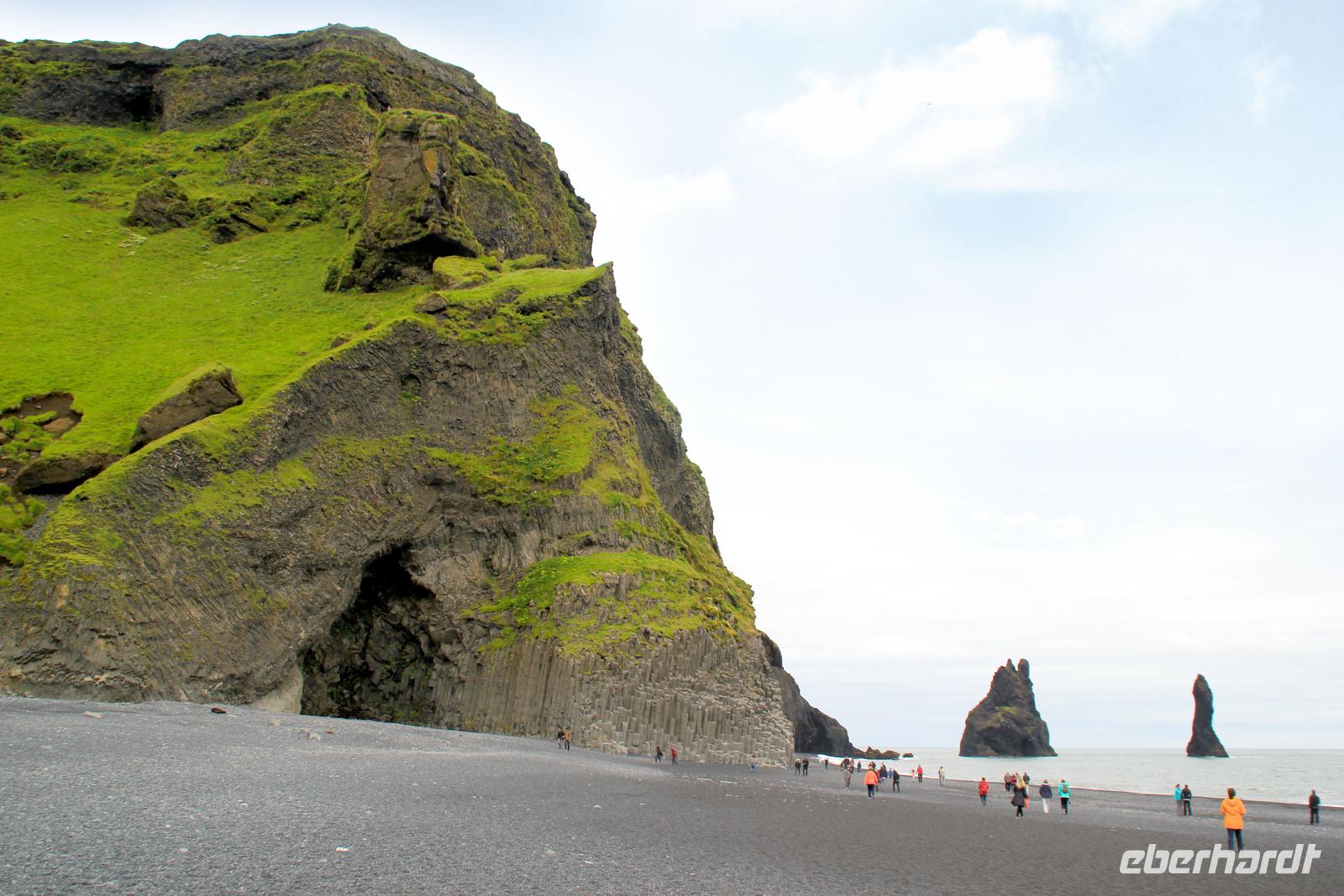 Heute ist der erste Morgen, an dem man nicht wie gewöhnlich auf strahlend blauen Himmel schauen kann. Leider hat es sich in der letzten Nacht zu gezogen. Trotzdem fahren wir gut gelaunt in Richtung Gletscherlagune Jökulsarlon, auf der sich die abgebrochenen Eisschollen des Gletschers einen Weg bis zum Meer bahnen. Dort angekommen steigen wir in ein ungewöhnliches Amphibienfahrzeug, welches fahren und schwimmen kann. Der See ist mit 248 Meter der tiefste von Island und durch seine Verbindung zum Meer, besteht er zu 50% aus Süß- und zu 50% aus Salzwasser. Wir fahren an den unterschiedlichsten Eisbergen vorbei, einige erstrahlen im schönsten Eisblau, die nächsten wieder schwarz wie die Nacht, von Vulkanausbrüchen gezeichnet. Unser deutscher Guide holt uns ein Stück Eis aus dem Wasser. Wie alt es wohl sein mag? Sie zerhackt es und jeder erhält ein Stück zum Fühlen in der Hand. Das kann man doch nicht so vorüber streichen lassen, also zaubere ich eine Flasche Brennevin zur Überraschung der Reisegäste aus dem Rucksack. Auf so ein Ereignis muss mit dem isländischen Nationalgetränk angestoßen werden. PROST! ? Wieder an Land schauen wir uns die hinaustreibenden Eisschollen auf der gegenüberliegenden Meeresseite an und verköstigen den restlichen Brennevin. So amüsiert wir auch gerade sind, die Fahrt geht weiter. Kurz entschlossen tauschen Rosa und ein Reisegast die Plätze. Von nun an erzählt uns Torsten interessante Dinge über Islands Sagen- und Märchenwelt. So erfahren wir auch von den 13 Weihnachtsmännern, die eigentlich Trolle sind und nur im Dezember zur Weihnachtszeit von ihrer Mutter aus dem Hochland in die Stadt dürfen. Kurz darauf stoppen wir an einem weiteren Ausläufer von Jökulsarlon. Rosa und eine Kollegin überraschen uns mit einem spontanen Liedchen. Danach halten wir für eine Mittagspause im Besucherzentrum vom Nationalpark Skaftafell. Gut gestärkt schauen wir uns im Anschluss den Svartifoss an. Auf dem Weg nach Vik halten wir an einem moosbewachsenen Lavafeld und in Laufskalavarda. Dort vertreiben wir mit dem Bau eines Steinhaufens böse Geister und dürfen dadurch alle wieder nach Island zurück kommen. Am frühen Abend erreichen wir Vik, so dass noch Zeit bleibt, direkt nach Dyrholaey zu fahren. Dabei kommen wir auch zu dem berühmten schwarzen Sandstrand, von welchem die emporragenden Reynisdranger gut zu sehen sind. Der Sage nach sind dies versteinerte Trolle, welche versucht haben einen Dreimaster aus dem Meer zu ziehen. Auch hier haben wir nicht das Glück Papageitaucher zu sehen. Dafür können wir eine Höhle mit riesigen Basaltsäulen bewundern. Wir fahren in unser Hotel und haben noch Zeit, dem angrenzenden riesigen Souvenirladen einen Besuch abzustatten. Nach dem levkeren Abendessen sitzen wir noch einige Zeit zusammen und erzählen vom Tag.