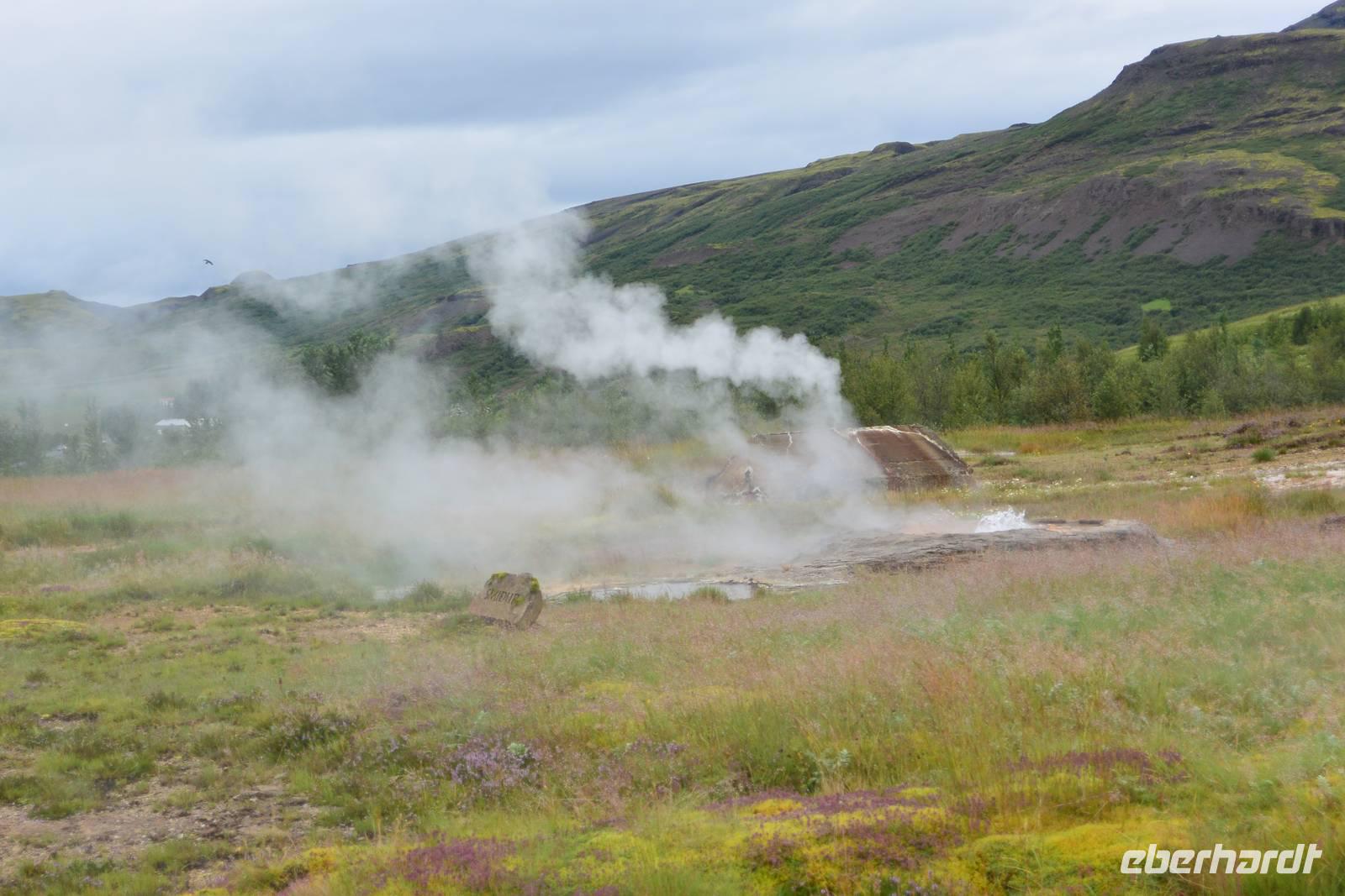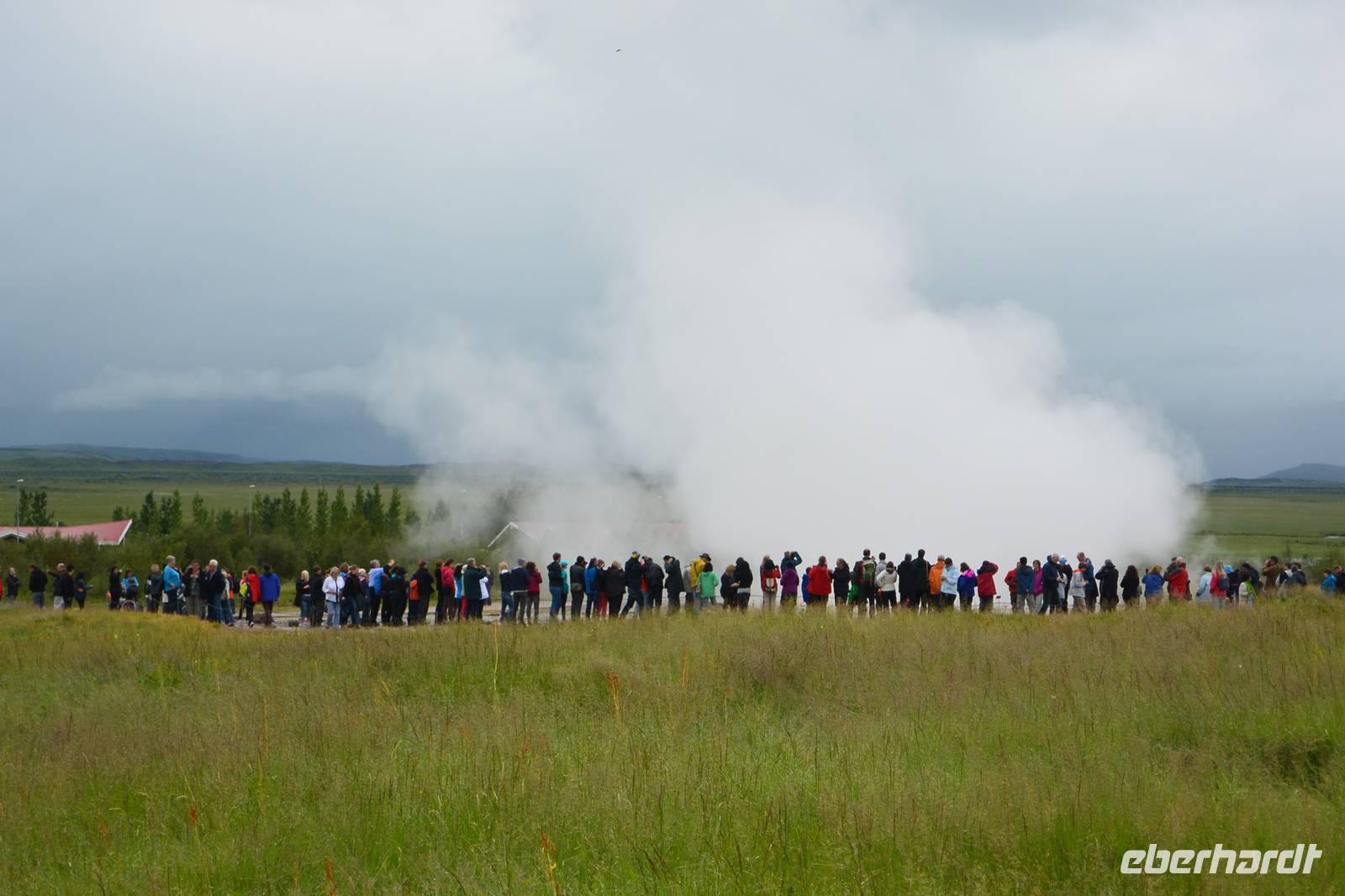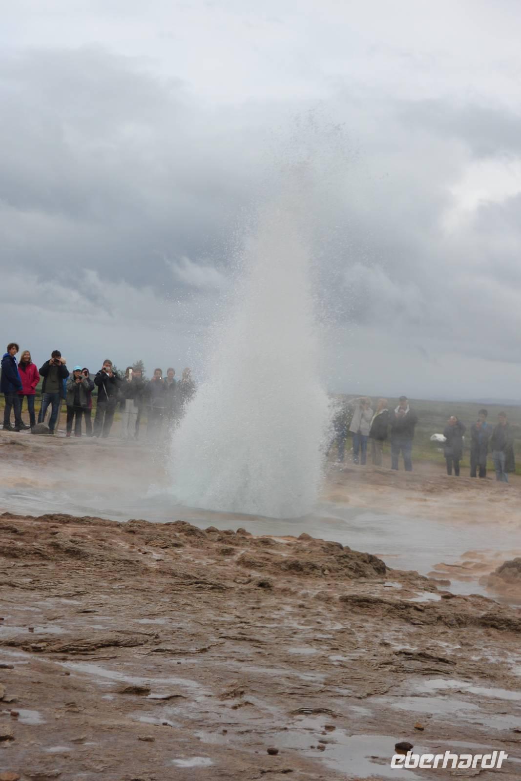 Das Wetter wird zunehmend schlechter aber für Museumsbesuche ist es perfekt. So fahren wir nach Skogar ins Freilichtmuseum, erfahren viel über die Lebensweisen in der Vergangenheit und können uns bei den alten Torfhäusern selbst ein Bild von früher machen. Wir fahren weiter zum Skogafoss, einem 60 Meter hohen Wasserfall, in dem eine Goldkiste versteckt sein soll. Weiter entlang der Küste geht es in das Gebiet des Vulkanausbruches von 2010. Wo sich der für jeden leicht auszusprechende „Eyjafjallajökull" befindet. Dieser hatte damals weite Teile dieses Landstriches mit einer dicken Schicht von Asche und Schlamm bedeckt und mit seiner riesigen Aschenwolke den Flugverkehr in Europa lahm gelegt. Wir alle können uns noch sehr gut an diese Zeit erinnern. Bei einem Film in einem Besucherzentrum sehen wir wie eine isländische Bauernfamilie dieses Ereignis erlebt und nach der Katastrophe ihren Bauernhof wieder zum Leben erweckt hat. Ein toller Film, der uns mit spektakulären Bildern begeistert. Der nächste Wasserfall steht auf dem Plan. Der Seljalandsfoss. Das besondere an ihm ist, dass man hinter ihm durch laufen kann. Ich drehe schnell eine Runde und dann schnell zurück zum Bus, denn der letzte Wasserfall dieser Reise wartet auf uns. Der Gullfoss - der Goldene Wasserfall. Wir nutzen die Zeit auch gleich für einen Mittagssnack. Danach geht die Fahrt weiter zum berühmten Geothermalgebiet „Geysir". Hier befindet sich auch der „Alte Geysir", der weltweit als Namensgeber für alle Springquellen gilt. Dieser ist jedoch schon fast ausgestorben, da sich das Wasser abkühlt und es zu keinen „Wasserausbrüchen" mehr kommt. Hier erklärt uns Rosá auch wie es zu solchen Explosionen kommt. Gemeinsam gehen wir zum Strokkur (auch als Butterfass bezeichnet), dem größten aktiven Geysir in diesem Gebiet, der ca. aller 5 min eine 10 bis 20 m hohe Wassersäule in den Himmel schießt. Schon nach kurzer Zeit sehen auch wir die Wasserkugel und die anschließende Wasserfontäne. Beeindruckt von diesem Naturphänomen versuchen wir diese auch auf einem Foto festzuhalten, was dem ein oder anderem mehr oder weniger gut gelingt. Danach fahren dann weiter nach Thingvellir in eine Driftzone zwischen der amerikanischen und der eurasischen Kontinentalplatte, die an jeder Seite von einer großen Abbruchspalte begrenzt ist. Die Platten sind inzwischen schon ca. 2 ½ km voneinander entfernt, was auch dazu führt, dass Island, welches geologisch gesehen noch ein junges Land ist, um ca. 1 bis 2 cm pro Jahr wächst. Zu Fuß gehen wir zum Thingfeld, wo früher das erste Parlament von Island tagte und u. a. die Einführung des Christentums beschlossen wurde und die Republik ausgerufen wurde. Wir schießen ein tolles Gruppenfoto an diesem bedeutenden Ort. Wieder im Bus angekommen übergeben wir Rosa und Olaf unser Trinkgeld als Dankeschön für die tolle Begleitung auf dieser Rundreise. Auf dem Weg nach Kevlavik durchfahren wir Reykjavik. Da wir sehr gut in der Zeit liegen machen wir zur Freude aller einen zusätzlichen Fotostopp bei Perlan. Dies ist eine Glaskuppel, welche sich auf 6 Heißwassertanks befindet. Da sich diese Kuppel auf dem Hügel Öskjuhlid thront, haben wir einen tollen Ausblick über die Stadt, die Faxafloi-Bucht und die Stadt. Wir fahren nach Kevlavik und verabschieden uns von unseren Begleitern Rosa und Olaf und nach einem gemeinsamen Abendessen gehen alle auf ihre Zimmer.