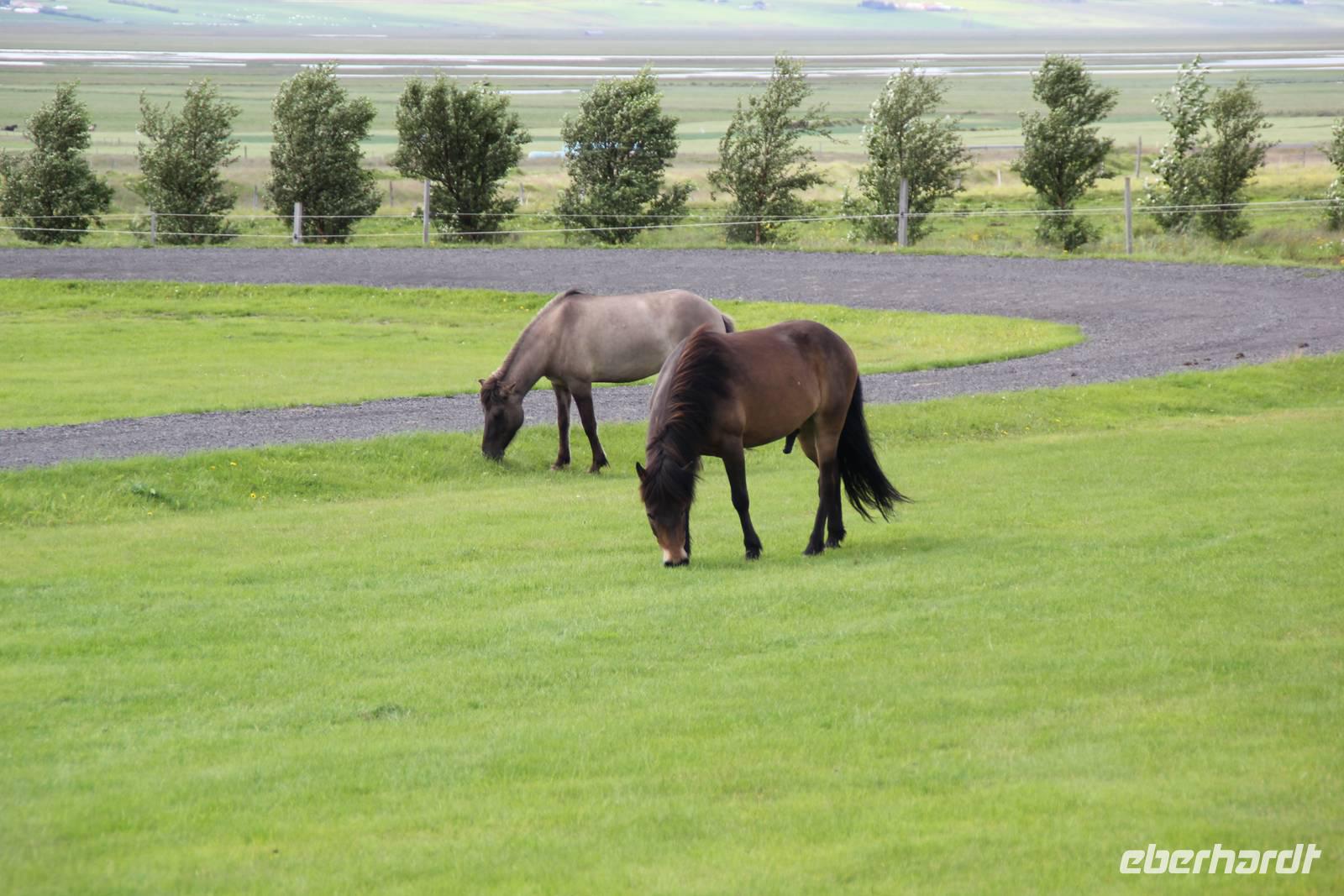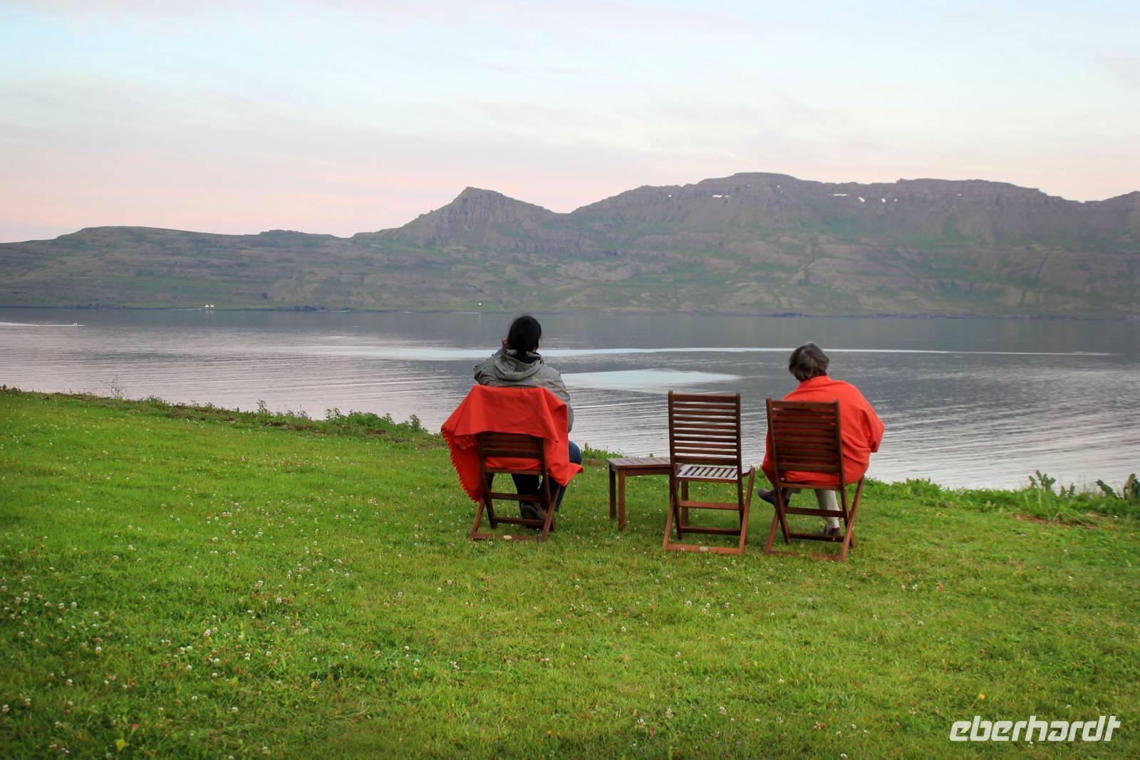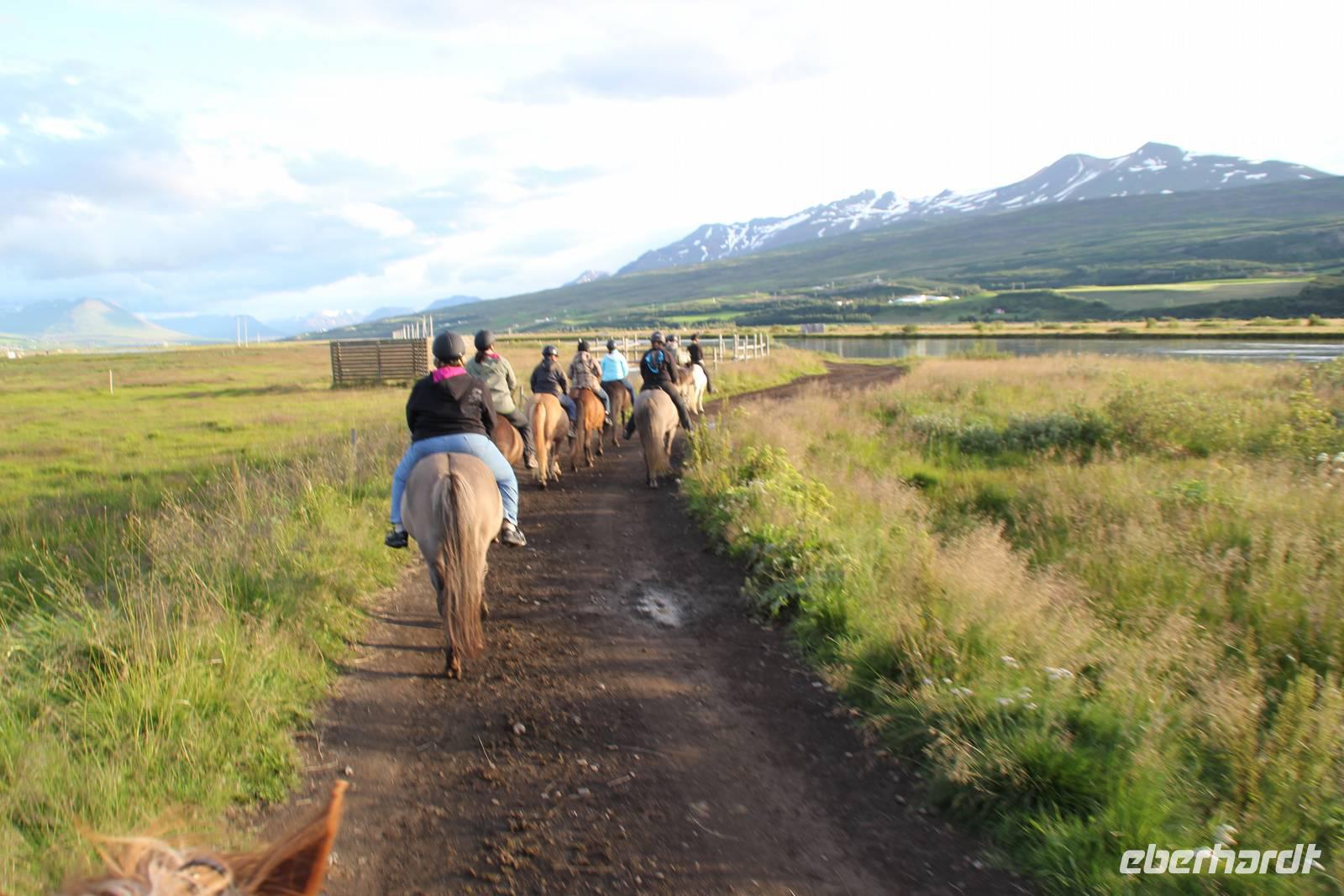 Am Abend gibt es für acht unserer Reisegäste einen besonderen Ausflug auf Islandpferden. Hoch zu Ross genießen wir in der wieder aufgetauchten Sonne die angrenzenden Berge. Zurück im Hotel lassen wir alle bei einem Gläschen den Tag Revue passieren.