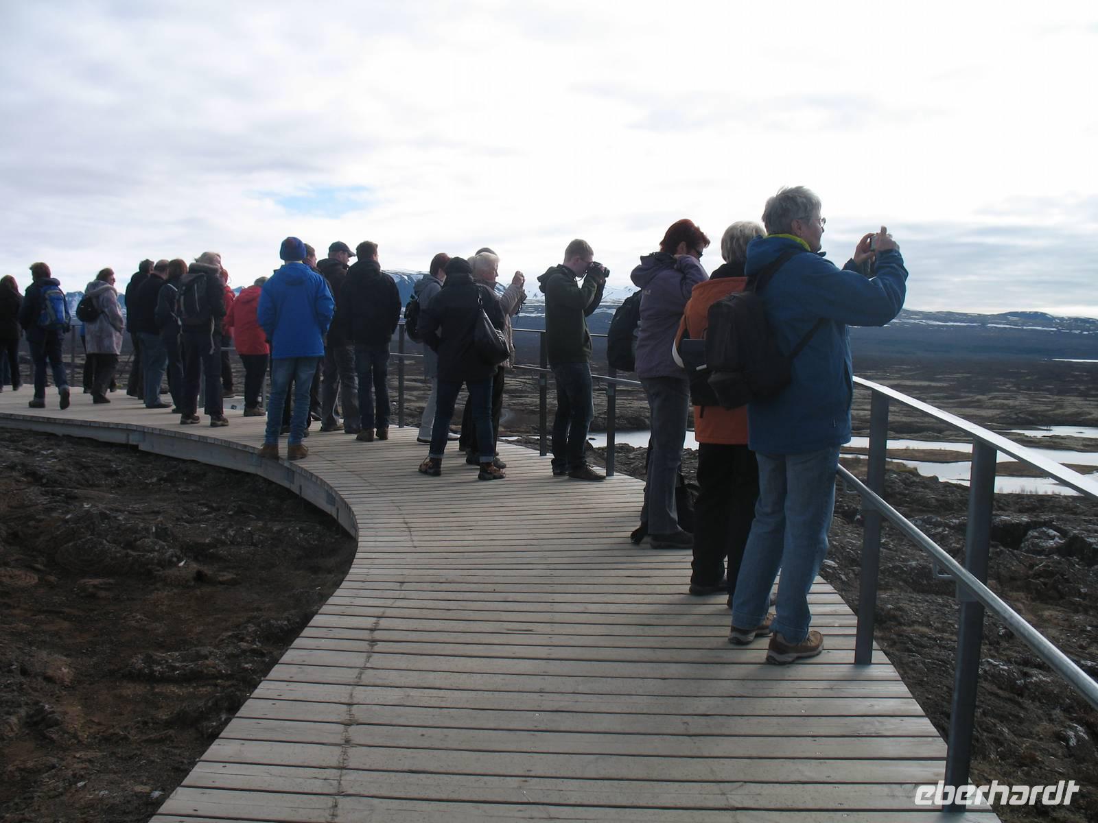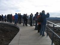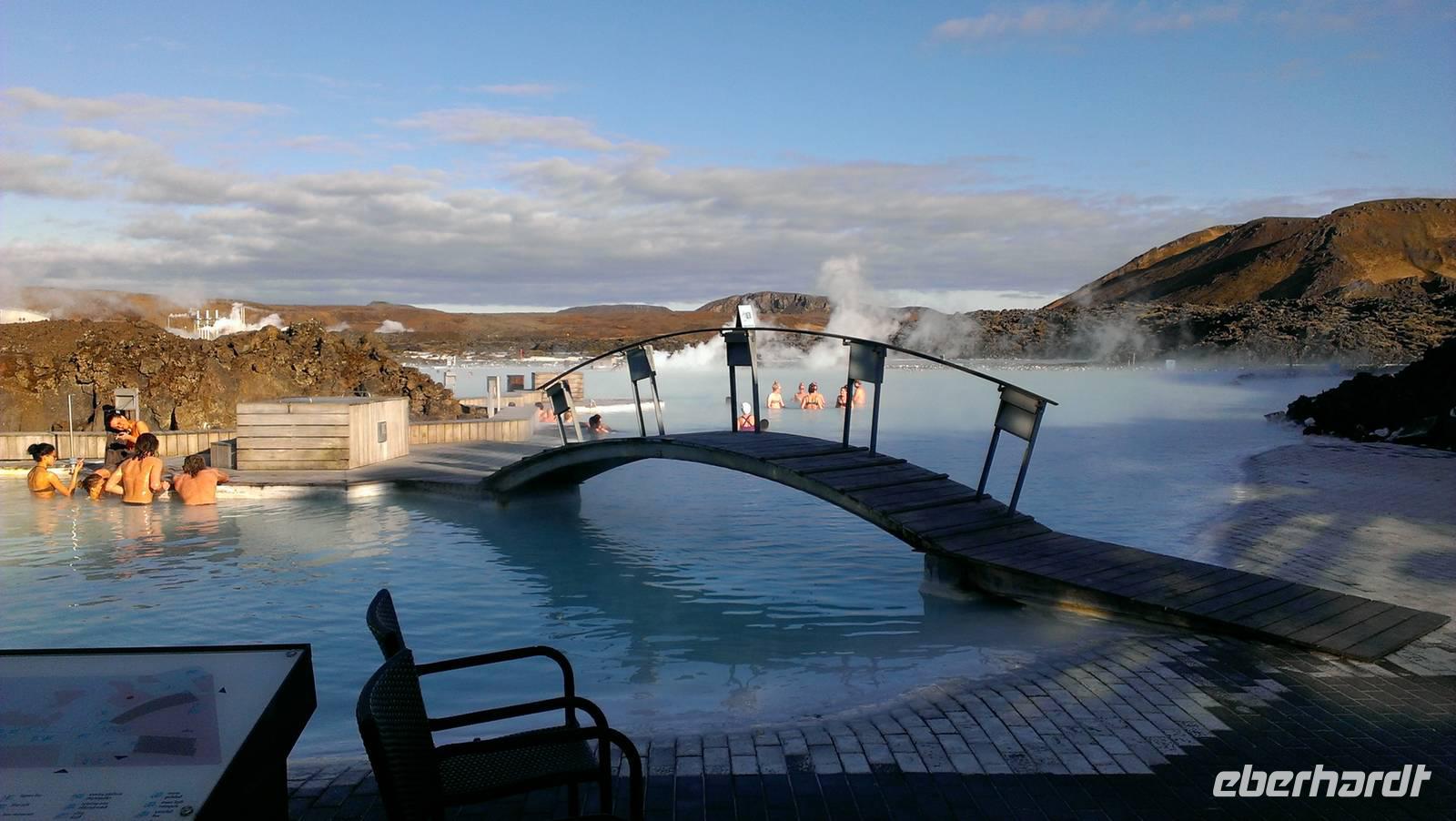 Endlich ist es soweit, unser Abenteuer Island kann beginnen Unsere Reisegruppe trifft sich pünktlich am Vormittag gegen 11.00 Uhr im Flughafen Berlin-Schönefeld. Danach geht es sofort zur Gepäckabgabe. Während einige bereits die Sicherheitskontrolle passieren, schlendern die anderen Reisegäste durch den Flughafen, um sich noch den einen oder anderen Snack zu kaufen. Unser Flug WW122 mit der WOW-Airline hebt mit allen 19 Reisegästen pünktlich um 13.00 Uhr nach Keflavík ab. Nun liegen noch rund 2.385,43 Kilometer Luftlinie auf unserem circa 3,5-Stunden-Flug nach Island vor uns. Die nächsten fünf Tage wollen wir den flächenmäßig zweitgrößten Inselstaat in Europa mit seiner vielfältigen Natur und einzigartigen Geschichte näher kennenlernen. Nach der schnellen Passkontrolle und der Entgegennahme unserer Koffer tauschen wir an der Wechselstube unsere Euros gegen erste isländische Kronen. In der Eingangshalle des Flughafen "Flugstöð Leifs Eiríkssonar" (kurz "Leifsstöð" genannt) von Keflavík werden wir von unserer örtlichen Reiseleiterin Berglind und unserem Busfahrer Gudmundur (Gummi) freundlich empfangen. Eigentlich sollte zur gleichen Zeit noch eine Dame aus Frankfurt zu unserer Reisegruppe hinzustoßen. Allerdings hat ihr Flug eine Verspätung von über 30 Minuten, so dass wir sofort zu unserem ersten Highlight, die Blaue Lagune "Bláa Lónið", aufbrechen. Dieses Thermalfreibad befindet sich rund 30 Minuten Busfahrt vom Flughafen Keflavík entfernt auf der Reykjanes-Halbinsel. Während die Reisegruppe bereits entspannen kann, wird unser fehlender Reisegast pünktlich durch die Reisebegleitung abgeholt. Gegen 16.30 Uhr befinden sich dann alle Gäste, entweder als Badegast oder als Besucher, in der Blauen Lagune. Während der Großteil der Gruppe baden geht, bestaunt der andere Teil die interessante Landschaft oder genießt ein Abendessen im Restaurant. Jeder von den Badegästen hat ein Armband zum Öffnen und Schließen der Schränke erhalten. Bevor wir ein entspanntes Bad im 37 bis 42 Grad heißen Thermalwasser aus Mineralsalzen, Kieselerde und Algen genießen können, soll sich gründlich geduscht werden. Dafür sind Duschgel und Shampoo der eigenen Hausmarke "Blue Lagoon" für die Gäste kostenfrei und in ausreichender Menge vorhanden. Wir fühlen uns wie in einer riesengroßen heißen Badewanne. Am Rand des Thermalfreibades befinden sich große Holzkästen mit weißem Schlamm aus Kieselerde, welches die Gäste als reinigende Gesichtsmaske auftragen können. Außerdem gibt es eine Bar mit Getränken mitten im Wasser. Um sich dort etwas zu kaufen, brauchen die Gäste einfach ihr Armband anlegen und sie bezahlen dann später bequem bei der Kasse am Ausgang. Bei unserem fast dreistündigen Aufenthalt genießen wir auch einen atemberaubenden Blick über die einzigartige Landschaft aus schwarzem Lavagestein. Durch den vorhandenen Nebel erscheint uns die Blaue Lagune fast schon magisch und geheimnisvoll. Das Wasser hat erwiesenermaßen eine heilende Wirkung unter anderem gegen Schuppenflechte und andere Hautkrankheiten. Die blaue Farbe entsteht durch die Kieselsäure, welche besonders die blauen Strahlen bei Sonnenlicht zurückwerfen. Wer möchte, kann auch gern angebotene Saunen, Massagen oder Dampfbäder nutzen. Alles in allem ein wirklich gelungener Start für unser Abenteuer Island Bevor wir um 19.00 Uhr zu unserem 3-Sterne-Hotel "Bjork" chauffiert werden, gönnt sich der ein oder andere noch einen kleinen Imbiss oder ein Getränk in der Cafeteria. Die Busfahrt von rund 50 Kilometern dauert ungefähr 45 Minuten und der Check-In im Hotel verläuft reibungslos. Die Mehrheit unserer Reisegruppe freut sich auf ihr Bett und Schlaf, die Anderen gehen noch ins amerikanisch angehauchte Restaurant "Ruby Tuesday" zum Abendessen. Idealerweise befindet sich dieses Restaurant nur wenige Schritte gegenüber unseres Hotels. Das Essen schmeckt uns und die Preise sind relativ im Rahmen für isländische Verhältnisse. Im Anschluss schauen wir noch im 24-Stunden-Supermarkt vorbei. Es ist bereits 22.30 Uhr, dennoch ist es noch sehr hell draußen. In Deutschland wäre es um diese Uhrzeit bereits stockdunkel. Daran sollen wir uns erst einmal gewöhnen. Dann freuen auch wir uns auf unsere Betten und ein wenig Schlaf. Vielleicht träumt der ein oder andere auch schon von den Erlebnissen und Highlights der kommenden Tage