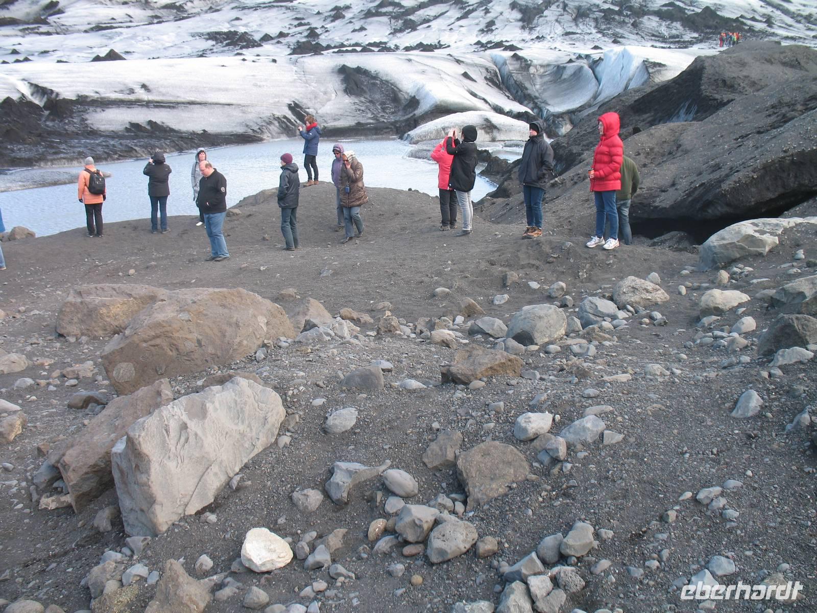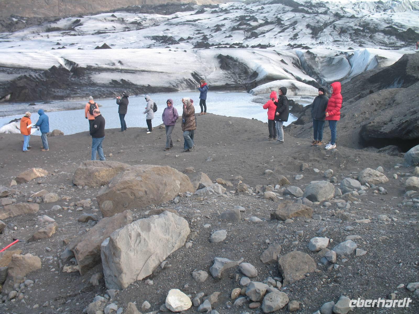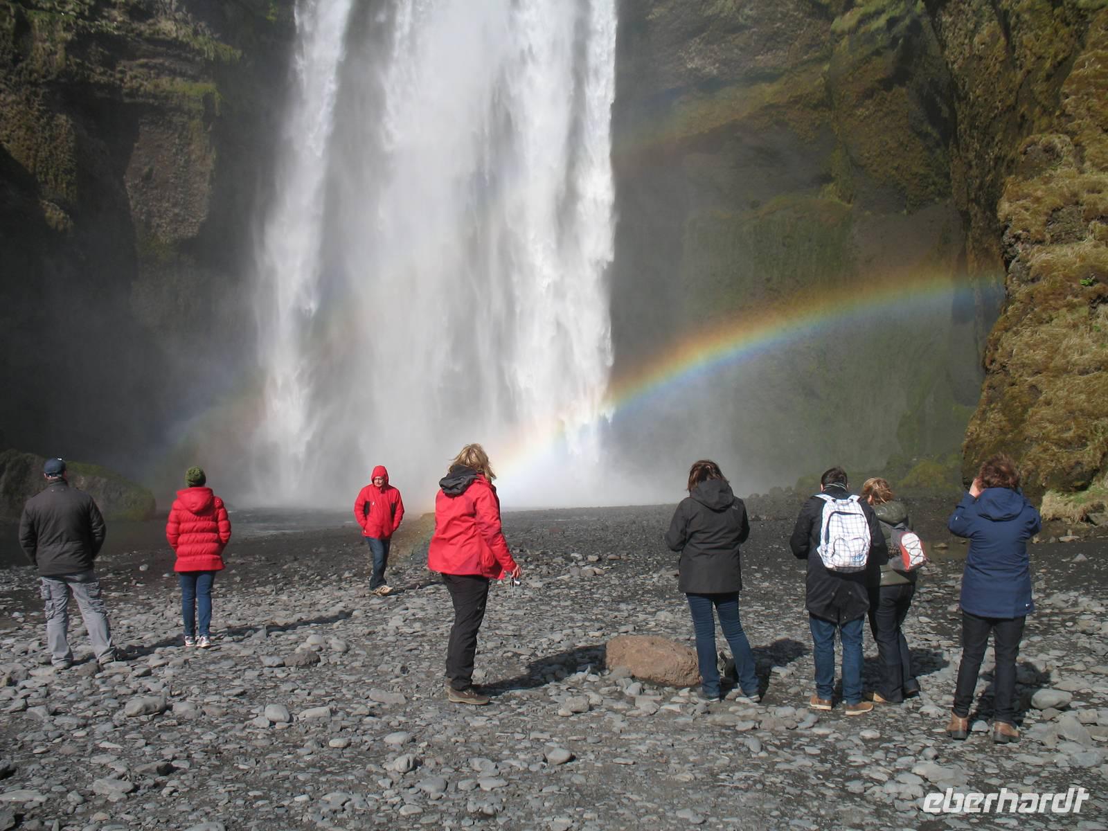 Bereits um 8.30 Uhr starten wir zu unserem heutigen Reiseziel - Die Südküste Islands mit ganz vielen Highlights auf unserer Fahrt. Die gesamte Reisegruppe nimmt an diesem fakultativen Ausflug teil und die vielen kleinen Eindrücke und Erlebnisse werden sich für jeden sicherlich lohnen Was das Wetter betrifft, werden wir heute noch von allem etwas erleben! Daher ist es besonders empfehlenswert, dass wir uns nach dem Zwiebelprinzip kleiden und uns so je nach Wetteranlage anpassen können. Unsere Fahrt führt uns durch eine abwechselnde interessante Landschaft, bestehend aus dunklem Lavagestein vereinzelt mit Moosbedeckung, schneebedeckter Gletscher und immer grüner werdender Flächen. Erstes Highlight an diesem Tag ist der Vulkan Eyjafjallajökull, welcher besonders 2010 Bekanntheit durch seine Aschewolke und der wochenlangen Stilllegung des Flugverkehrs in Europa erlangte. Am Fuße des Vulkans hatte ein Bauer seinen Hof, welcher bei dem Ausbruch schwer beschädigt wurde. Im von ihm errichteten Besucherzentrum in Þorvaldseyri können wir die Geschichte in Bildern betrachten. Wir sehen in einem bewegenden Kurzfilm das Schicksal dieser Bauernfamilie und auch den tollen Zusammenhalt der Islände beim Wiederaufbau. Berglind erzählt uns, dass im Grunde genommen in Island jeder jeden kennt und alle auch irgendwie miteinander verwandt oder bekannt sind. Alle unterstützen sich gegenseitig und haben geholfen, den Hof nach dem Vulkansubruch wieder aufzubauen. Das großartige Zusammengehörigkeitsgefühl der isländischen Einwohner wird an diesem Beispiel besonders sichtbar. Nächstes Zwischenziel ist die Gletscherzunge "Sólheimajökull" des Mýrdalsjökulls. Die Busfahrt von 30 Minuten führt uns über eine holprige bucklige Schotterstraße. Aber der Anblick des "ewigen Eis" soll sich wirklich für uns lohnen! Wir gehen zu Fuß ganz nah an die Gletscherkante heran. Wer möchte, kann das Gletschereis auch berühren. Festes Schuhwerk ist an dieser Stelle besonders empfehlenswert. In der Nähe der riesigen Gletscherzunge wird es doch sehr kalt, so dass ein Paar Handschuhe für warme Hände sorgen würden. Unsere Reise geht weiter zum Küstenort Vík. Hier verbringen wir unsere Mittagspause. Wir stärken uns mit einer leckeren Suppe oder auch einem großen Burger mit Pommes. Es bleibt uns noch Zeit im Souvenirshop vorbeischauen und kleine Andenken zu kaufen oder auch an den naheliegenden Küstenstrand zu laufen. Danach fahren wir zum schwarzen Sandstrand in Reynisfjara und wir erblicken die bekannten, aus dem wellenreichen Meer herausragenden Felsnadeln Reynisdrangar. Hier ist es extrem windig, so dass wir Richtung Strand vom Wind geschoben werden und uns nicht unbedingt bewegen brauchen. Dafür ist der Rückweg umso anstrengender, da wir kaum vorwärts kommen und vom starken Wind immer wieder zum Strand zurück gedrückt werden. Am Nachmittag besichtigen wir das Skógar-Museum und wir erhalten einen Einblick wie die ersten Bewohner Islands gelebt und gewohnt haben. Eine deutschsprachige Mitarbeiterin des Museums erläutert uns die vergangene isländische Lebensweise. Wir haben wieder strahlenden Sonnenschein, das erinnert an das Sprichwort: "Wenn Engel reisen, dann lacht der Himmel!" Im Anschluss fahren wir nur wenige Minuten zum Waldwasserfall Skógafoss. Dank blauem Himmel und Sonnenschein können wir den etwa 62 Meter hohen Wasserfall sehr gut fotografieren. An der Seite gibt es einen Fußweg mit Treppe, um zu einer Aussichtsplattform an der Fallkante zu gelangen. Im wirklich schnellen Tempo bewältigen zwei unserer Reisegäste diesen Weg rauf und wieder runter. Mit Applaus werden sie von uns empfangen Letzter Höhepunkt dieses erlebnisreichen Tages ist der Wasserfall Seljalandsfoss mit einer Fallhöhe von rund 65 Metern. Hier können wir sogar durch eine Höhle über einen kleinen steinigen Pfad den Wasserfall rundherum von allen Seiten betrachten. Wichtig ist natürlich rutschfestes Schuhwerk und auch eine Regenjacke aufgrund weniger erfrischender Wasserspritzer ist zu empfehlen. Bevor wir nach Reykjavík zurückfahren, probieren wir noch von der Reisebegleitung bereits am Flughafen und Anreisetag organisierte isländische Spezialitäten. Dazu gehören der landestypische mit Kümmel-Aroma versehene Kartoffelschnaps Brennivín, isländischer Trockenfisch und eine Auswahl an isländischer Lakritze. Wir probieren alle diese typischen Köstlichkeiten. Auf der Rückfahrt nach Reykjavík erzählt uns Berglind noch einige spannende Geschichten über Trolle und die Sagen Islands. Für uns sind es eher abenteuerliche Erzählungen, aber die Isländer glauben tatsächlich an diese Sagen zu Geistern, Elfen und anderen mysteriösen Gestalten. Gegen 19.15 Uhr kommen wir wieder an unserem Hotel an. Wir verabschieden uns von Berglind und bedanken uns nochmals für die tolle örtliche Reiseleitung! Das Abendessen genießen wir wieder im Hotelrestaurant "Potturinn & Pannan", in welchem wir bereits an unserem zweiten Tag gespeist haben. Auch dieses Mal ist das Essen sehr gut. Dann begeben wir uns auf unsere Zimmer und packen noch die restlichen Sachen in unsere Koffer, da wir am nächsten Morgen besonders zeitig zurück nach Deutschland fliegen werden.