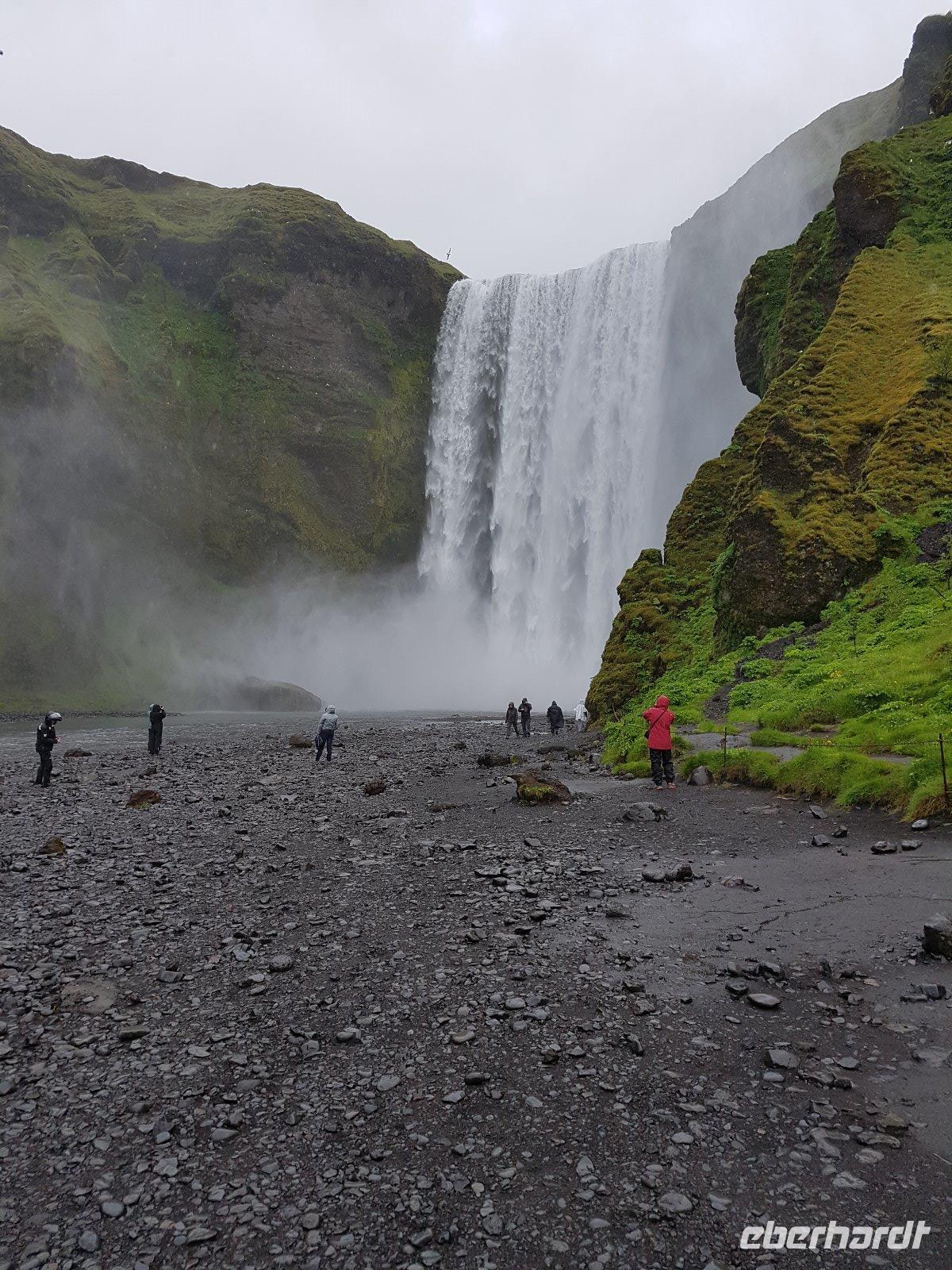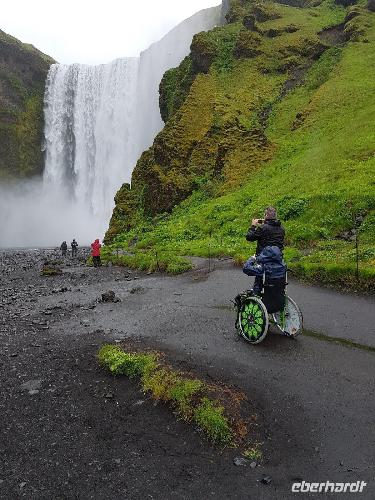 Den Skogafoss erleben wir leider bei Regen. Dennoch lassen es sich die meisten nicht nehmen, trotz des für Rollis ungünstigen Wegs diesen imposanten Wasserfall aus der Nähe zu betrachten.