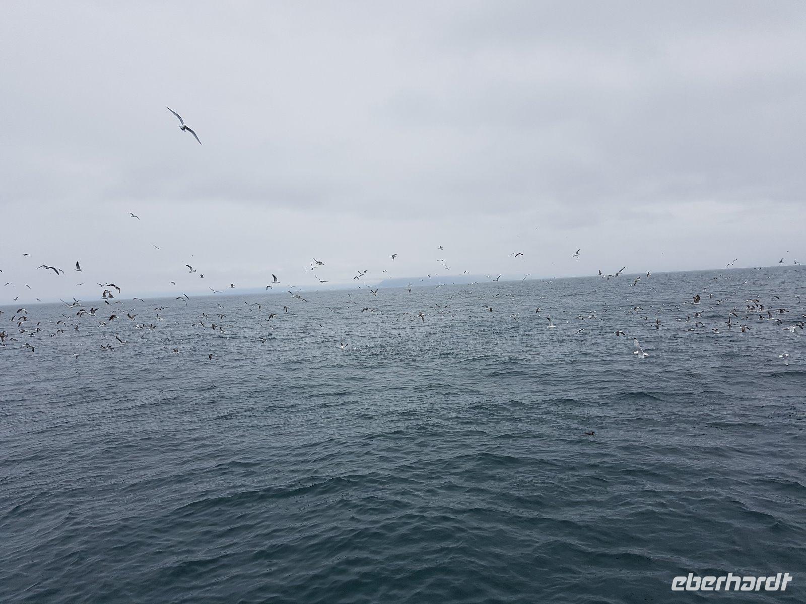 Am Nachmittag gehen auch wir dann an Bord eines Schiffes. Zur Walbeobachtung geht es hinaus aufs offene Meer. Wenngleich die optische Ausbeute dieser „Safari" geringer als erhofft war, hat uns das Ganze als Gesamterlebnis inklusive der dicken, fast polartauglichen Kleidung welche ausgegeben wurde, doch viel Spaß gemacht. Noch beim gemeinsamen Abendessen war demzufolge das „Whale Watching" Thema.