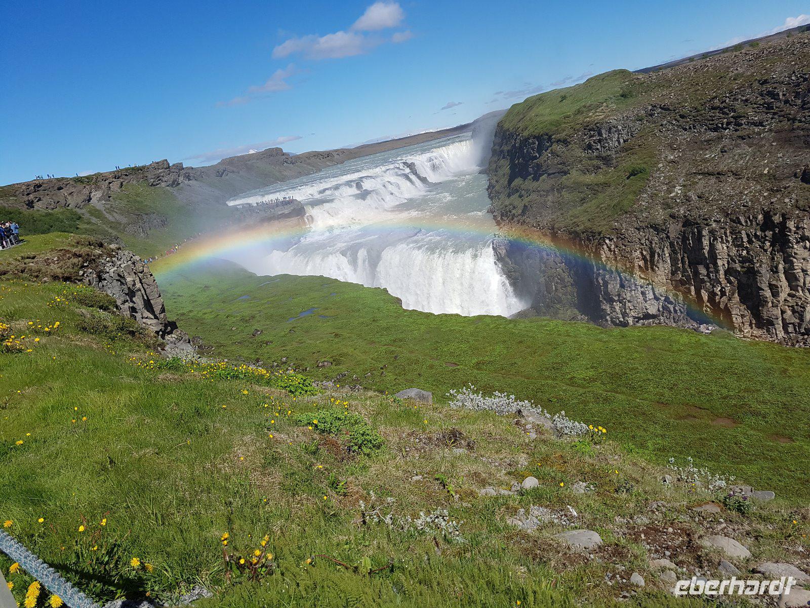 Aber auch der Gullfoss, fraglos einer der schönsten Wasserfälle des Landes fasziniert. Der Regenbogen über dem mächtigen Taleinschnitt welchen das Wasser geschaffen hat ist dann schon fast zu schön...