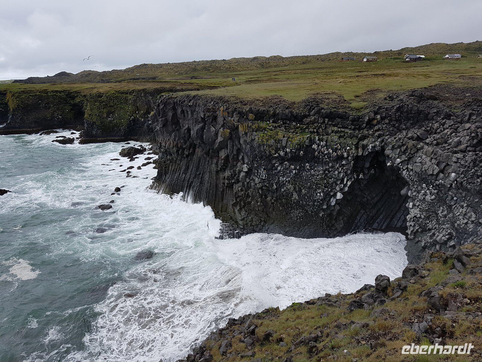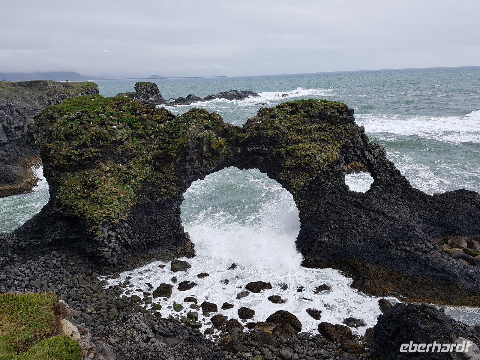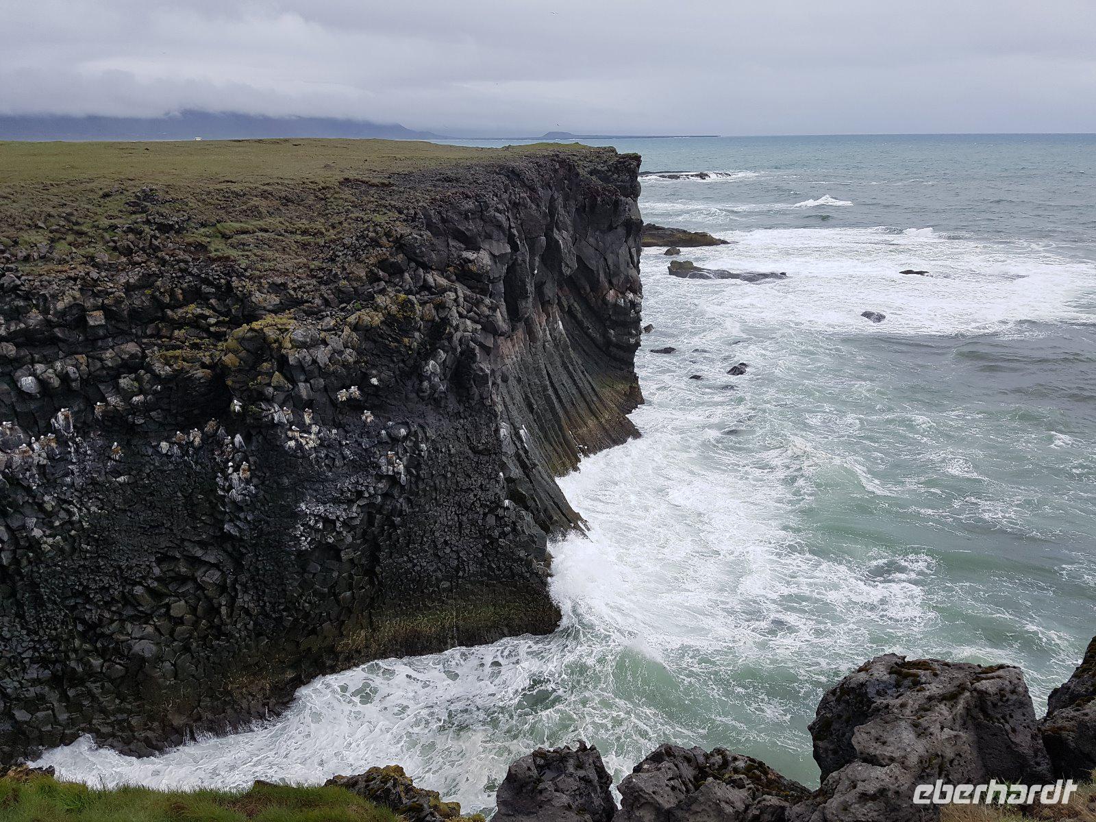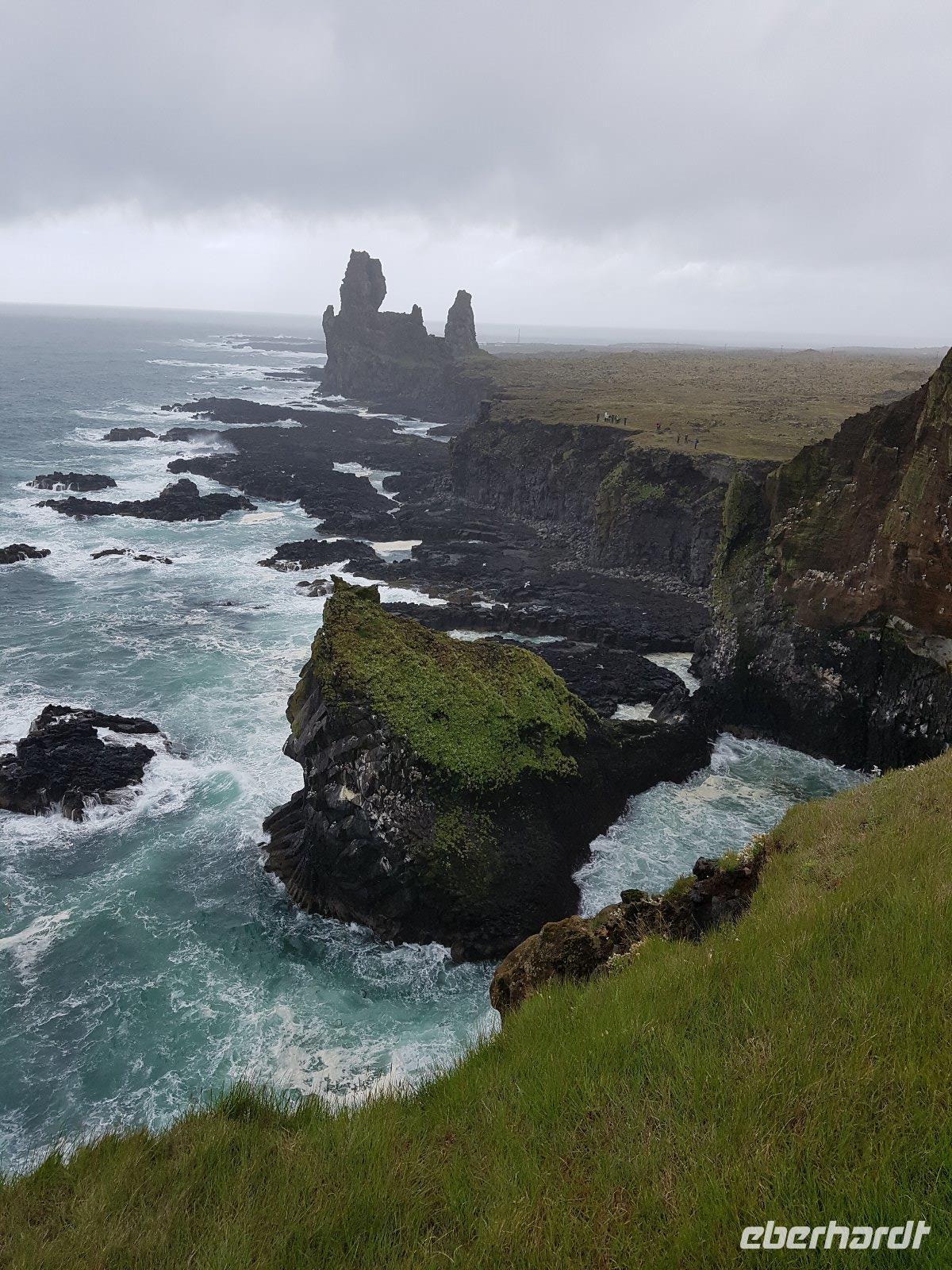 In Budir pausieren wir an der alten Kirche, welche das Meer im Hintergrund, ein Postkartenmotiv abgibt. In Arnastapir geht es entlang eines berollbaren Weges zum Steintroll und zu den Aussichtskanzeln, welche wieder tolle Blicke auf die Klippen und den wilden Atlantik ermöglichen.