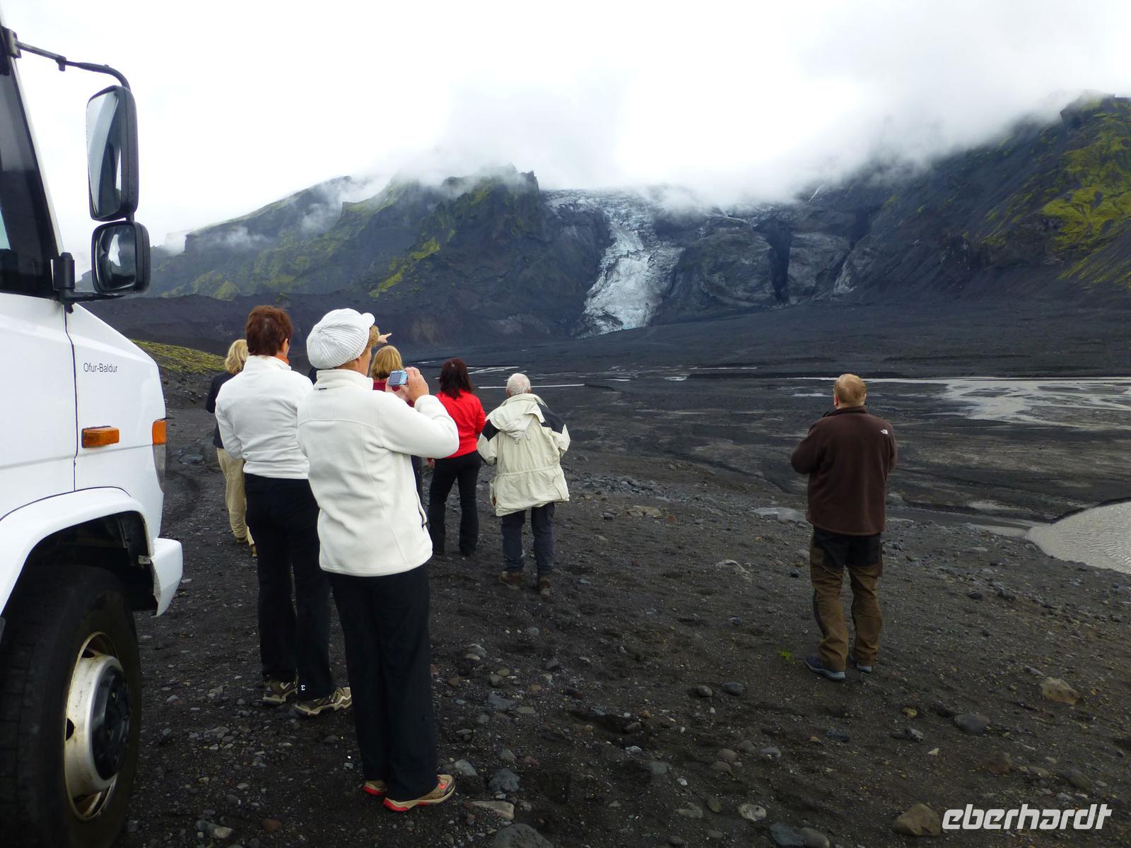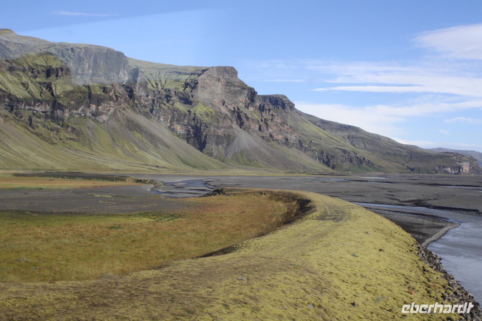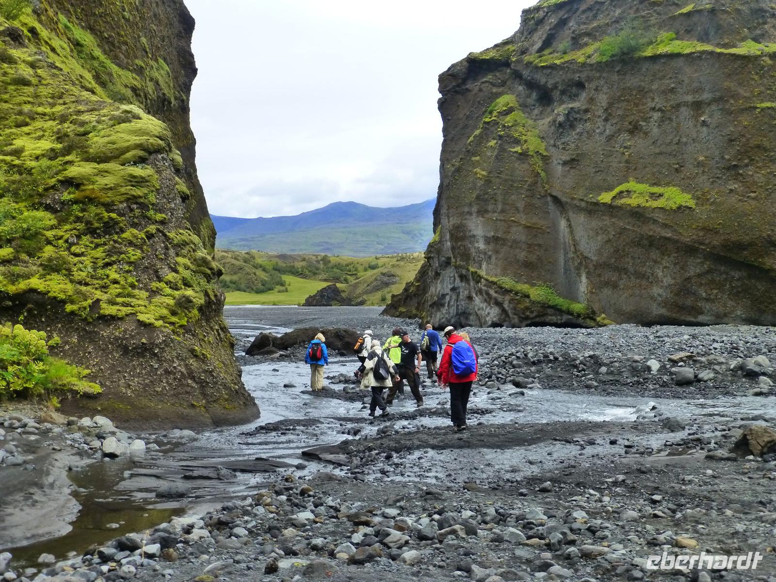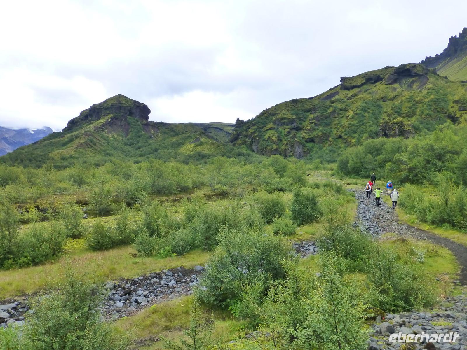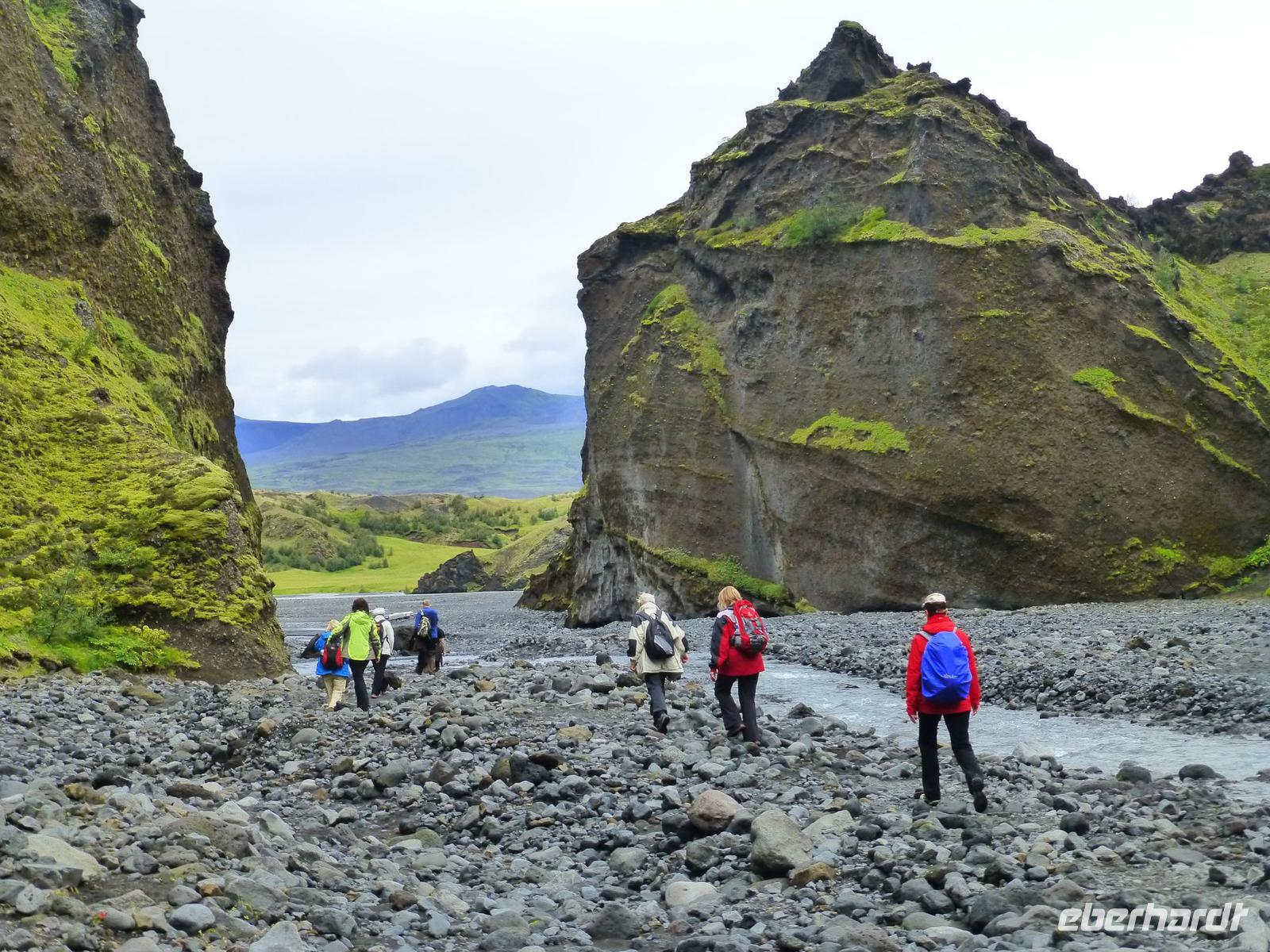 Über eine Schotterstraße ging es dann durch grüne Ebenen ins Gletschertal Thorsmörk, was übersetzt „Thors Wald" bedeutet, also der Wald des alten germanischen Gottes Thor. Das Tal wird flankiert von mächtigen Gletschern, einer davon ist die Gletscherzunge des berühmten Vulkans Eyjafjallajökull, der 2010 den Flugverkehr in ganz Europa zum Stillstand brachte. Einige Fahrtminuten weiter halten wir am Fuße der Bergkette.