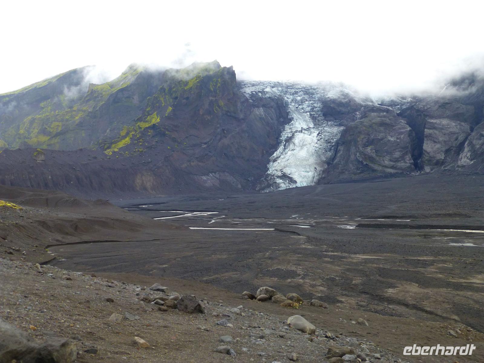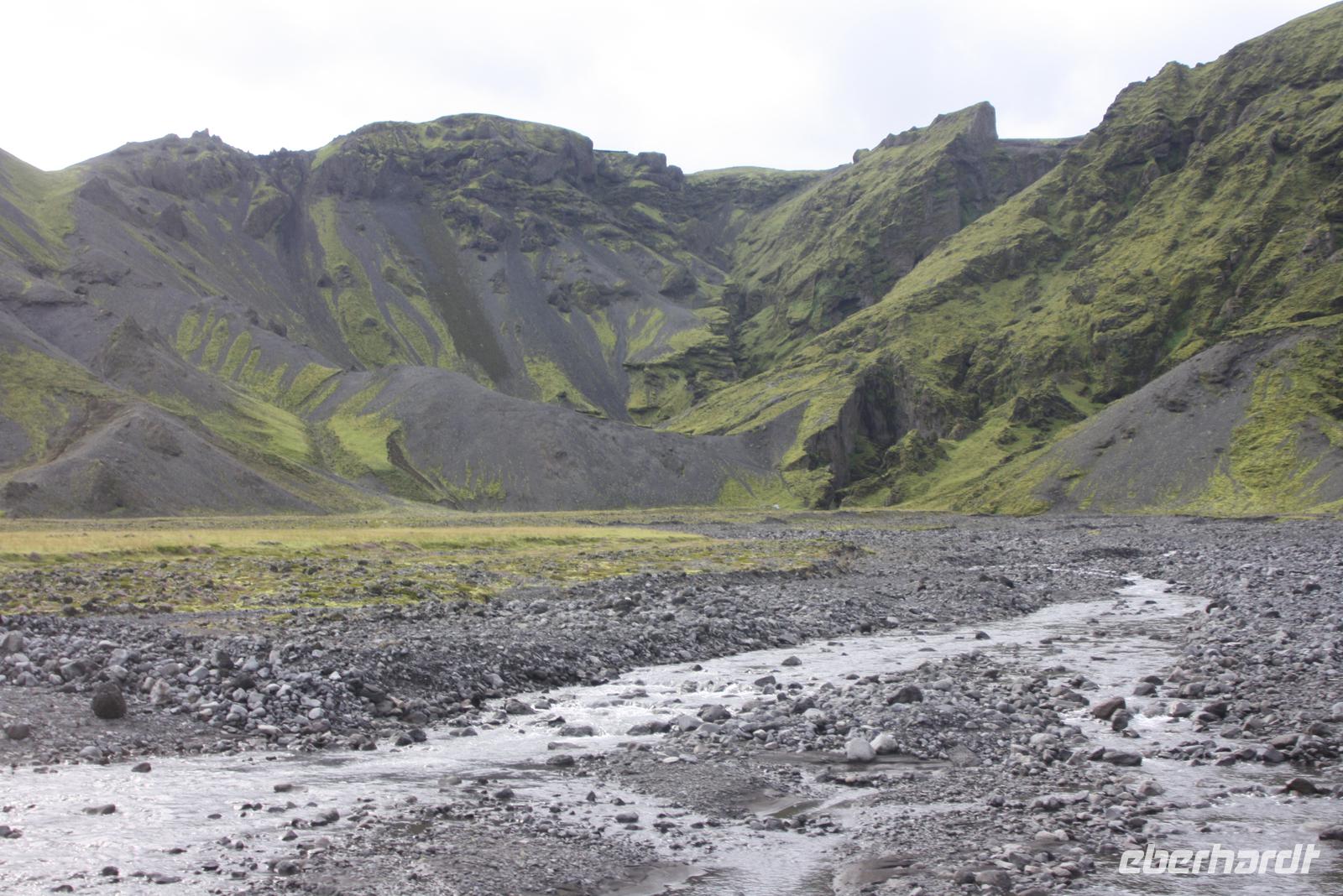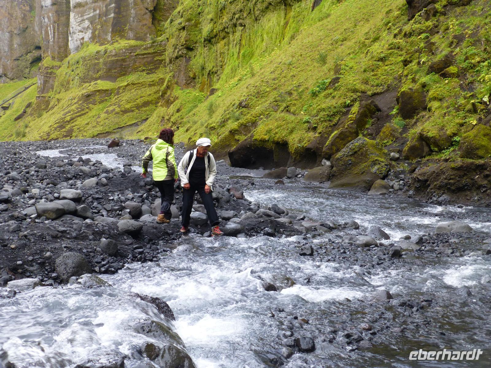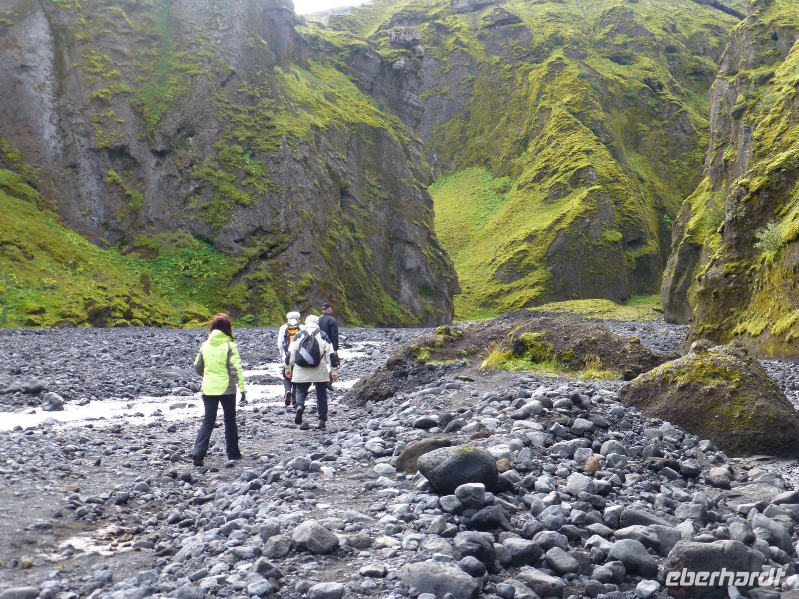 Über eine Schotterstraße ging es dann durch grüne Ebenen ins Gletschertal Thorsmörk, was übersetzt „Thors Wald" bedeutet, also der Wald des alten germanischen Gottes Thor. Das Tal wird flankiert von mächtigen Gletschern, einer davon ist die Gletscherzunge des berühmten Vulkans Eyjafjallajökull, der 2010 den Flugverkehr in ganz Europa zum Stillstand brachte. Einige Fahrtminuten weiter halten wir am Fuße der Bergkette.