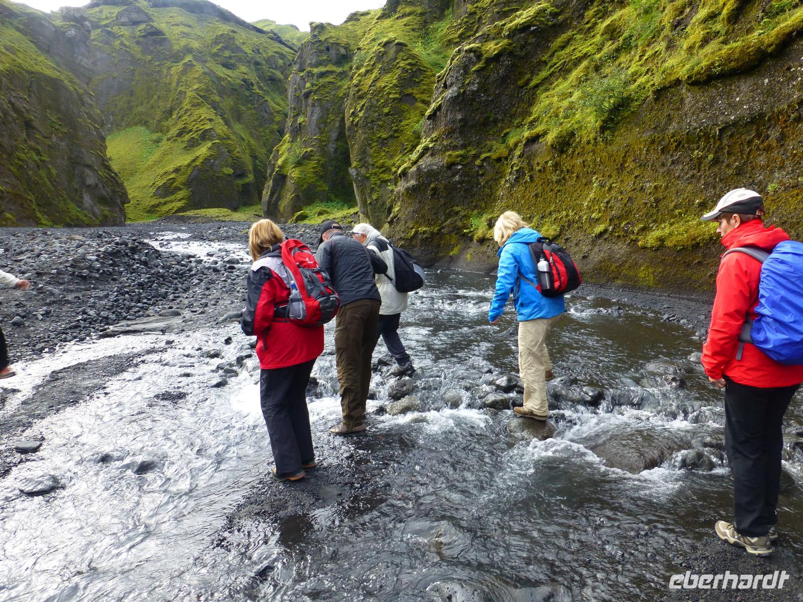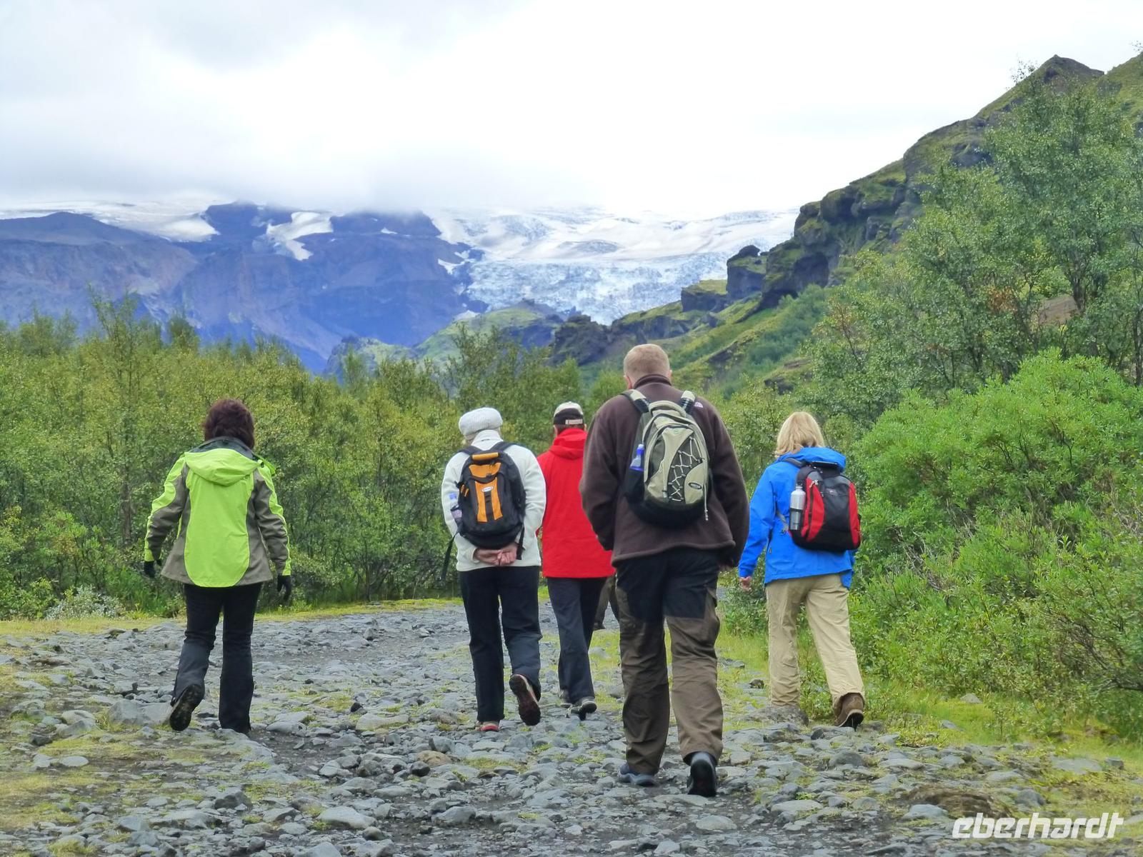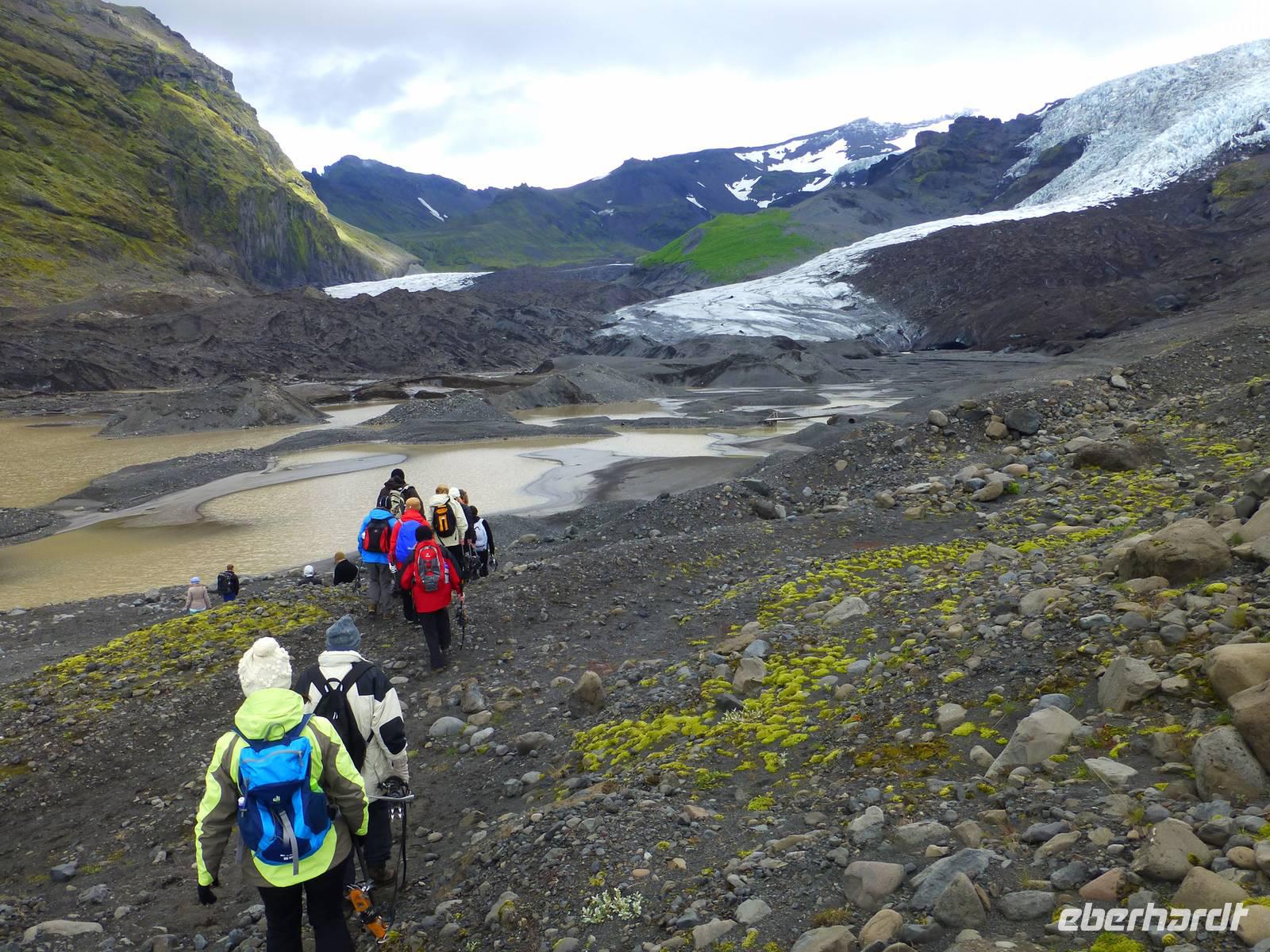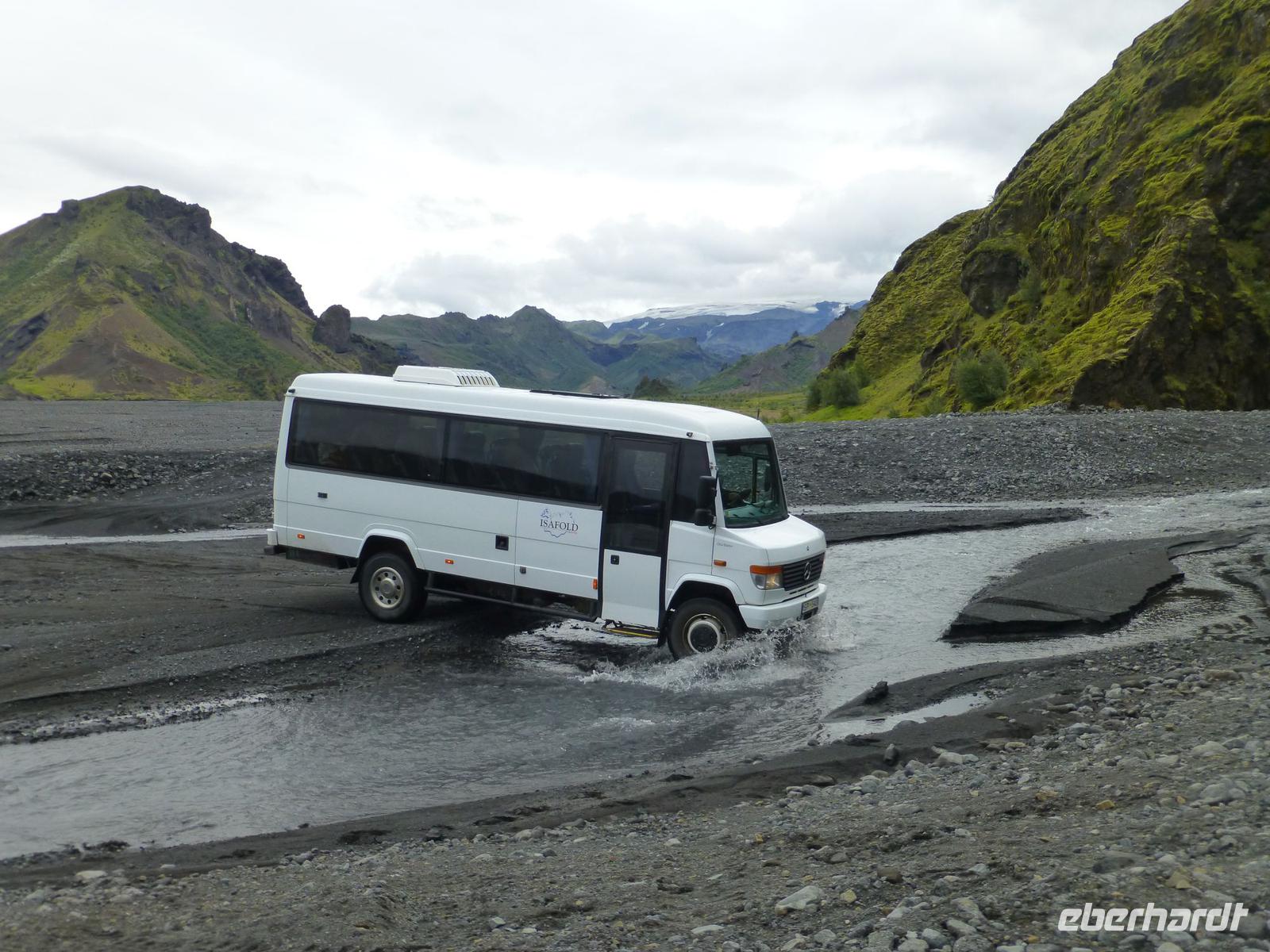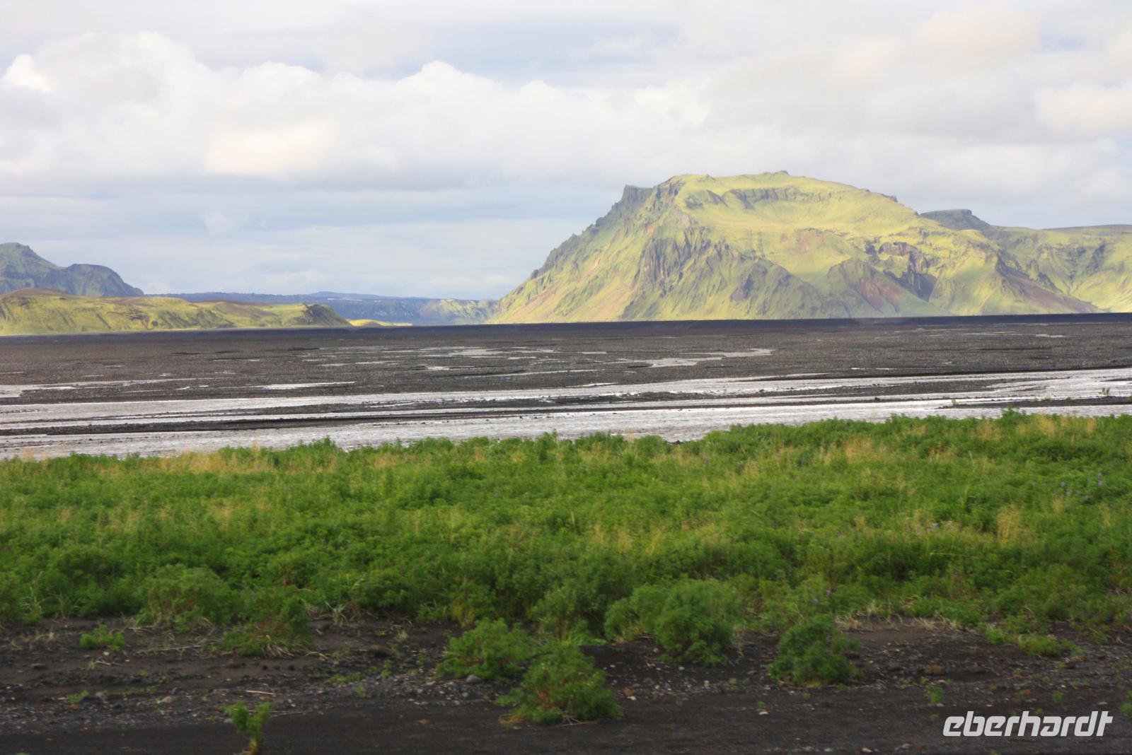 Über eine Schotterstraße ging es dann durch grüne Ebenen ins Gletschertal Thorsmörk, was übersetzt „Thors Wald" bedeutet, also der Wald des alten germanischen Gottes Thor. Das Tal wird flankiert von mächtigen Gletschern, einer davon ist die Gletscherzunge des berühmten Vulkans Eyjafjallajökull, der 2010 den Flugverkehr in ganz Europa zum Stillstand brachte. Einige Fahrtminuten weiter halten wir am Fuße der Bergkette.